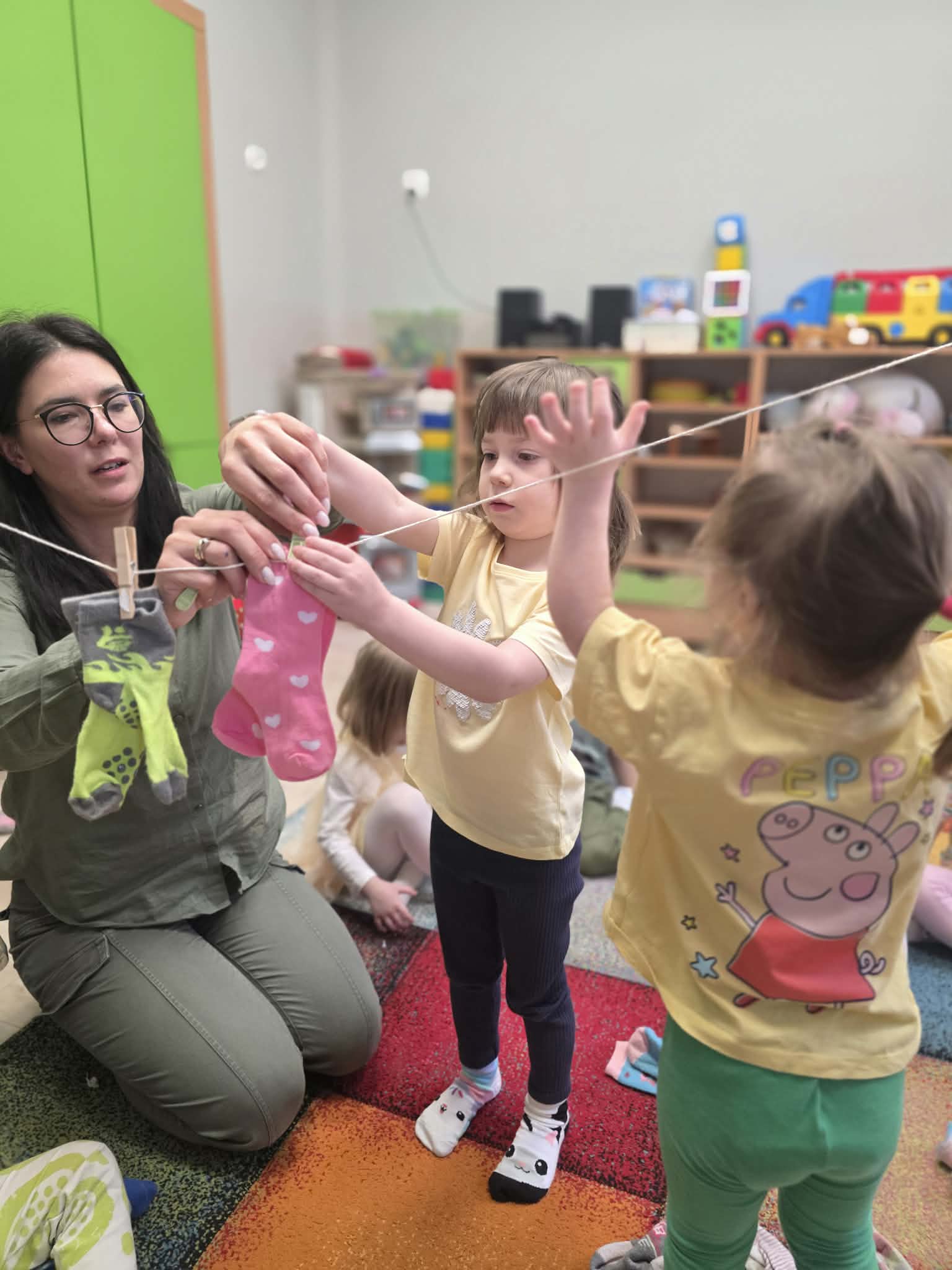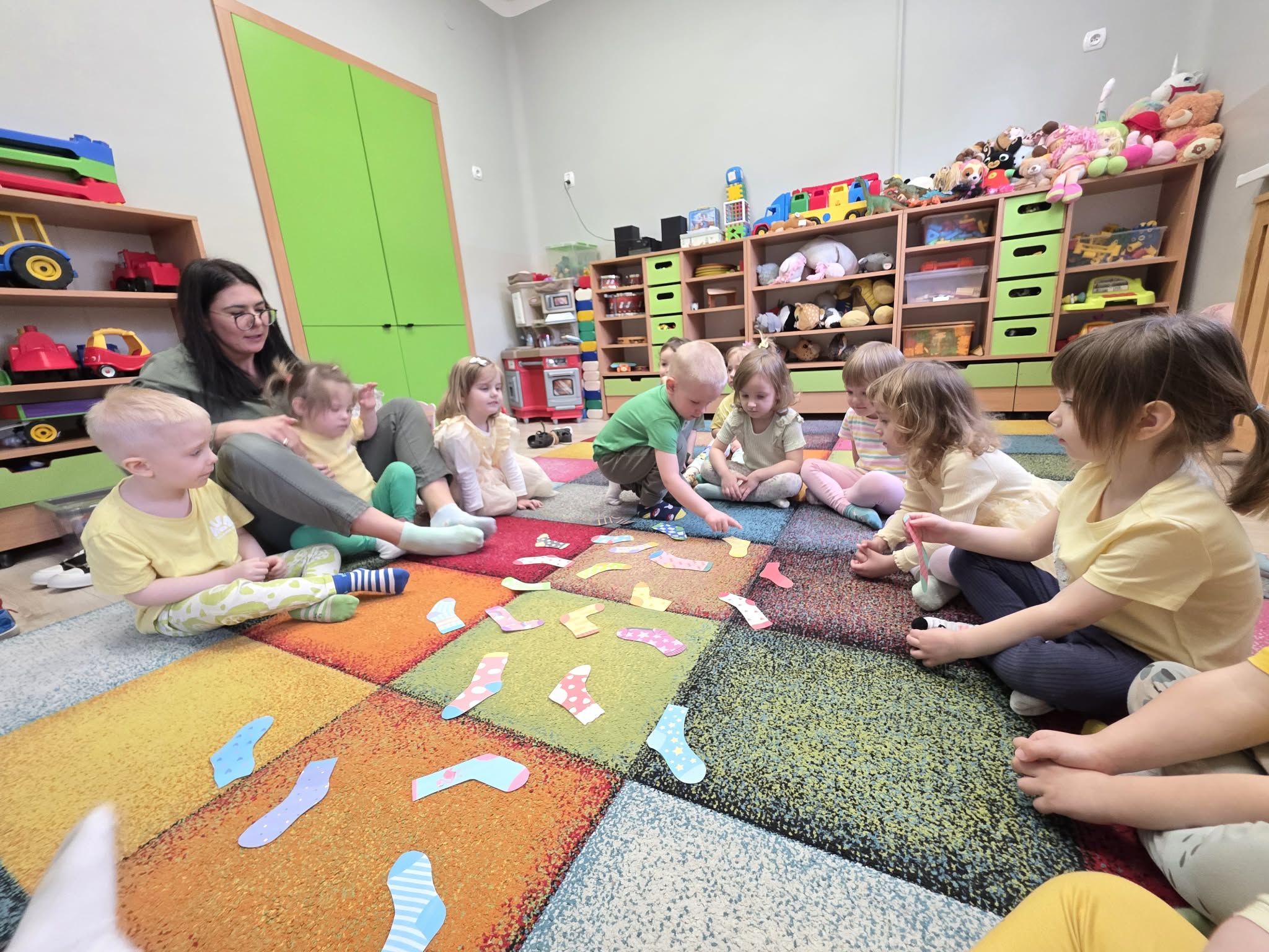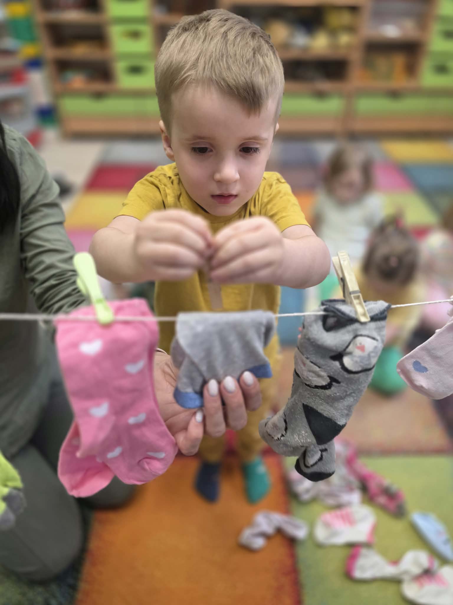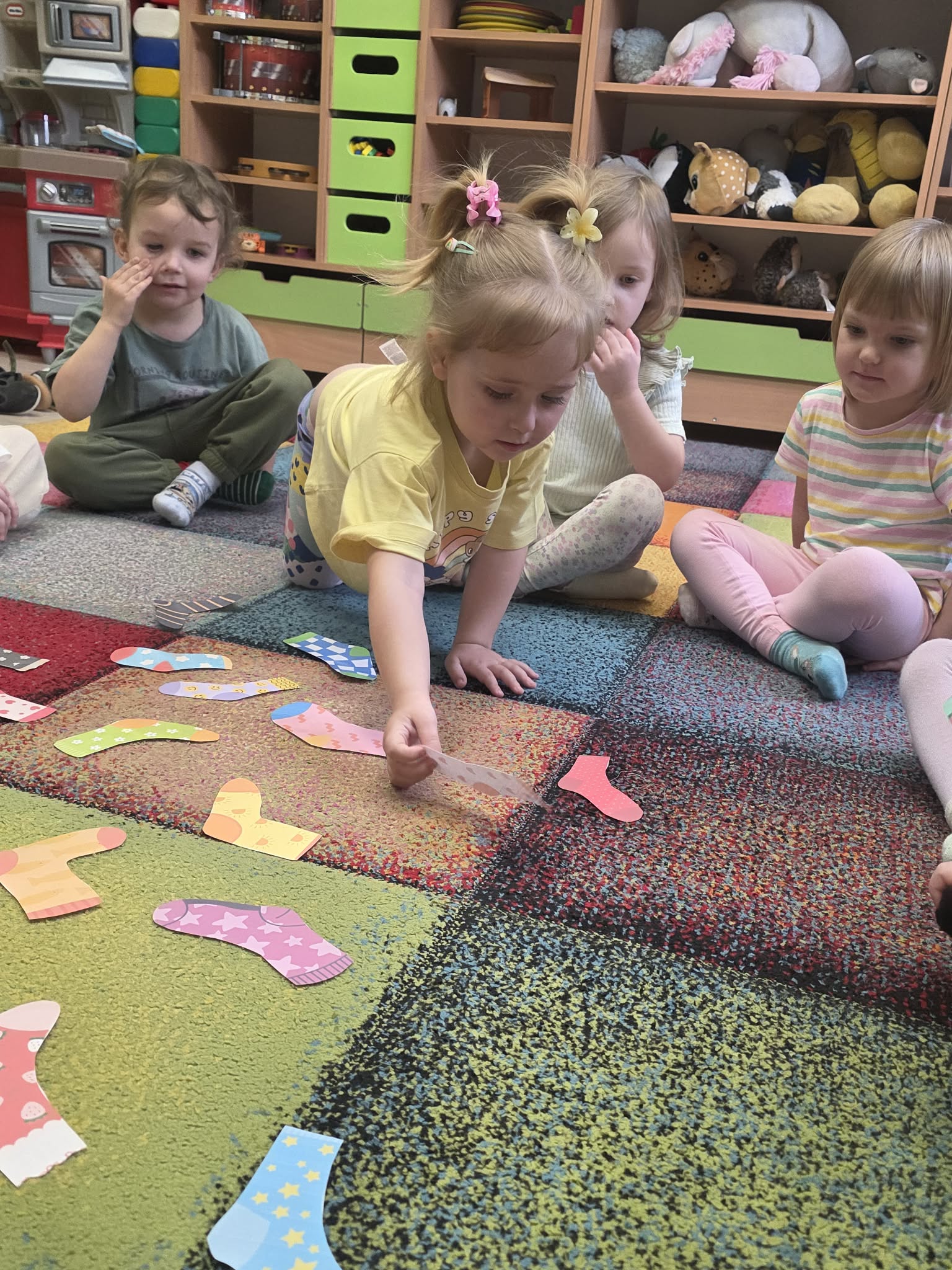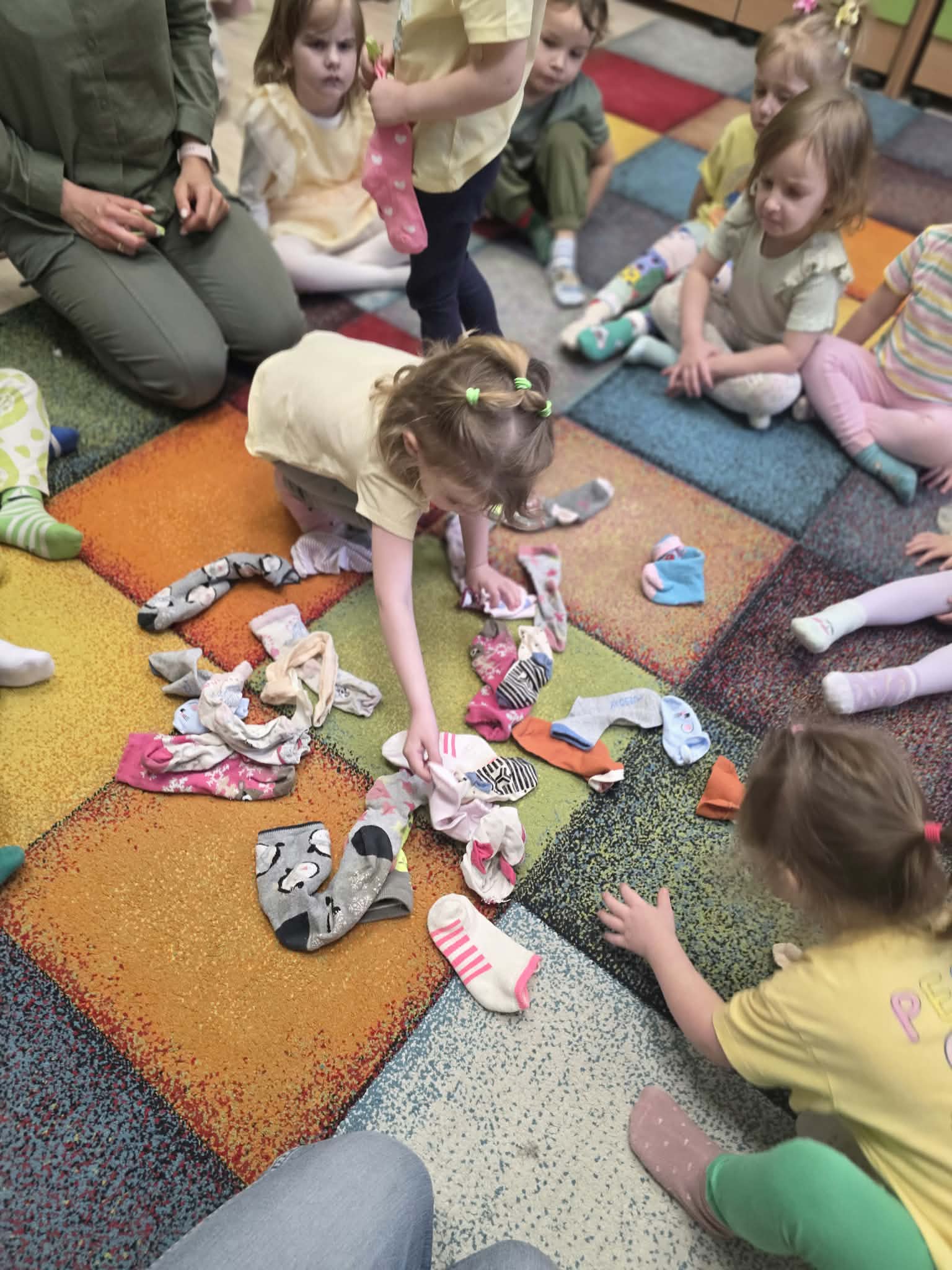 Z tej okazji dzieci wzięły udział w radosnych aktywnościach szukały ukrytych skarpetek, dobierały je w pary i wieszały na sznurku przy pomocy żabek. Na koniec stworzyły piękne, kolorowe prace plastyczne, stemplując skarpetki farbami ![]()