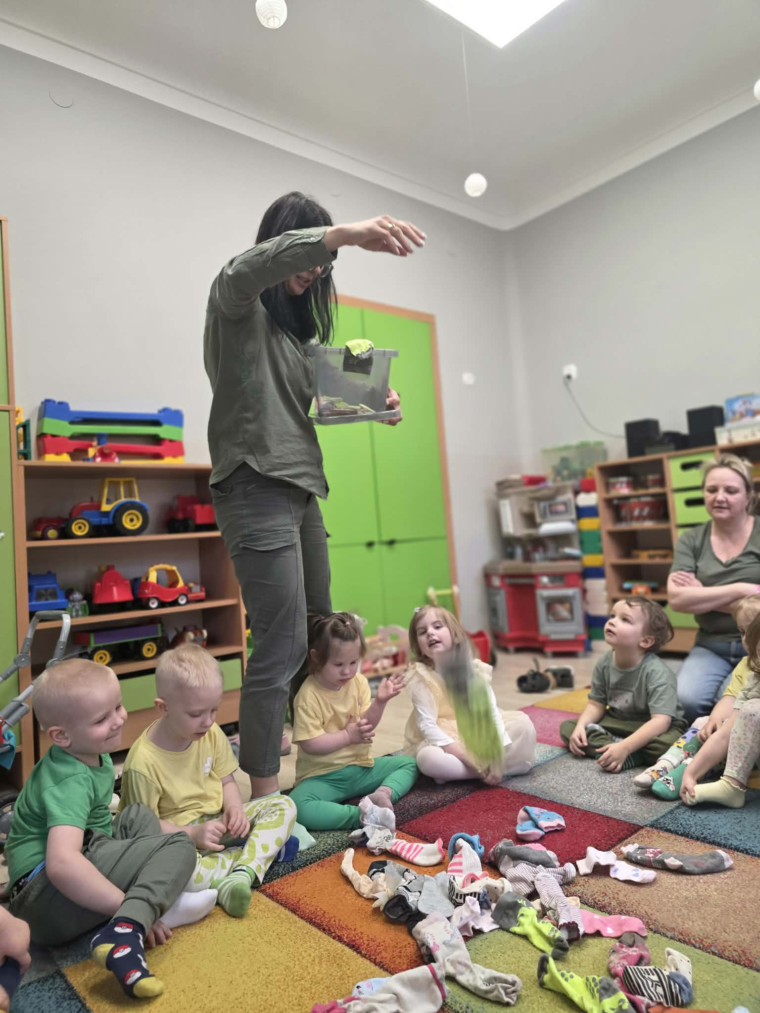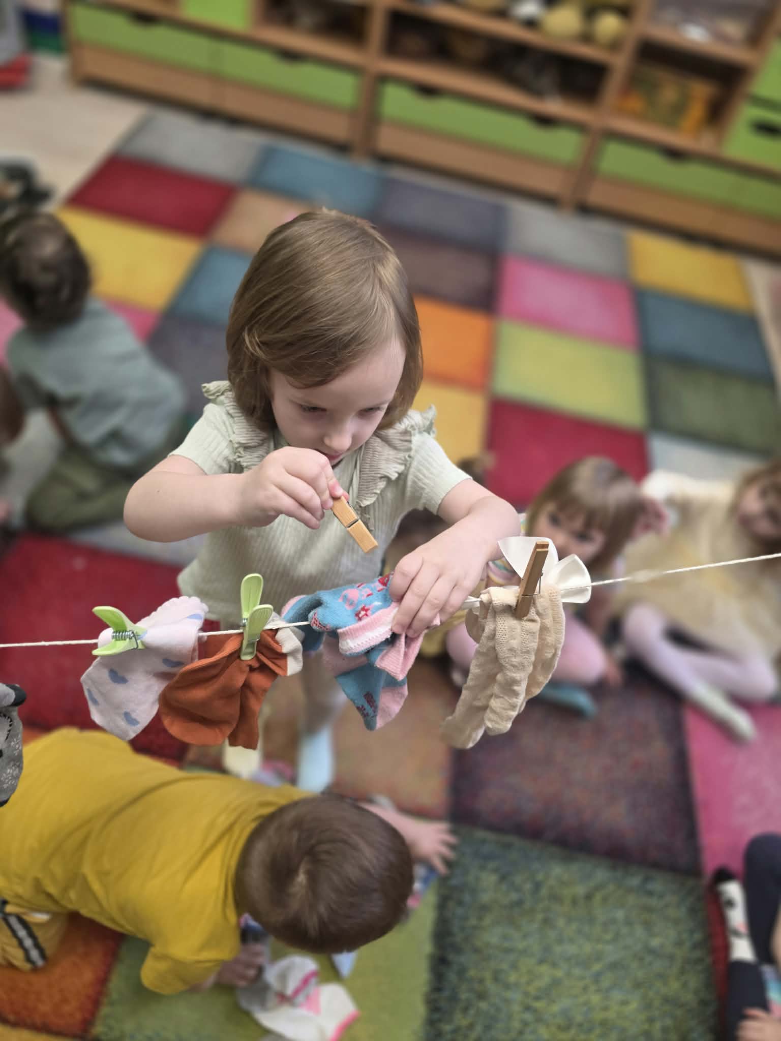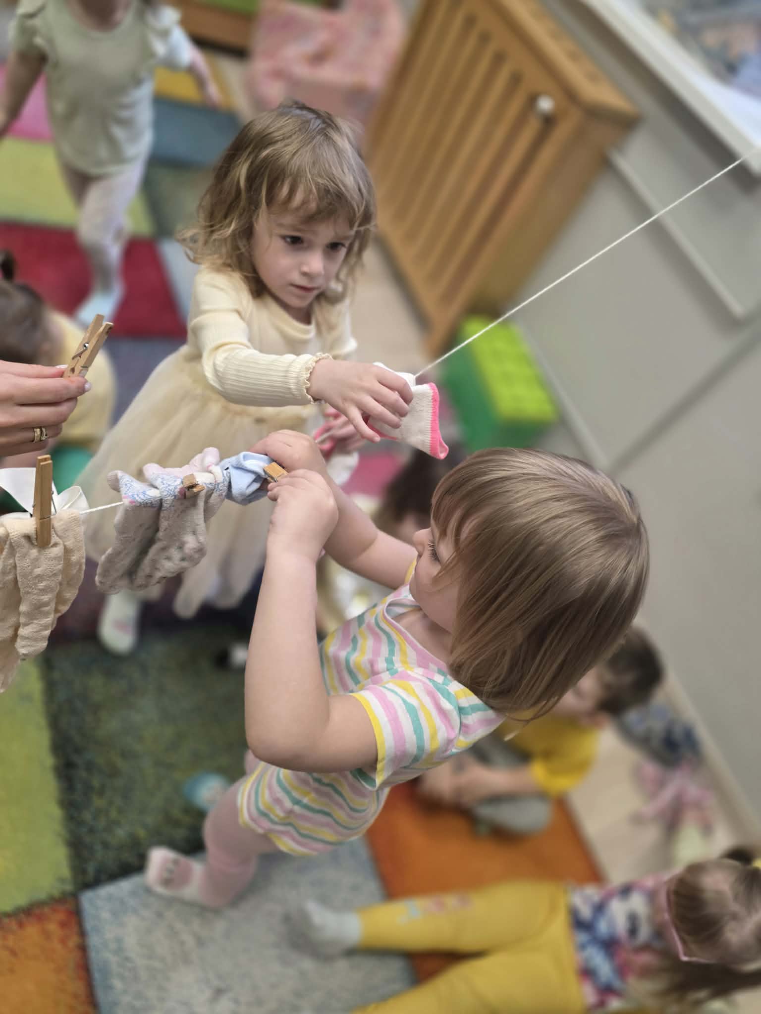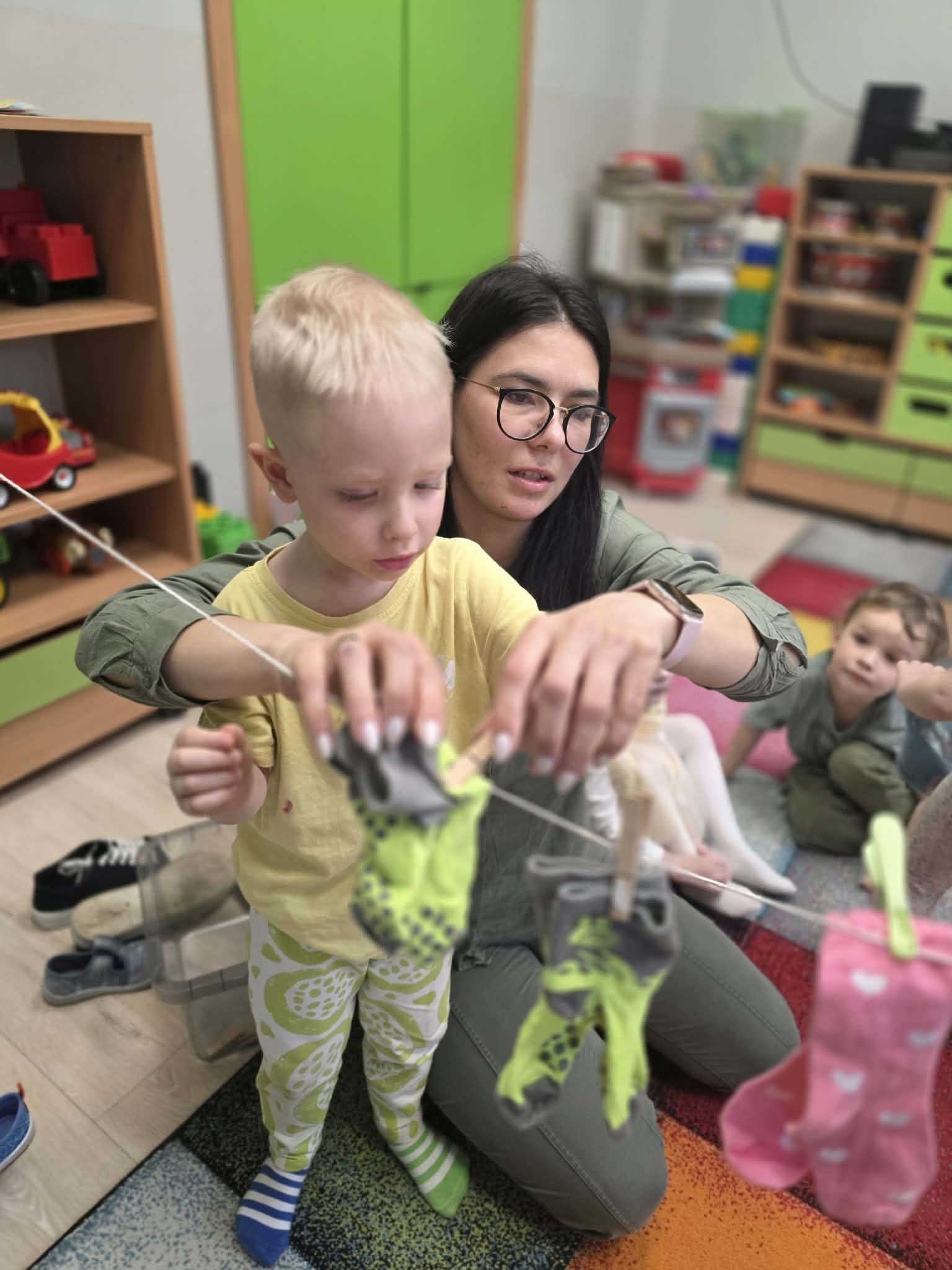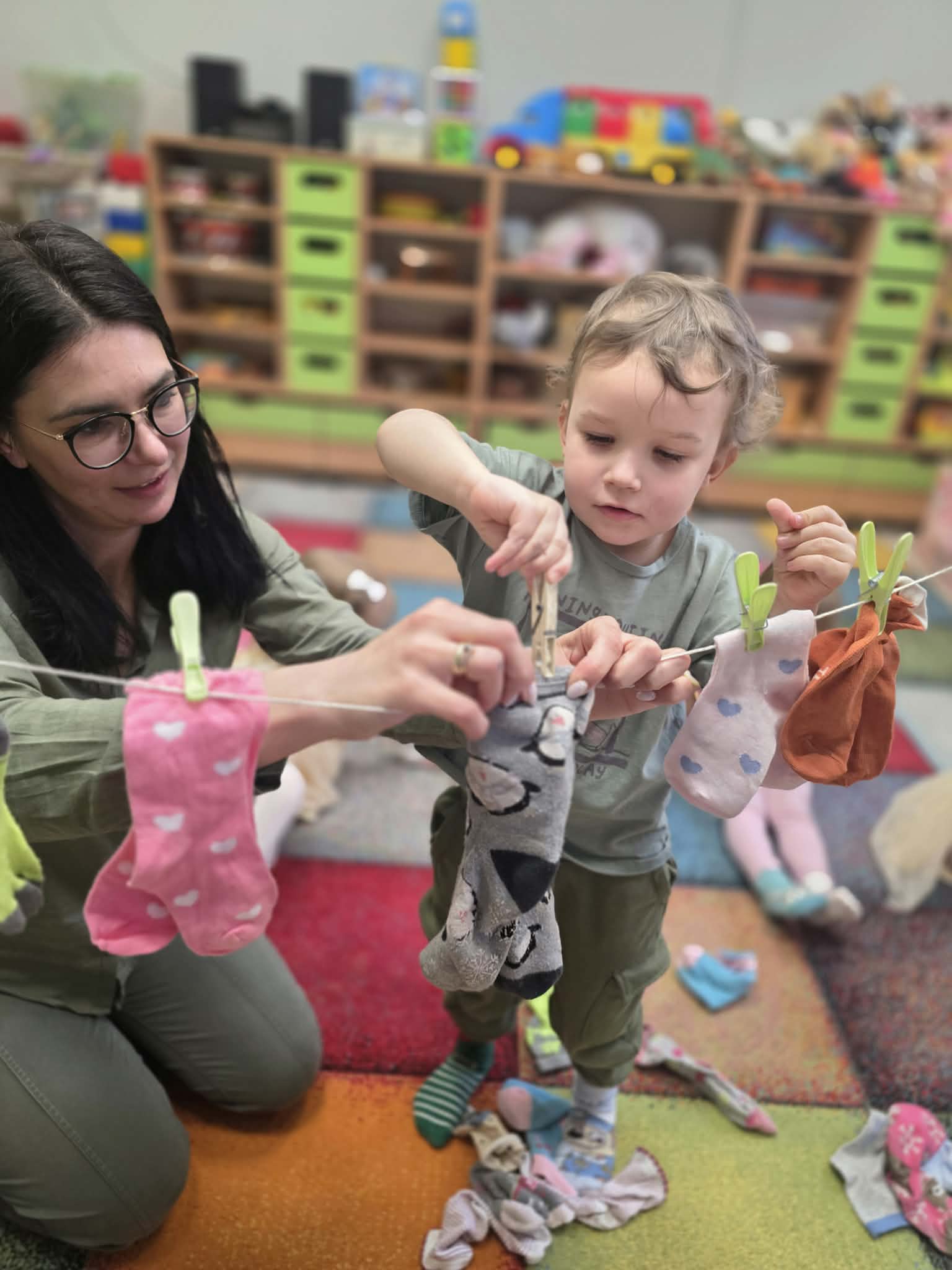 Z tej okazji dzieci wzięły udział w radosnych aktywnościach szukały ukrytych skarpetek, dobierały je w pary i wieszały na sznurku przy pomocy żabek. Na koniec stworzyły piękne, kolorowe prace plastyczne, stemplując skarpetki farbami ![]()