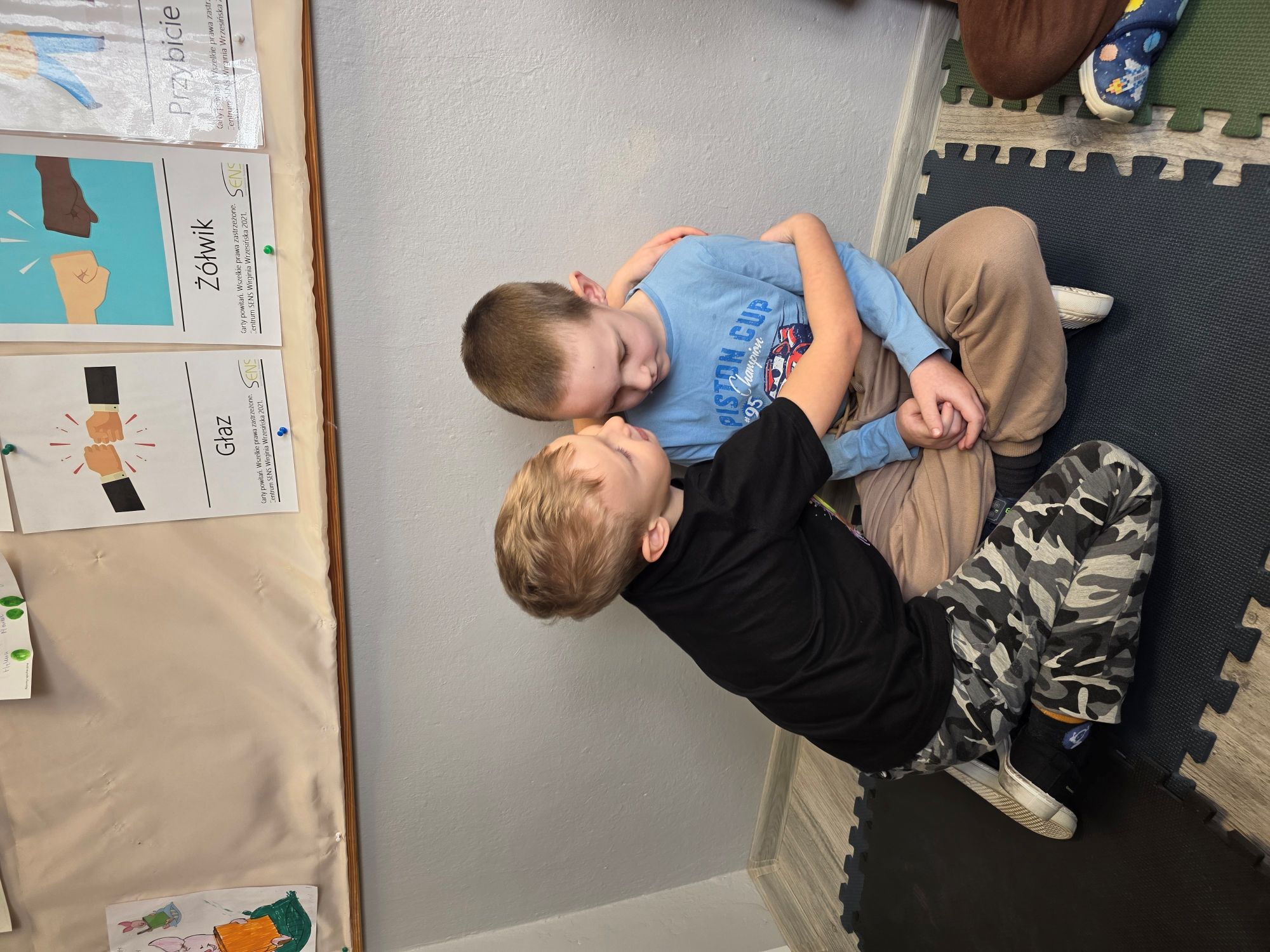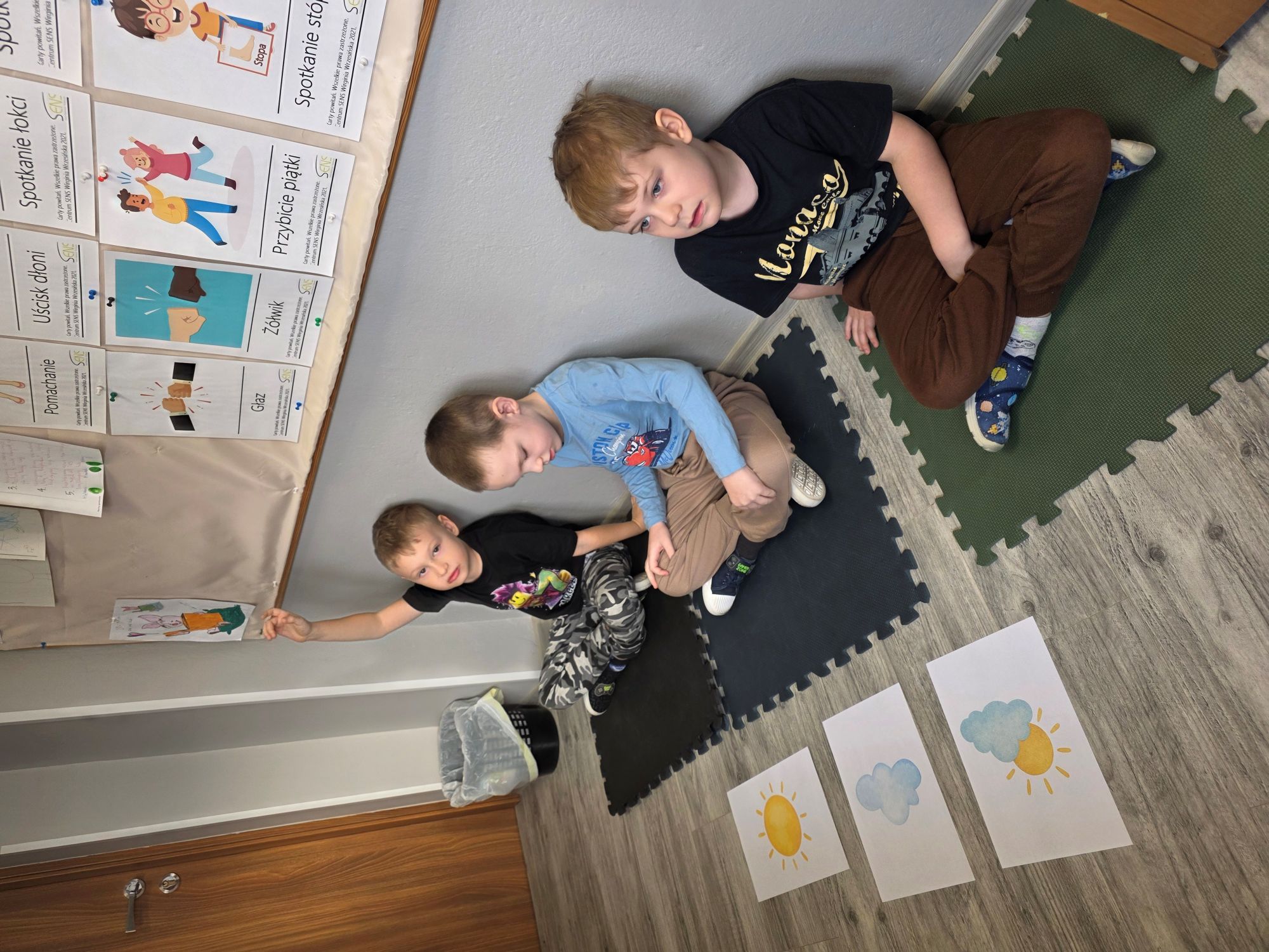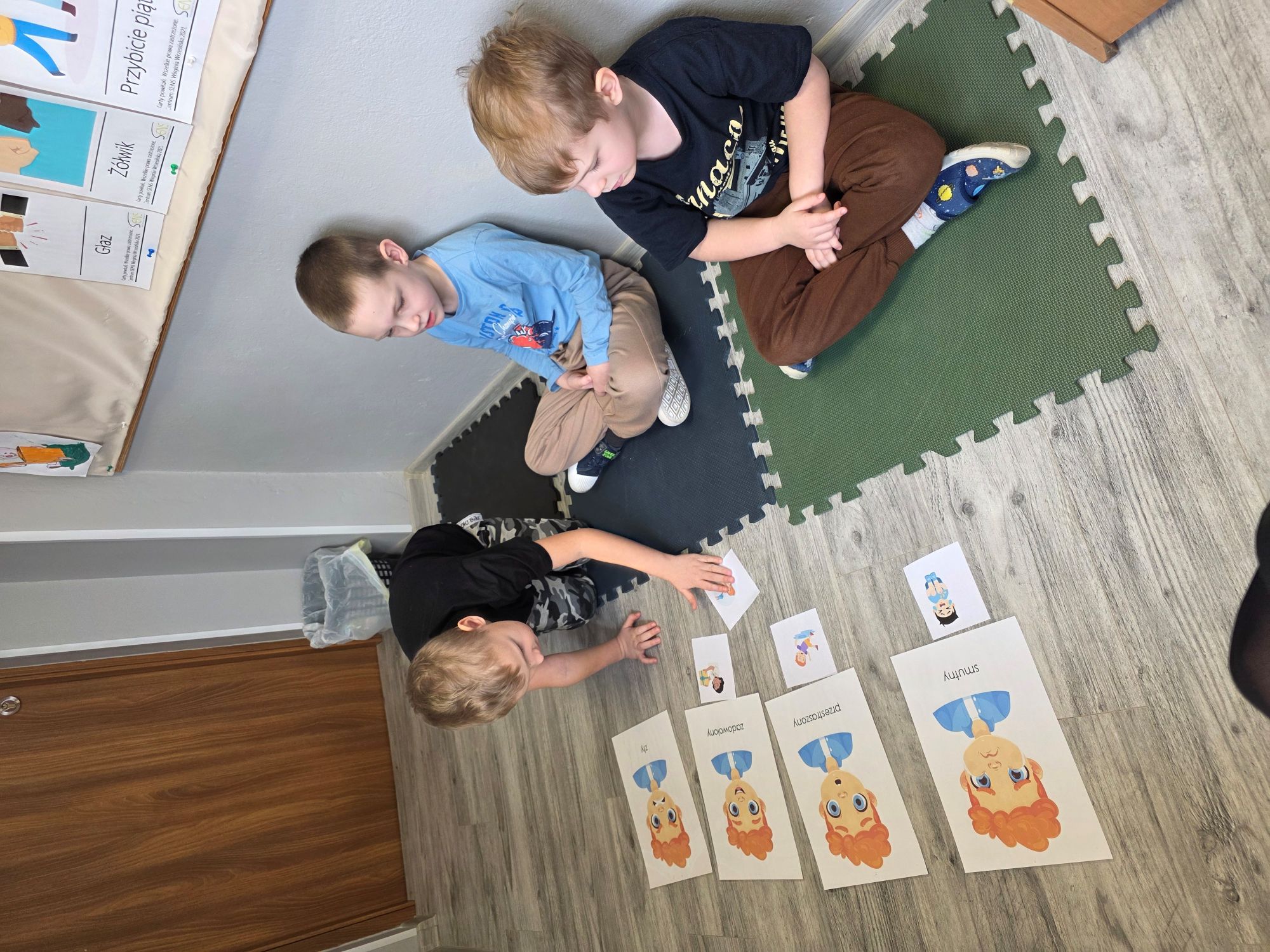 Na dzisiejszych zajęciach TUS, chłopcy rozpoznawali i nazywali podstawowe emocje. Ćwiczono wskazywanie sytuacji wywołujących radość, smutek, analizowanie mimiki twarzy i mowy ciała. Dzieci uczestniczyły w zabawach ruchowych, pracowały z bajką terapeutyczną oraz segregowały obrazki z różnymi scenkami.