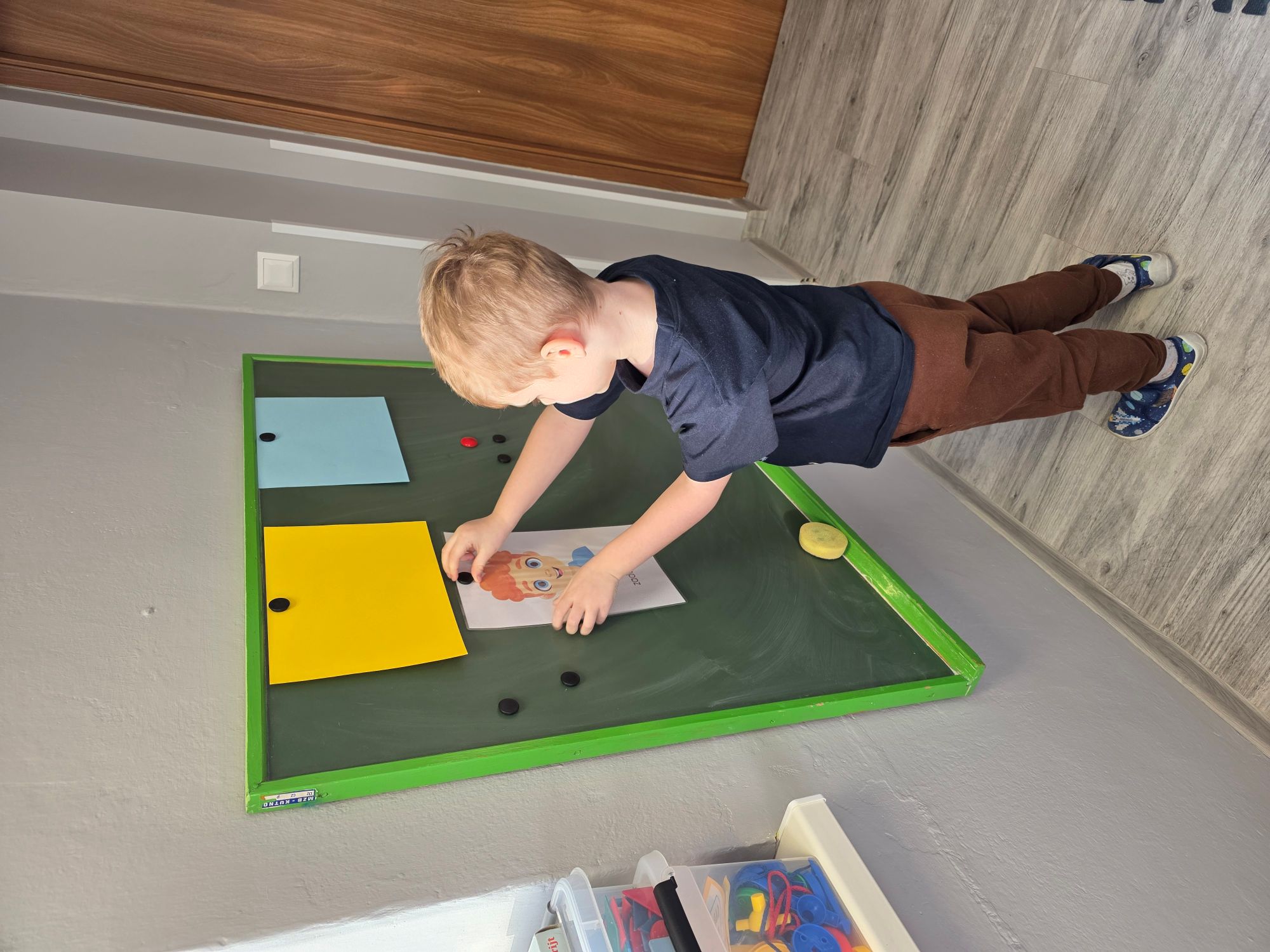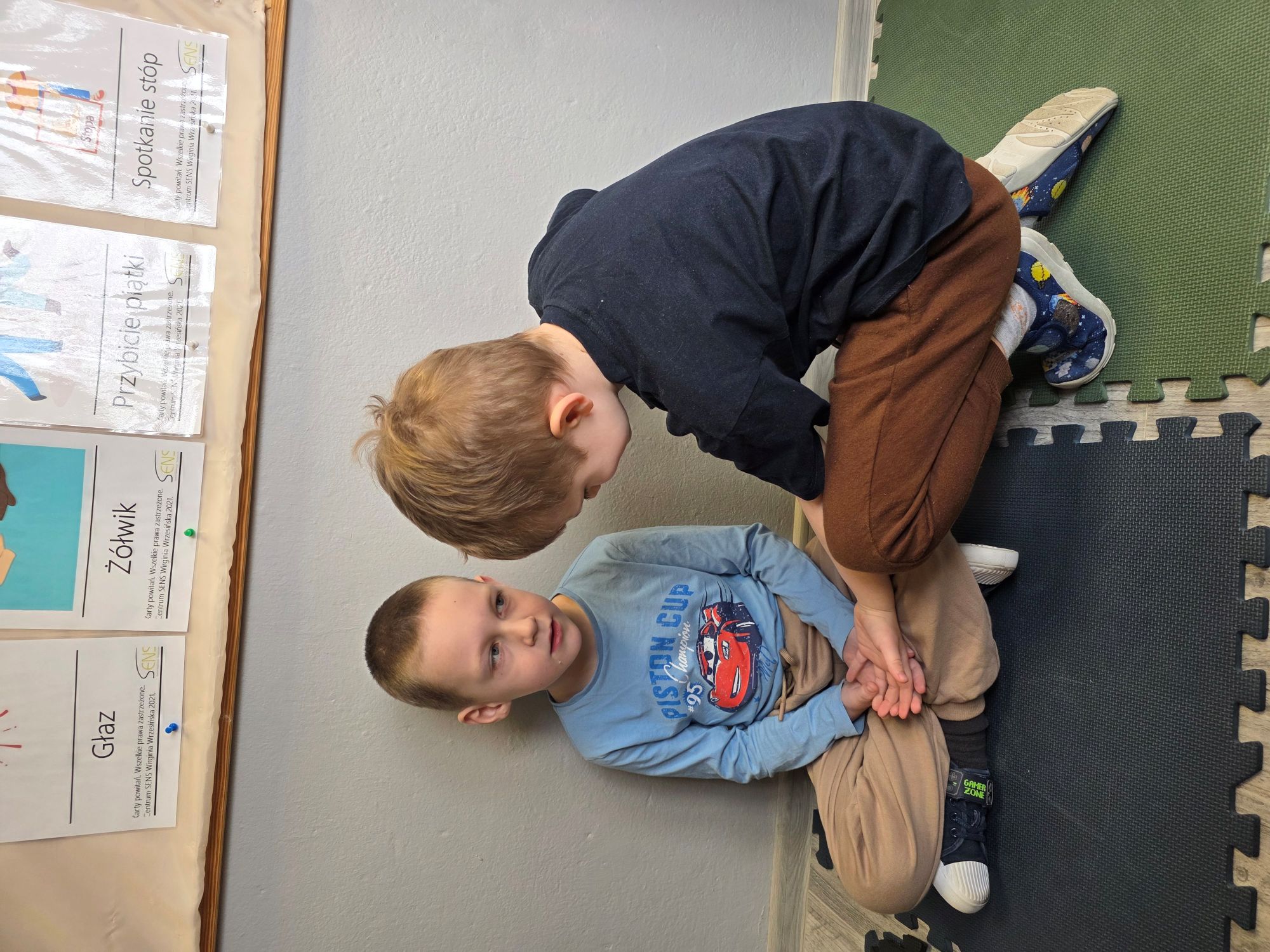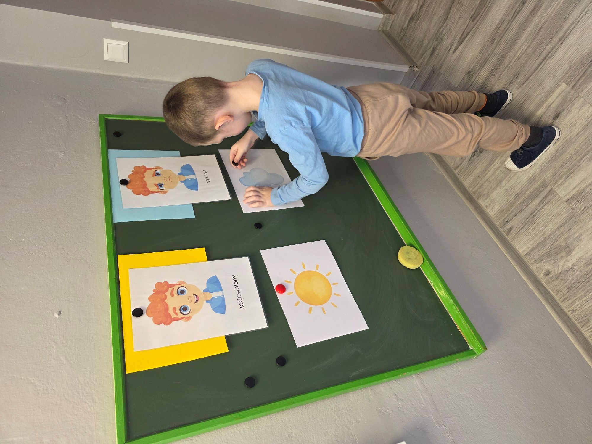 Na dzisiejszych zajęciach TUS, chłopcy rozpoznawali i nazywali podstawowe emocje. Ćwiczono wskazywanie sytuacji wywołujących radość, smutek, analizowanie mimiki twarzy i mowy ciała. Dzieci uczestniczyły w zabawach ruchowych, pracowały z bajką terapeutyczną oraz segregowały obrazki z różnymi scenkami.