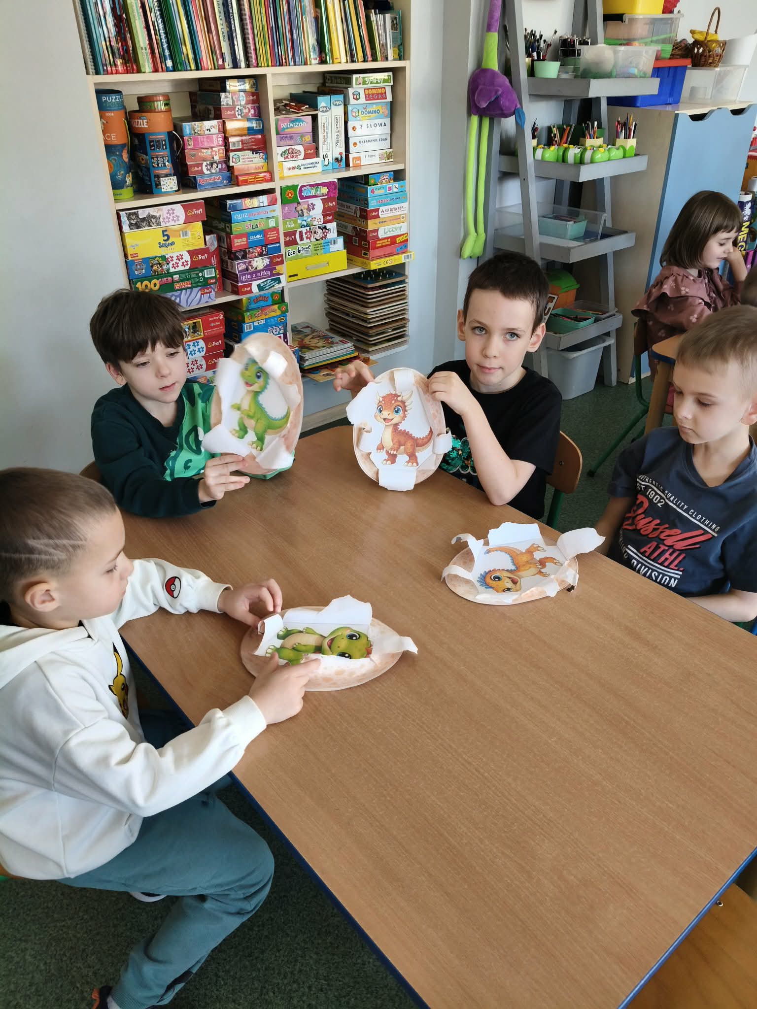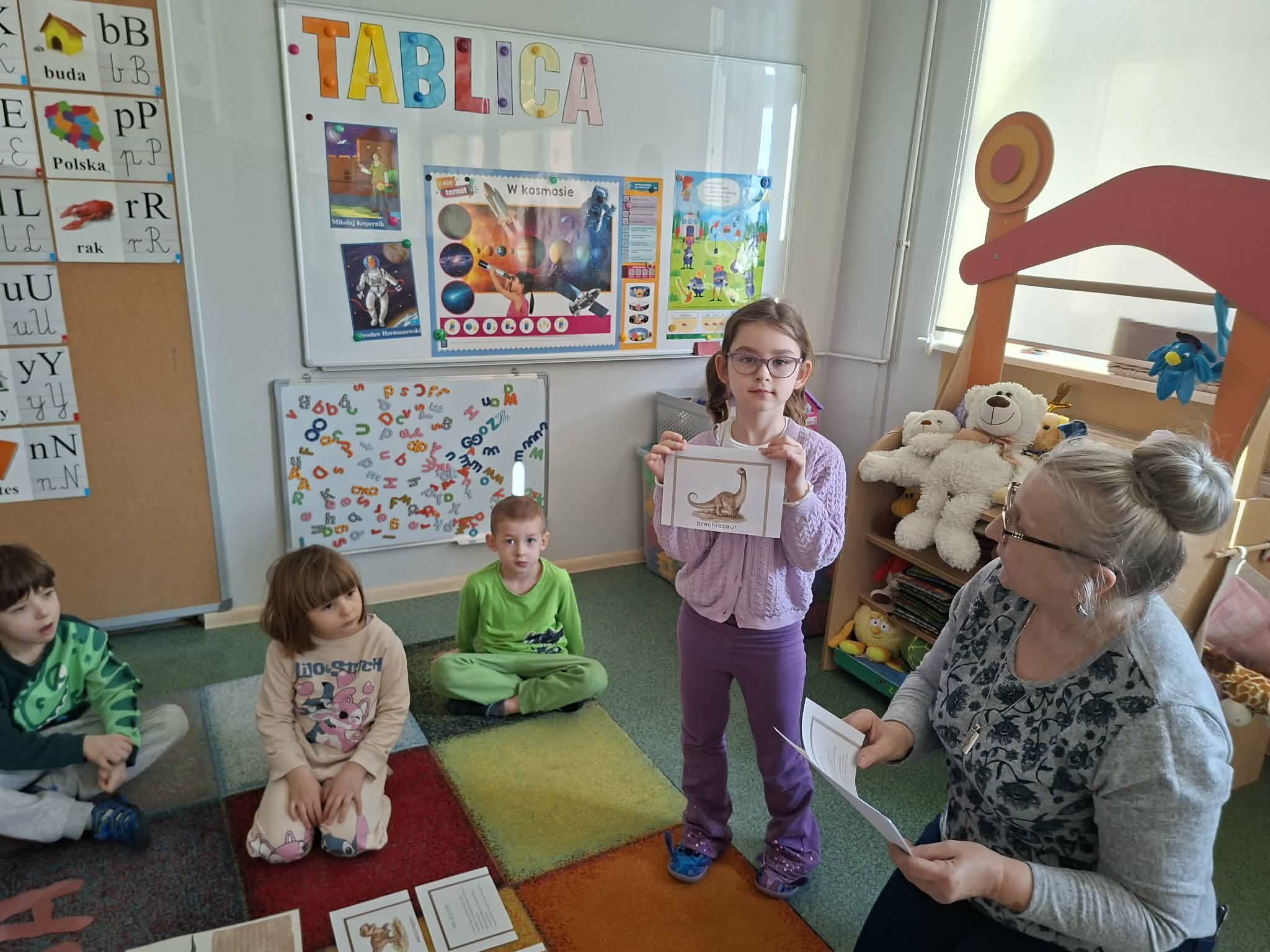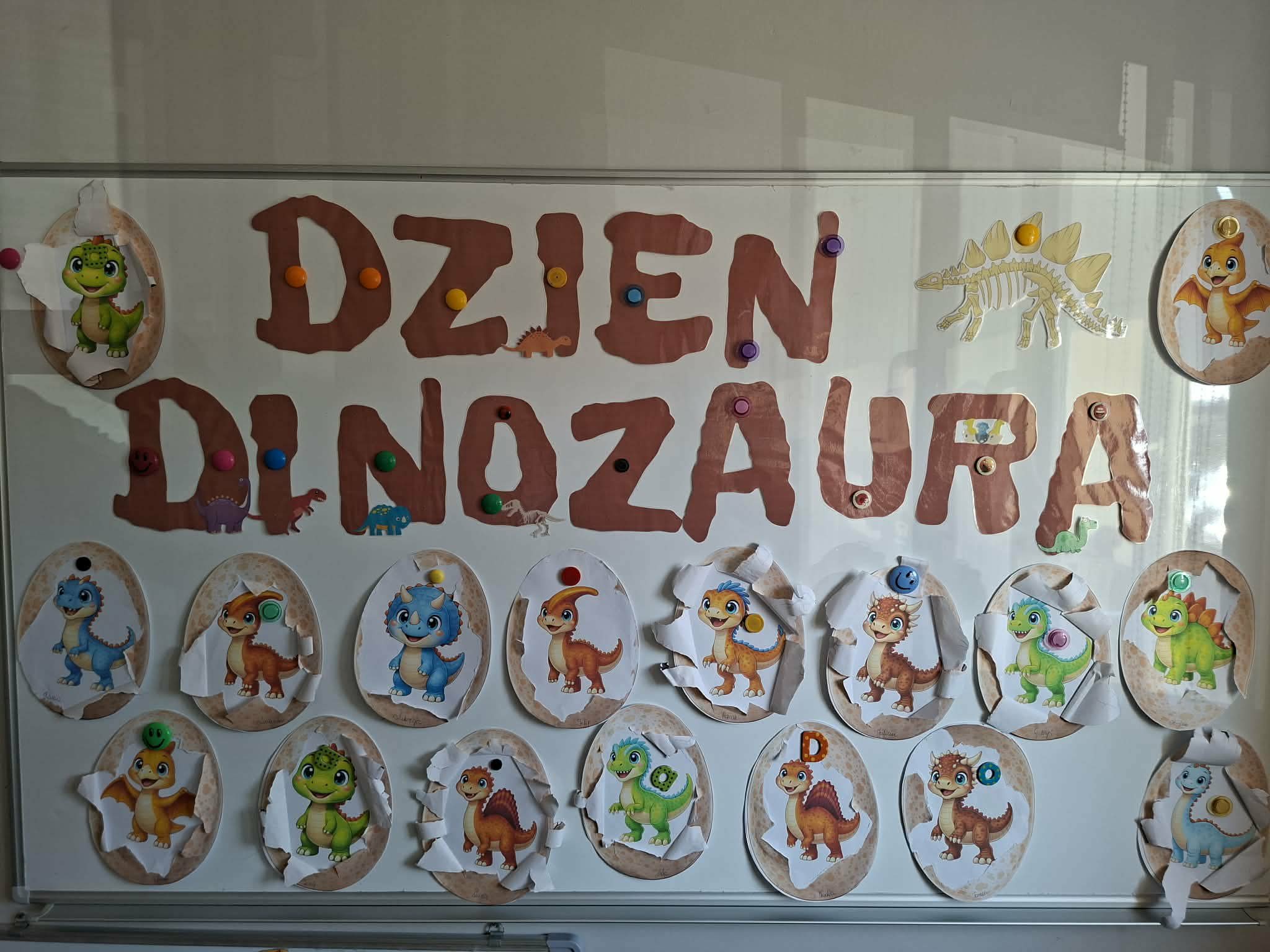 W dniu dzisiejszym obchodziliśmy Dzień Dinozaura. Dzieci przypomniały sobie nazwy niektórych dinozaurów oraz to jak wyglądały. Dowiedziały się jak żyły i co spowodowało, że wyginęły. Historia tych ciągle jeszcze odkrywanych stwożeń jest niezwykle ciekawa. Dzieci z chęcią uczestniczyły w tych zajęciach. Na zakończenie każde dziecko odkryło własnego dinozaura:-)
