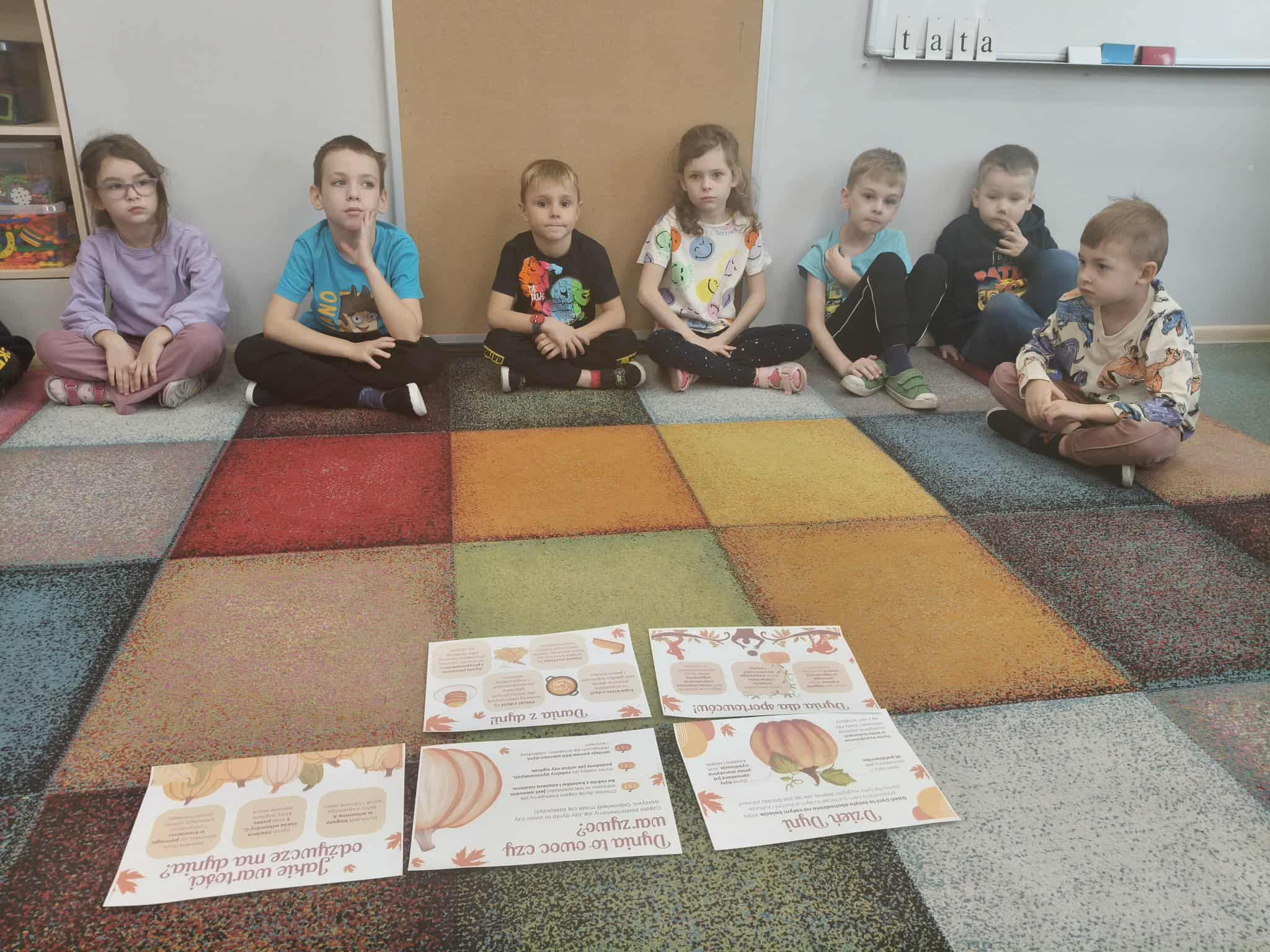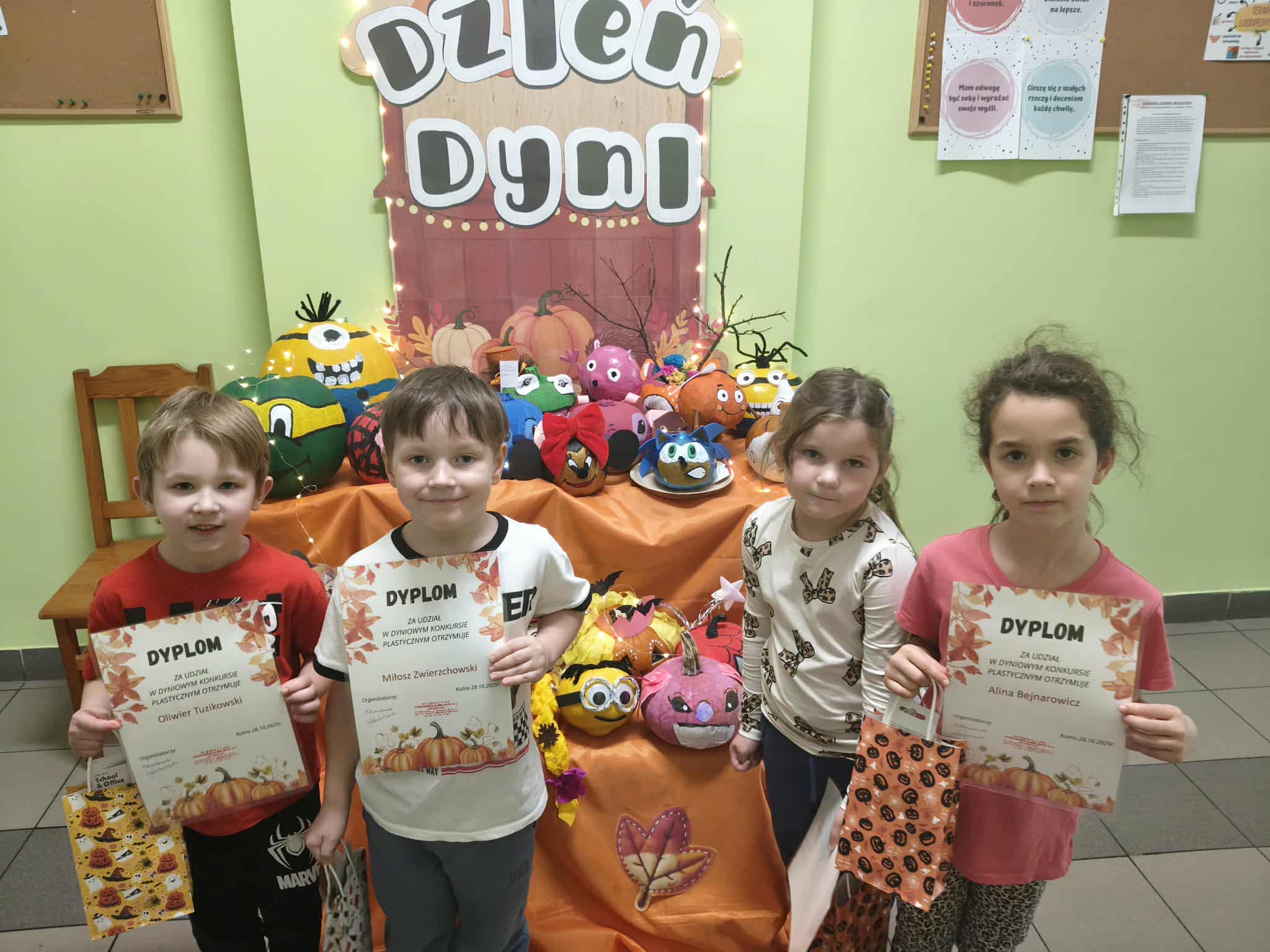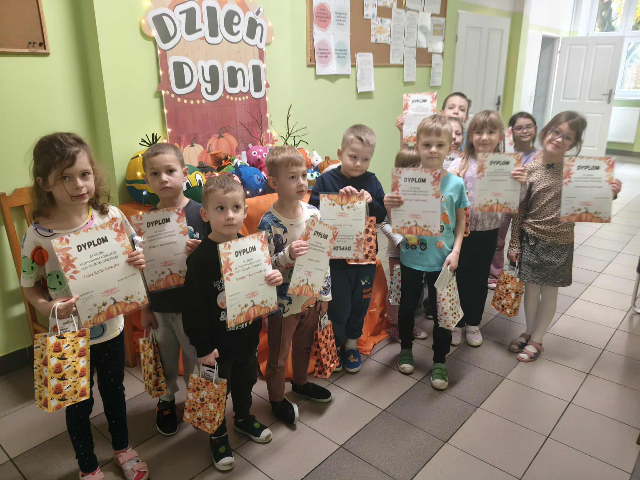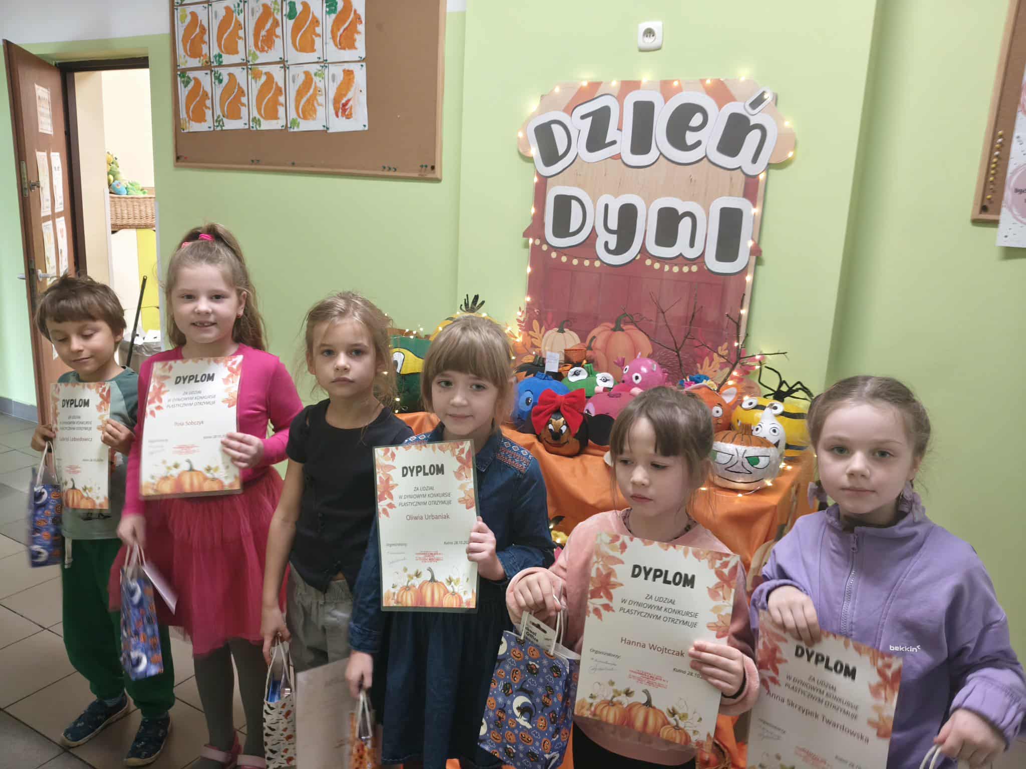 W dniu dzisiejszym obchodziliśmy w naszej grupie święto dyni. Dzieci dowiedziały się różnych ciekawostek na temat tej rośliny. Poznały jej wartości odżywcze oraz potrawy jakie można przygotować z dyni. Wspólnie rozwiązywaliśmy proste zadania matematyczne i obliczenia pieniężne, w "Dyniowej Kawiarence". Podsumowaniem Dnia Dyni było rozstrzygnięcie konkursu "Bajkowa Dynia", w którym więły udział dzieci z najstarszych grup przedszkolnych. Wszyscy uczestnicy konkursu otrzymali dyplomy oraz upominki.