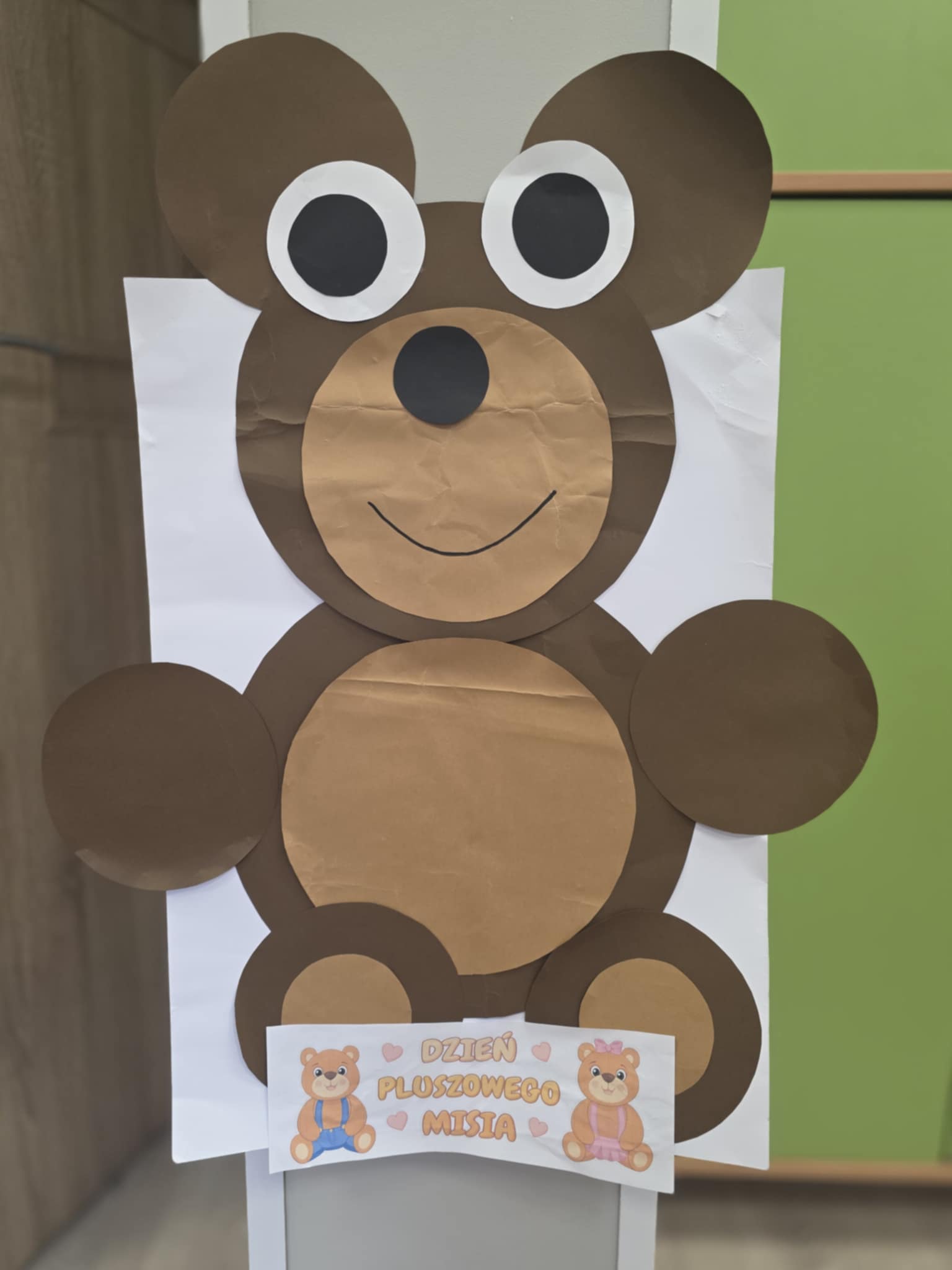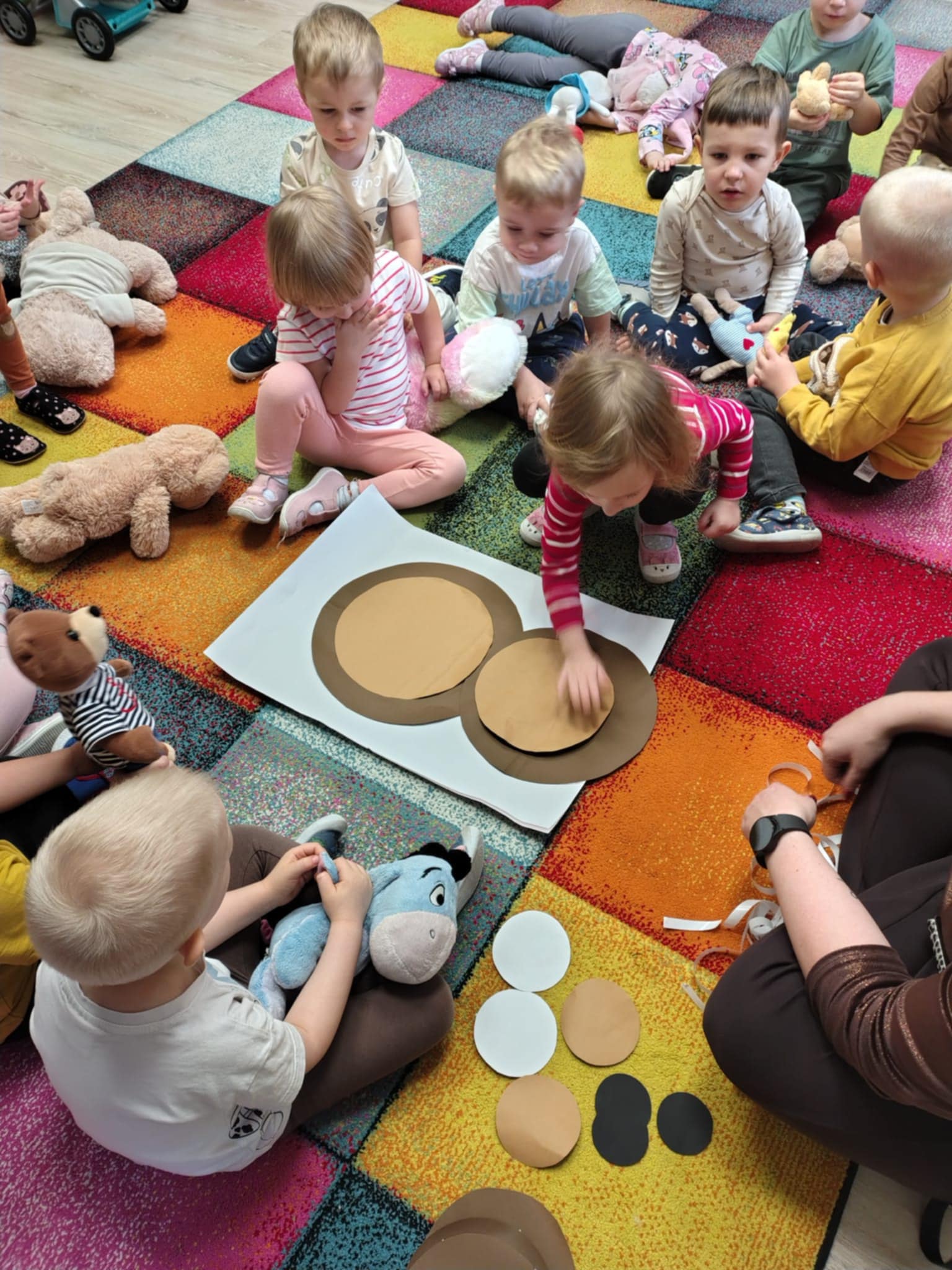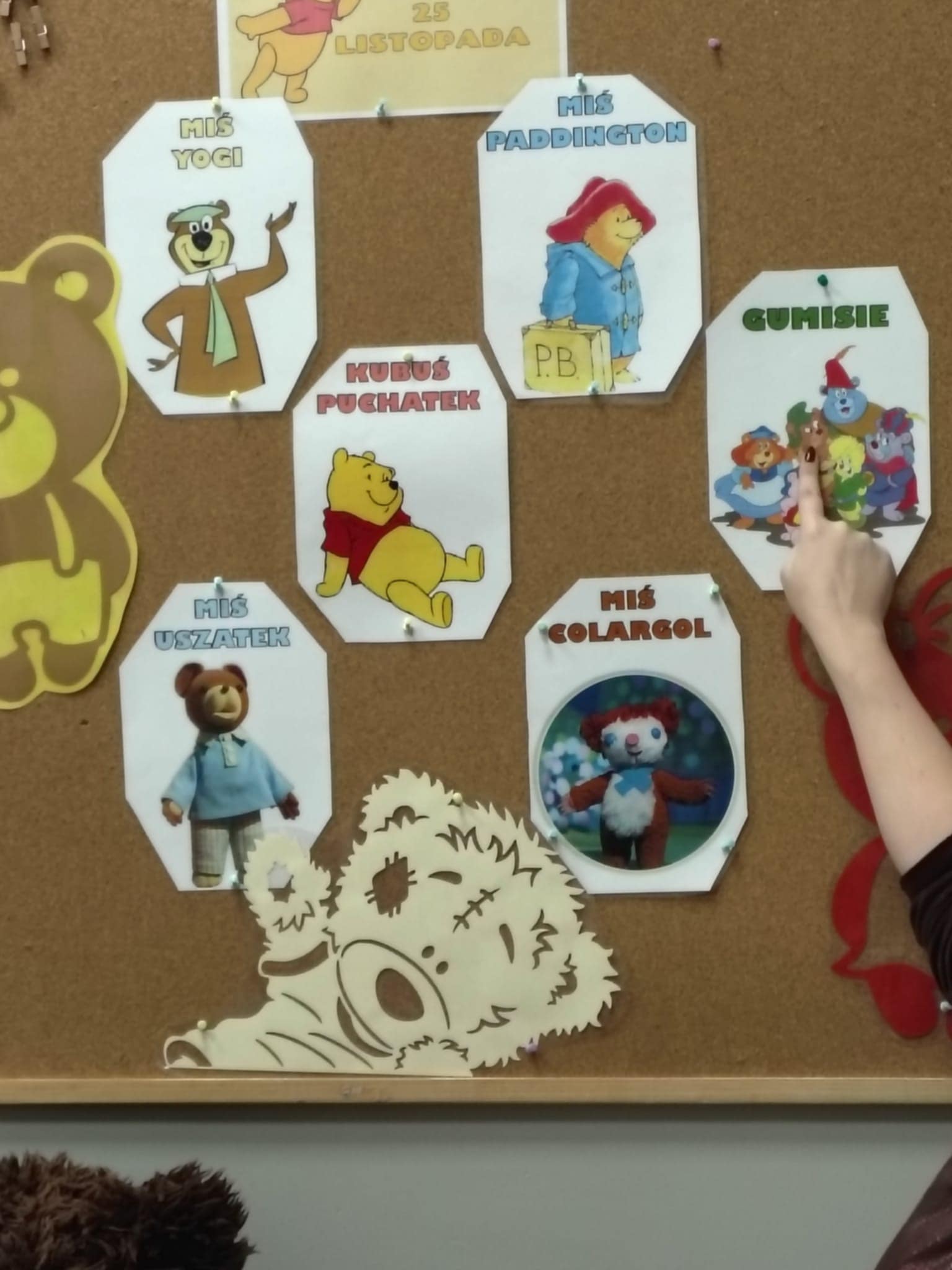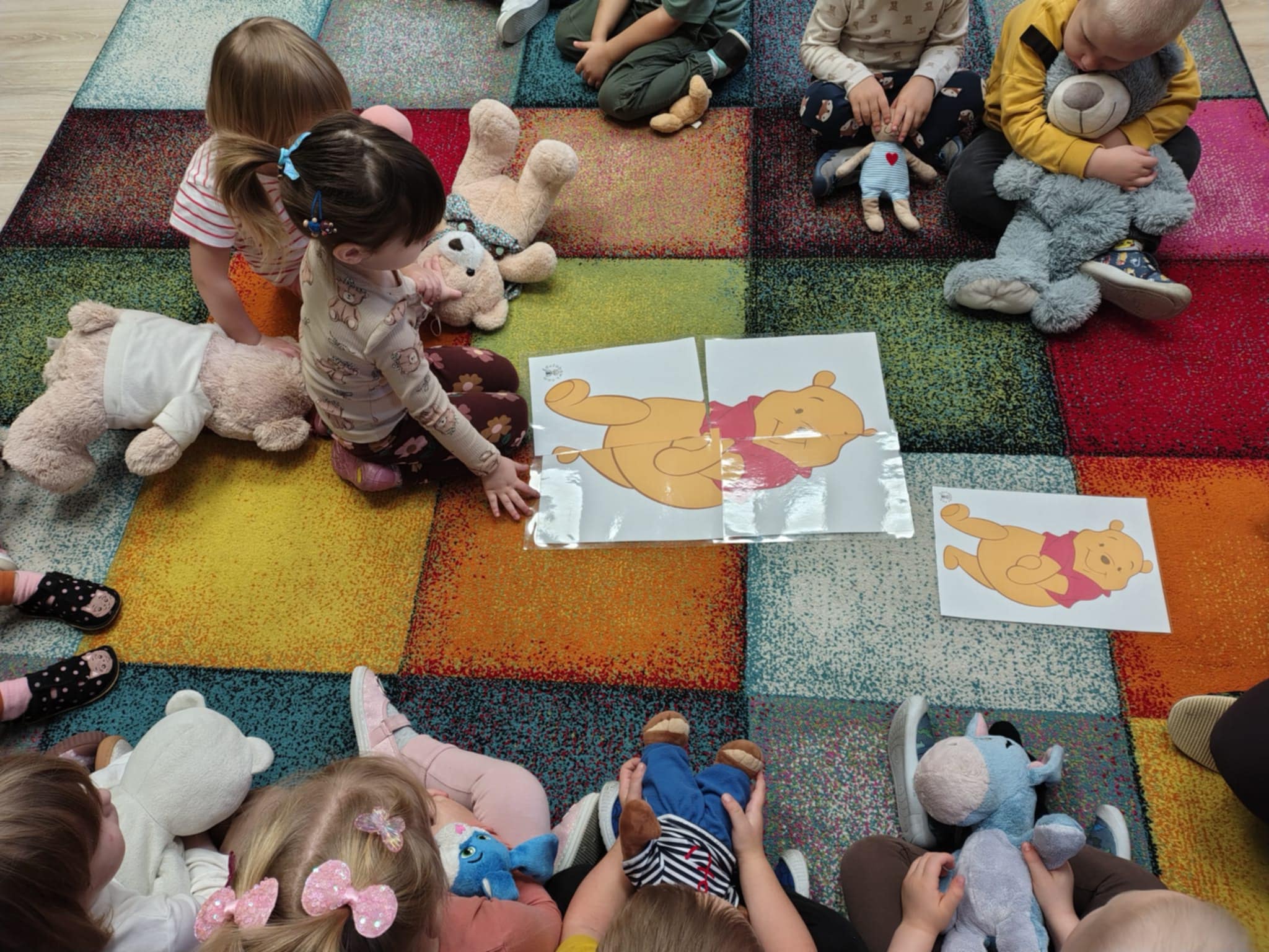 Dzieci wysłuchały wesołej historyjki o misiu, przytulając swoich pluszowych przyjaciół. Układały puzzle z Kubusiem Puchatkiem, Misiem Paddingtonem, Misiem Yogim i innymi ulubionymi bohaterami. Nie zabrakło też „misiowych minek”, czyli zabaw logopedycznych, które wywołały mnóstwo śmiechu. Wspólnie stworzyliśmy pracę plastyczną „Mój miś z kółek”, a na koniec wszyscy wyruszyli na parkiet, aby zatańczyć taniec ze swoim przyjacielem misiem. To był dzień pełen ciepła, przytulasów i misiowej radości. ![]()