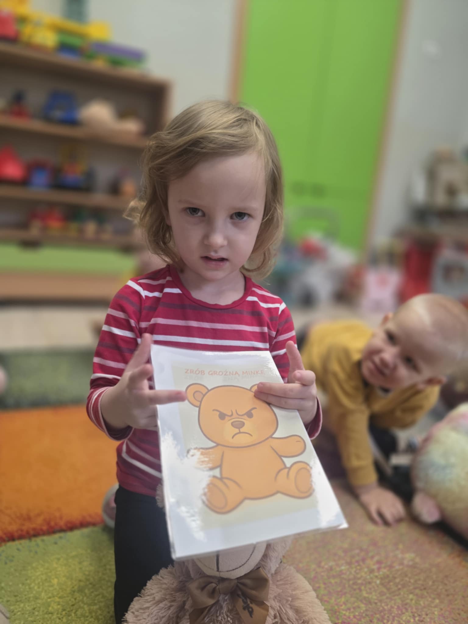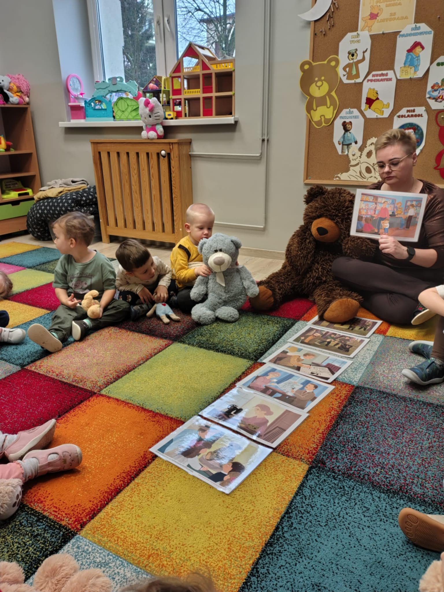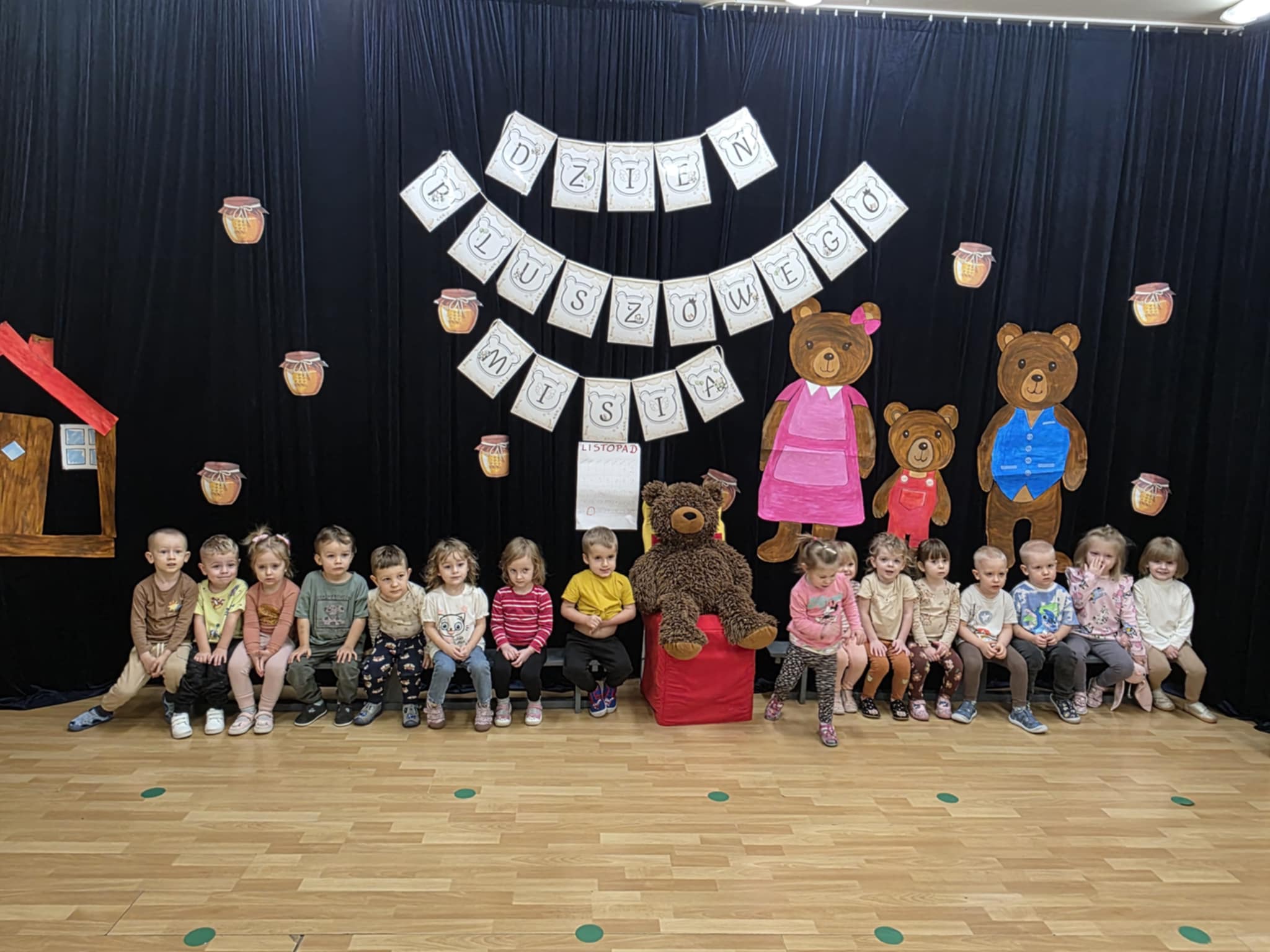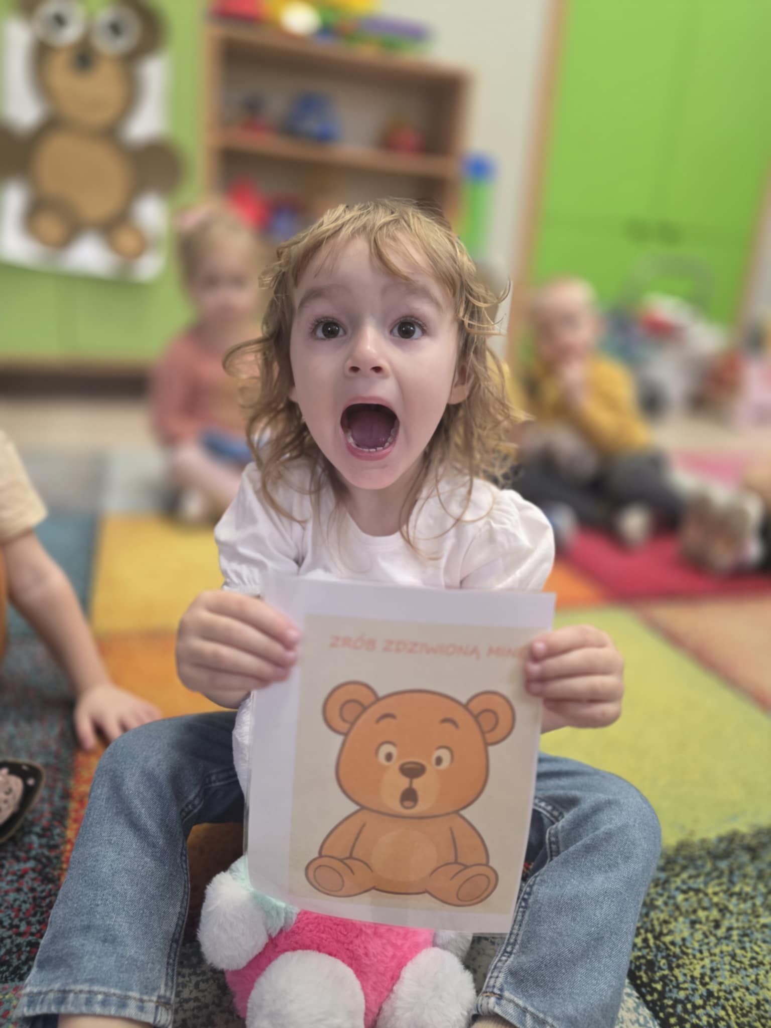 Dzieci wysłuchały wesołej historyjki o misiu, przytulając swoich pluszowych przyjaciół. Układały puzzle z Kubusiem Puchatkiem, Misiem Paddingtonem, Misiem Yogim i innymi ulubionymi bohaterami. Nie zabrakło też „misiowych minek”, czyli zabaw logopedycznych, które wywołały mnóstwo śmiechu. Wspólnie stworzyliśmy pracę plastyczną „Mój miś z kółek”, a na koniec wszyscy wyruszyli na parkiet, aby zatańczyć taniec ze swoim przyjacielem misiem. To był dzień pełen ciepła, przytulasów i misiowej radości. ![]()