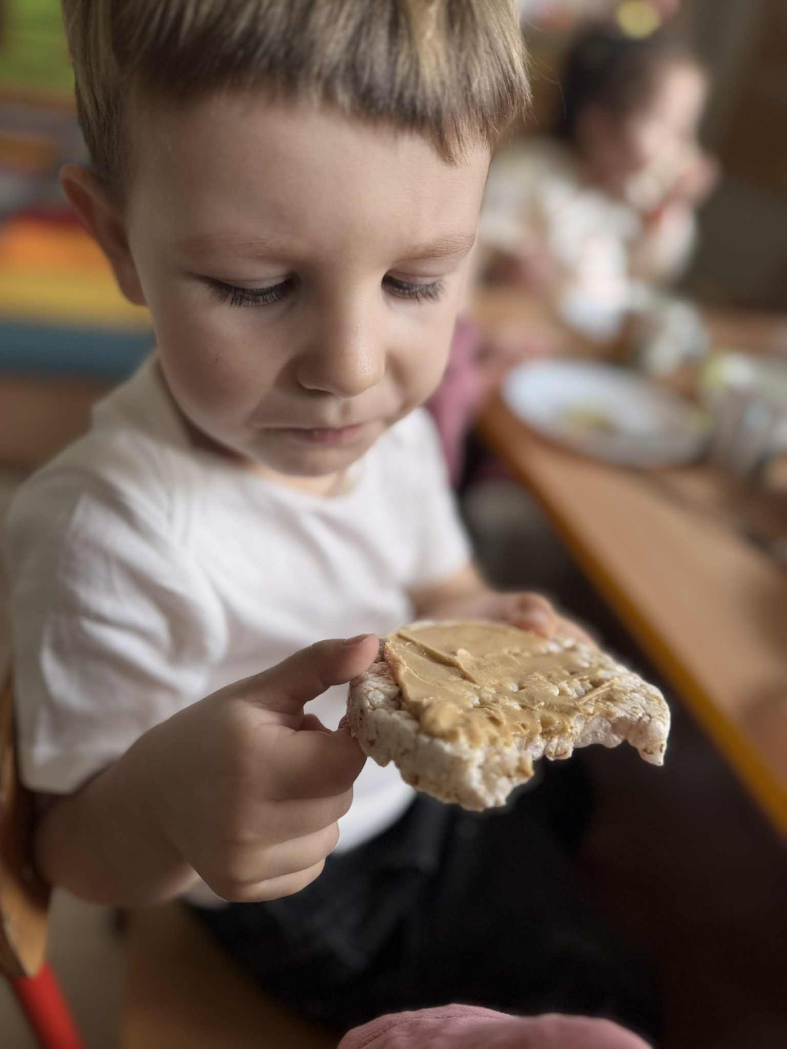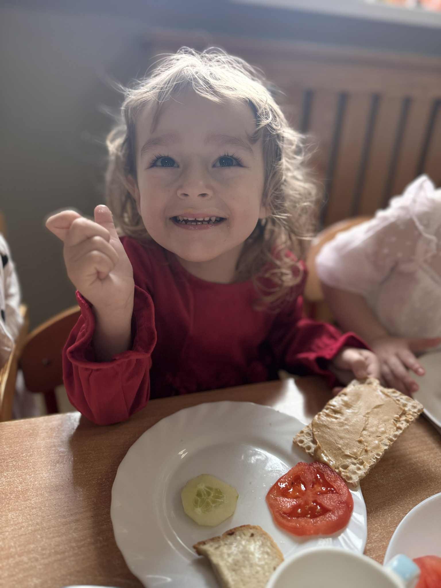 Dzień Zdrowego Śniadania w naszym przedszkolu był pełen radości, smaków i kolorów. Dzieci wspólnie odkrywały, jak ważne jest jedzenie pożywnych posiłków, które dodają energii na cały dzień zabawy i nauki. Podczas zajęć maluchy poznawały wartości odżywcze warzyw, owoców i produktów zbożowych, a następnie samodzielnie komponowały swoje zdrowe kanapki. W salach unosił się zapach świeżych warzyw, ziół i chrupiącego pieczywa, a dzieci z dumą prezentowały własnoręcznie przygotowane śniadania.
