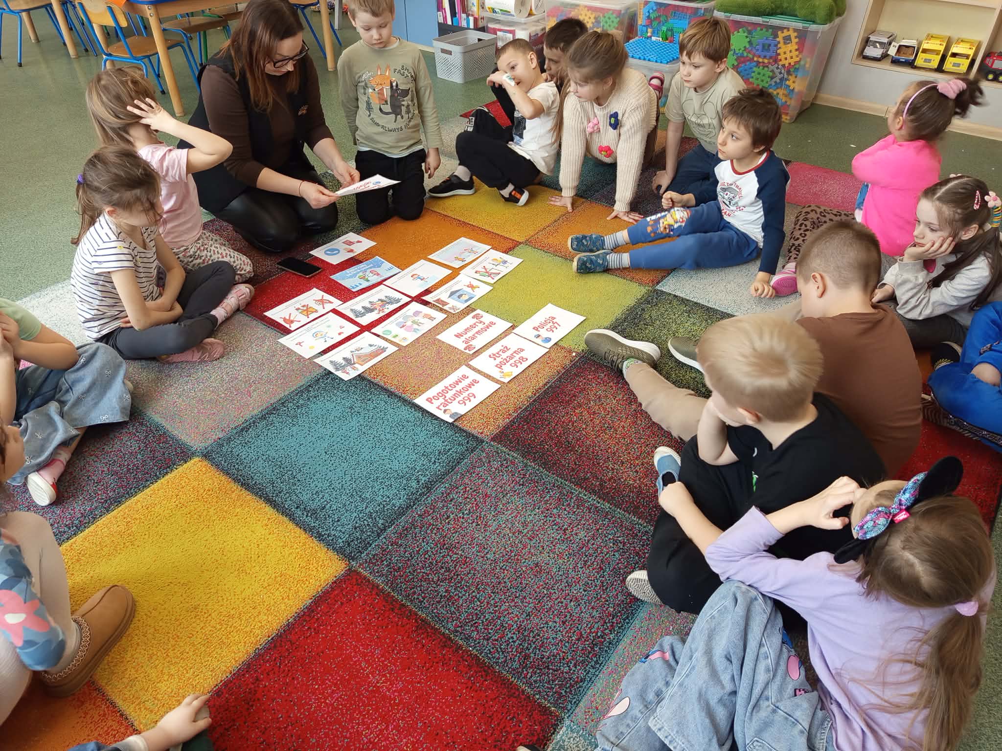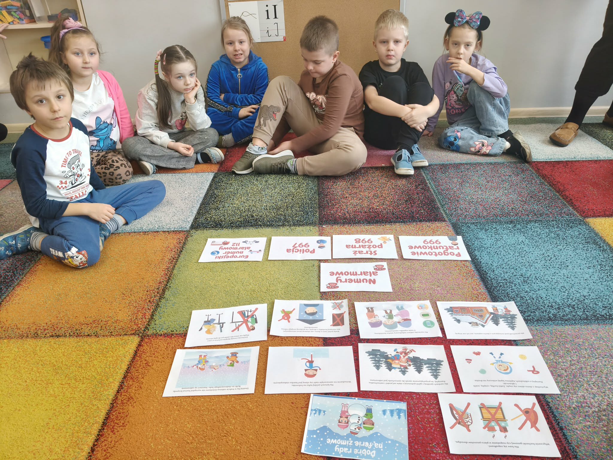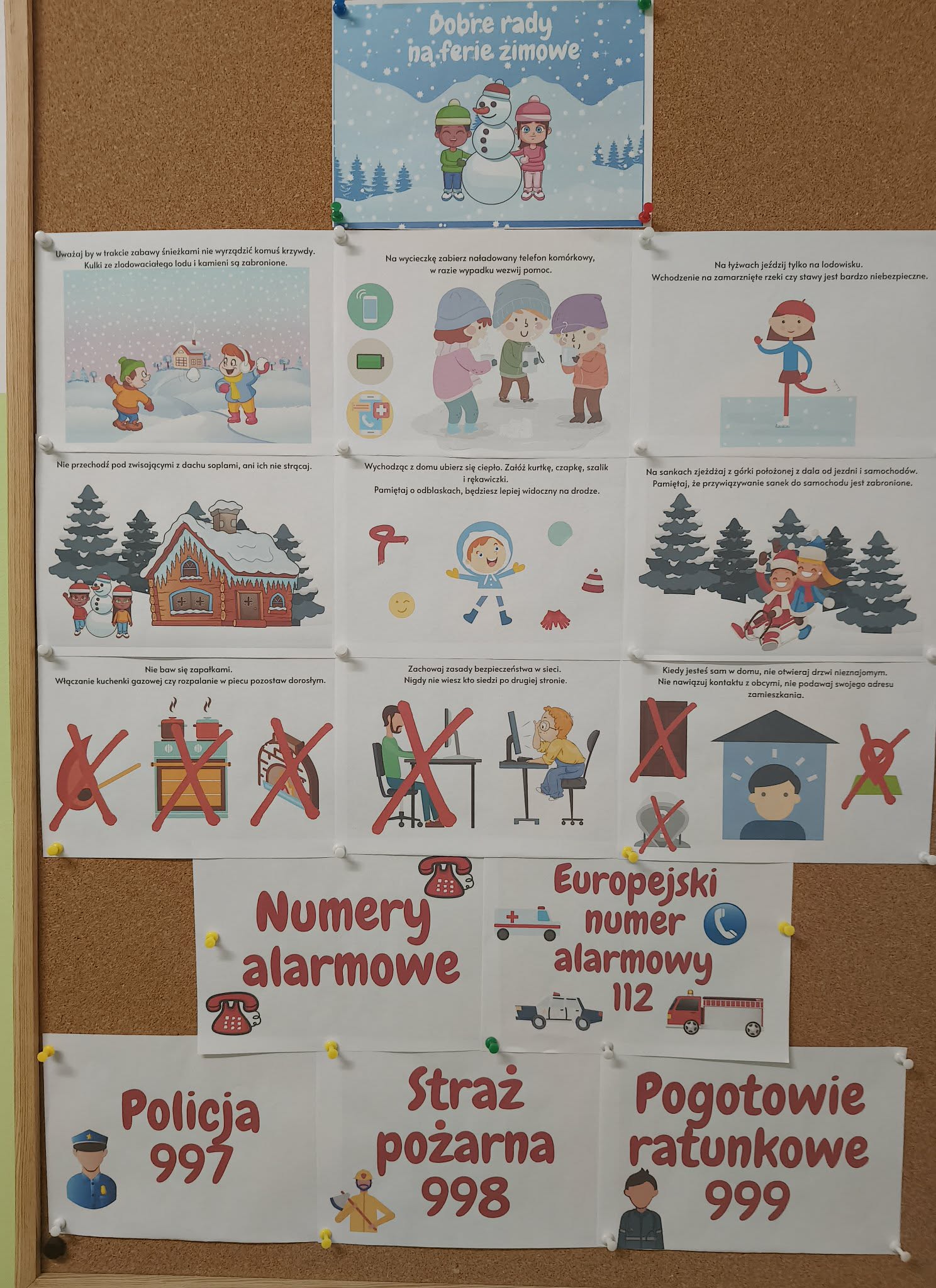 W dniu dzisiejszym dzieci z grupy VII "Żabki" i IX "Zajączki", uczestniczyły w zajęciach dydaktycznych, które dotyczyły zachowania zasad bezpieczeństwa podczas nadchodzących ferii zimowych. Dzieci podczas zajęć przypomniały sobie jak należy zachować się w różnych sytuacjach, tj.: bezpieczeństwo podczas zabaw zimowych (zjeżdżania na sankach, jazda na łyżwach, rzucanie się śnieżkami, itp.), zachowanie w domu, gdy jesteśmy sami, spotkanie osoby nieznajomej. Przedszkolaki przypomniały sobie również numewry alarmowe. Wykonywały próby połączenia się z dyspozytorem, w formie zabawy dramowej. Uczestniczyły w zabawie ruchowo-naśladowczej do utworu "Bezpieczne ferire".Dzieci wykonały kartę pracy przy stolikach, utrwalając sobie numery alarmowe i jakie słóżby można wezwać korzystajac z wybranego numeru. Na zakończenie zajęć, każdy uczestnik otrzymał dyplom za udział oraz medal. Dzieci mogły przypominać sobie omówione podczas zajęć zasady, oglądając gazetkę poświęconą temu tematowi.