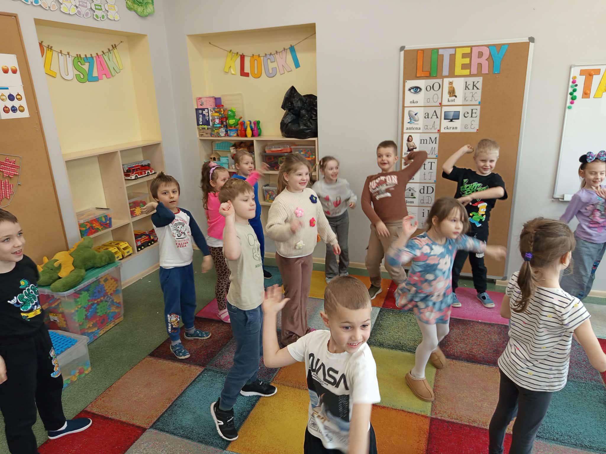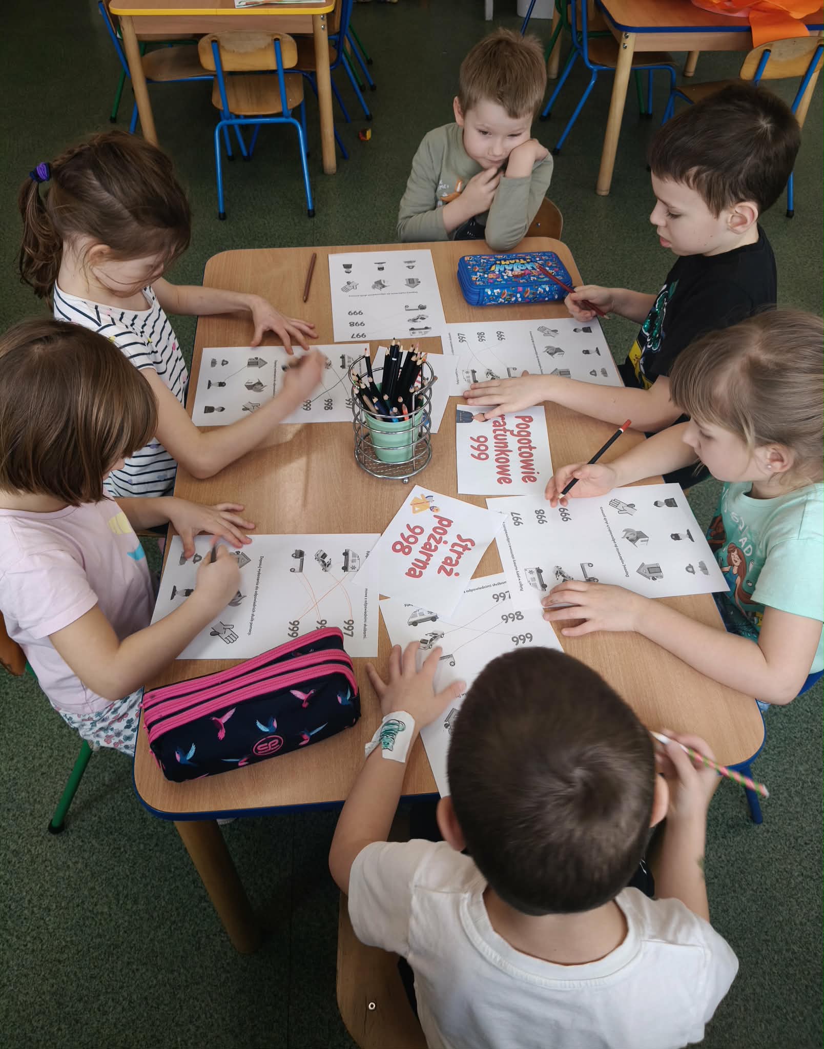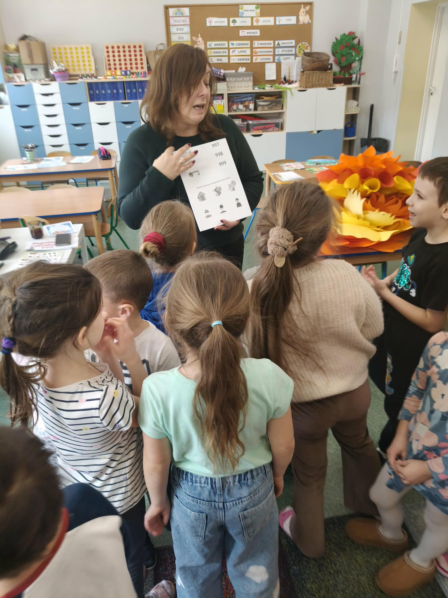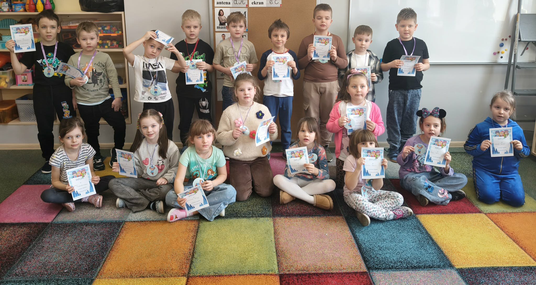 W dniu dzisiejszym dzieci z grupy VII "Żabki" i IX "Zajączki", uczestniczyły w zajęciach dydaktycznych, które dotyczyły zachowania zasad bezpieczeństwa podczas nadchodzących ferii zimowych. Dzieci podczas zajęć przypomniały sobie jak należy zachować się w różnych sytuacjach, tj.: bezpieczeństwo podczas zabaw zimowych (zjeżdżania na sankach, jazda na łyżwach, rzucanie się śnieżkami, itp.), zachowanie w domu, gdy jesteśmy sami, spotkanie osoby nieznajomej. Przedszkolaki przypomniały sobie również numewry alarmowe. Wykonywały próby połączenia się z dyspozytorem, w formie zabawy dramowej. Uczestniczyły w zabawie ruchowo-naśladowczej do utworu "Bezpieczne ferire".Dzieci wykonały kartę pracy przy stolikach, utrwalając sobie numery alarmowe i jakie słóżby można wezwać korzystajac z wybranego numeru. Na zakończenie zajęć, każdy uczestnik otrzymał dyplom za udział oraz medal. Dzieci mogły przypominać sobie omówione podczas zajęć zasady, oglądając gazetkę poświęconą temu tematowi.