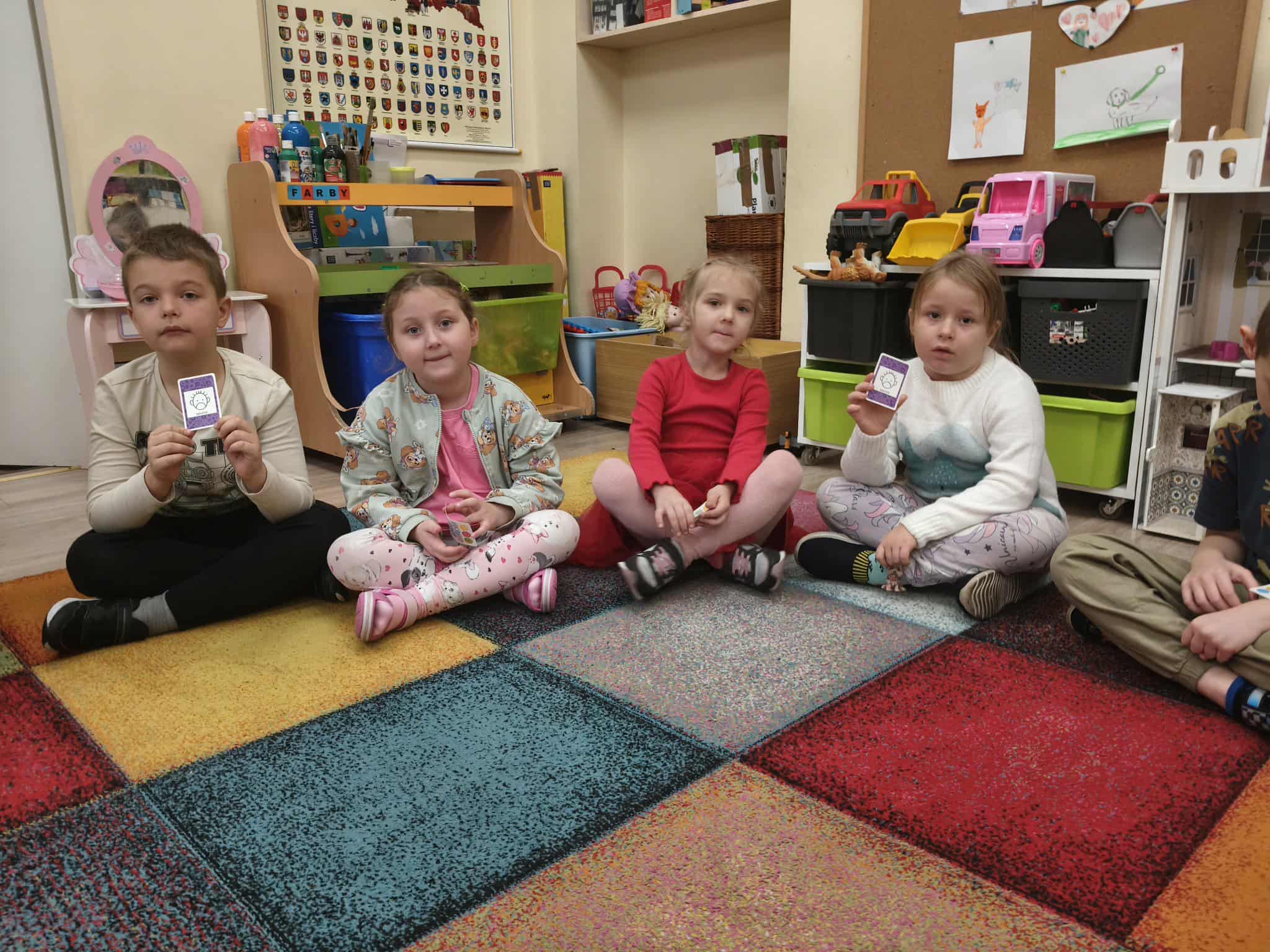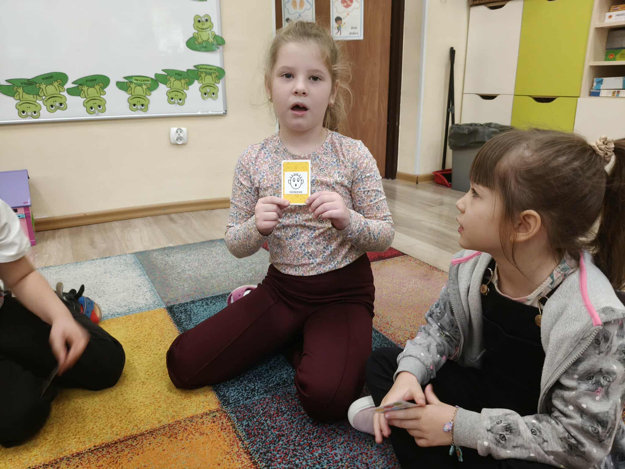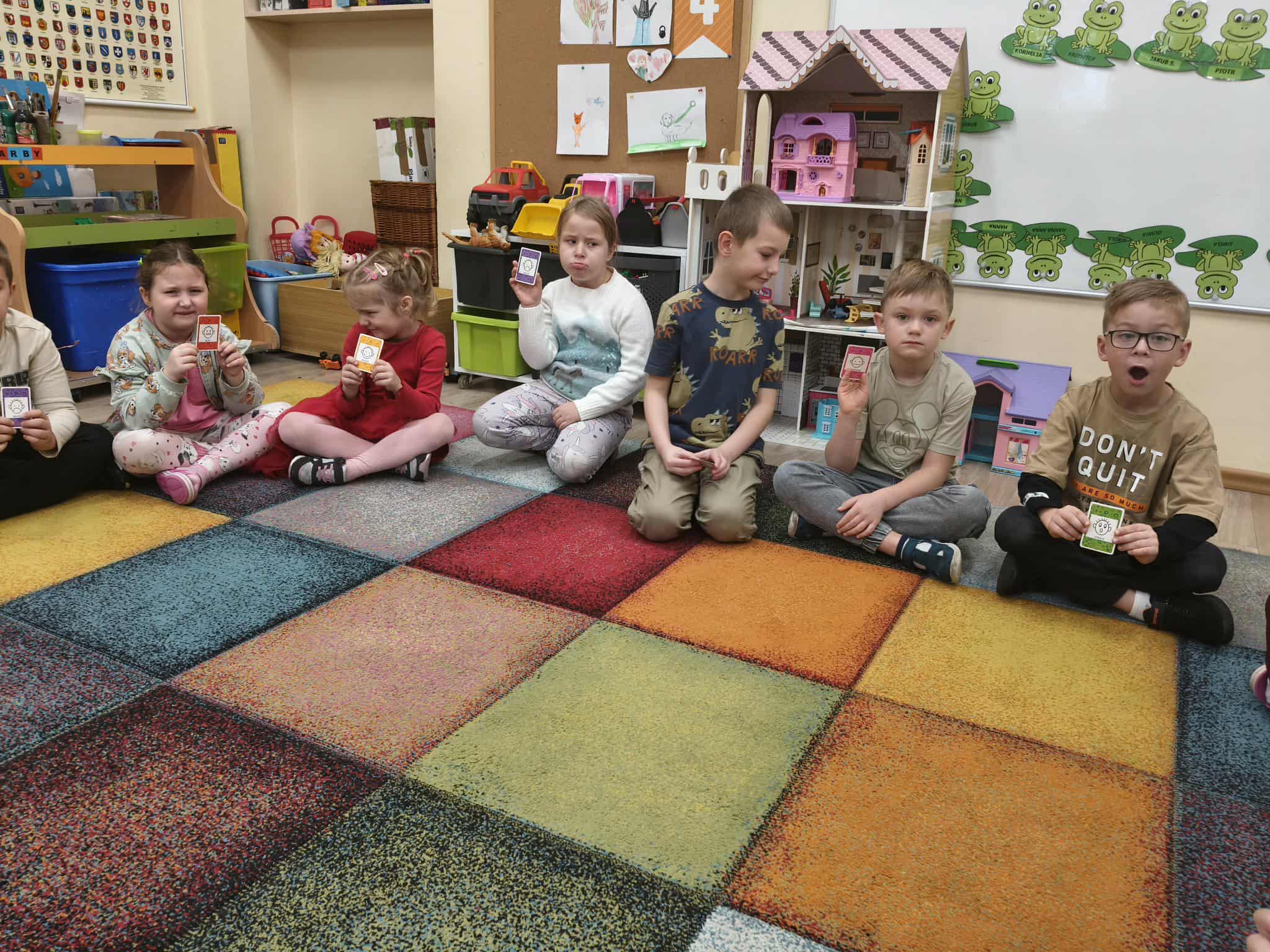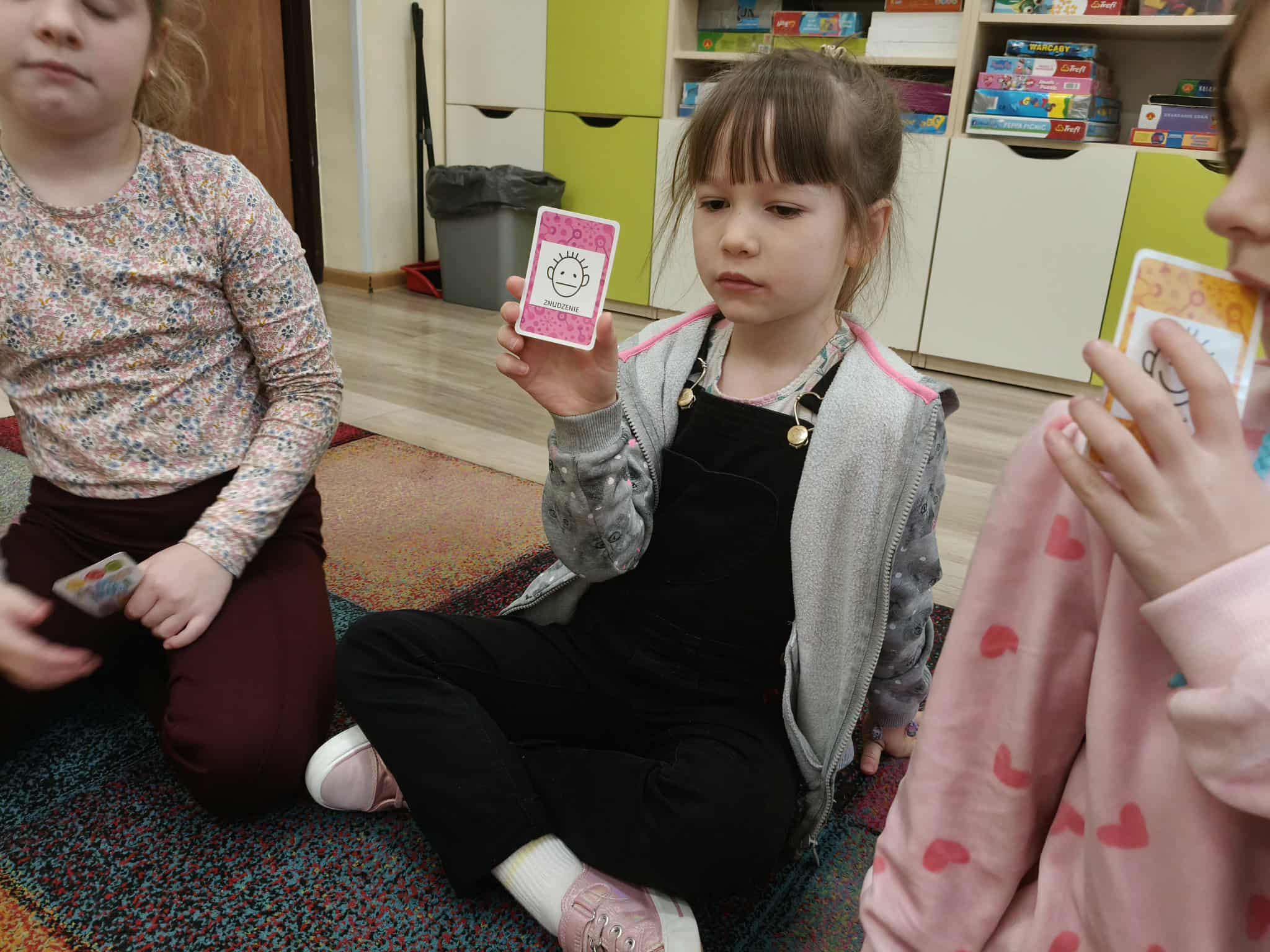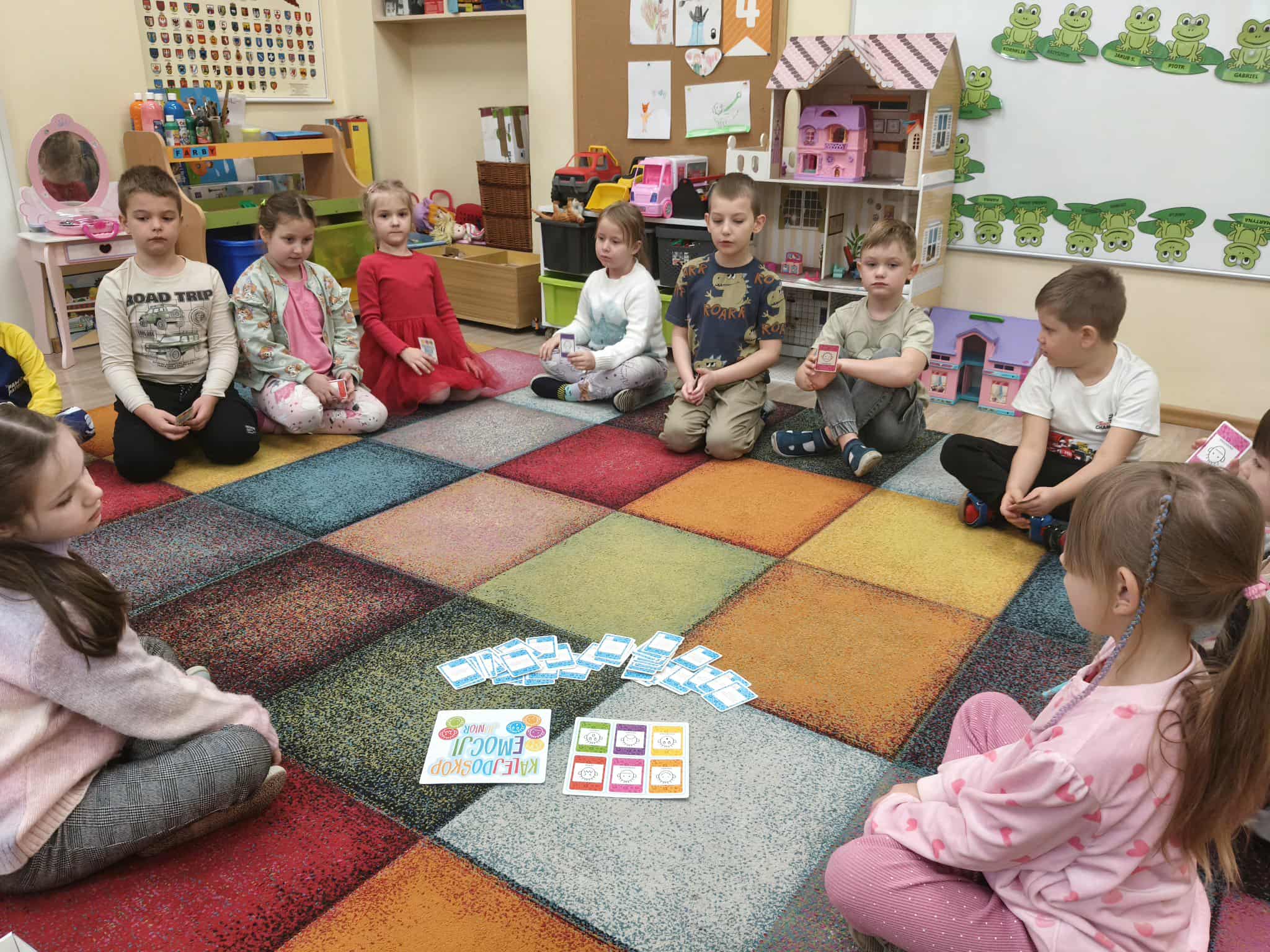 Dzieci z grupy "Żabki", uczestniczyły w grze towarzyskiej "Kalejdoskop emocji". Podczas gry dzieci ćwiczyły komunikację, rozwijały umiejetność myślenia przyczynowo-skutkowego. Na podstawie informacji podawanych przez nauczyciela, dzieci przypisywały odpowiednią emocję.