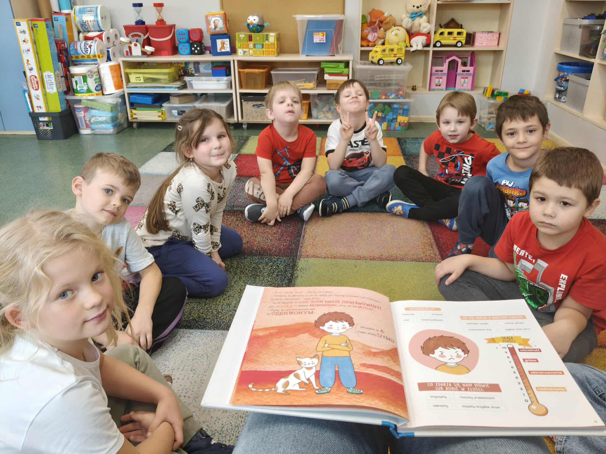 Dzieci z grupy "Wiewióreczki" uczestniczyły w zajęciach edukacyjnych na temat złości. Zajęcia przeprowadzone na podstawie książki "Montesori. Obrazkowa ksiega emocji". Wysłuchały opowiadania o przygodach głównego bohatera w krainie złości. Następnie poznały sposoby na pozbycie się tego uczucia.