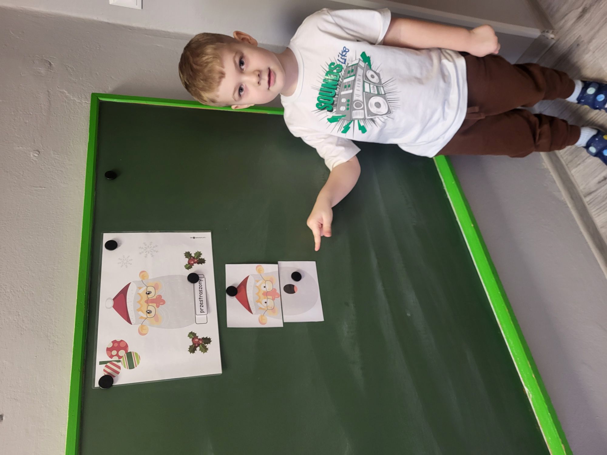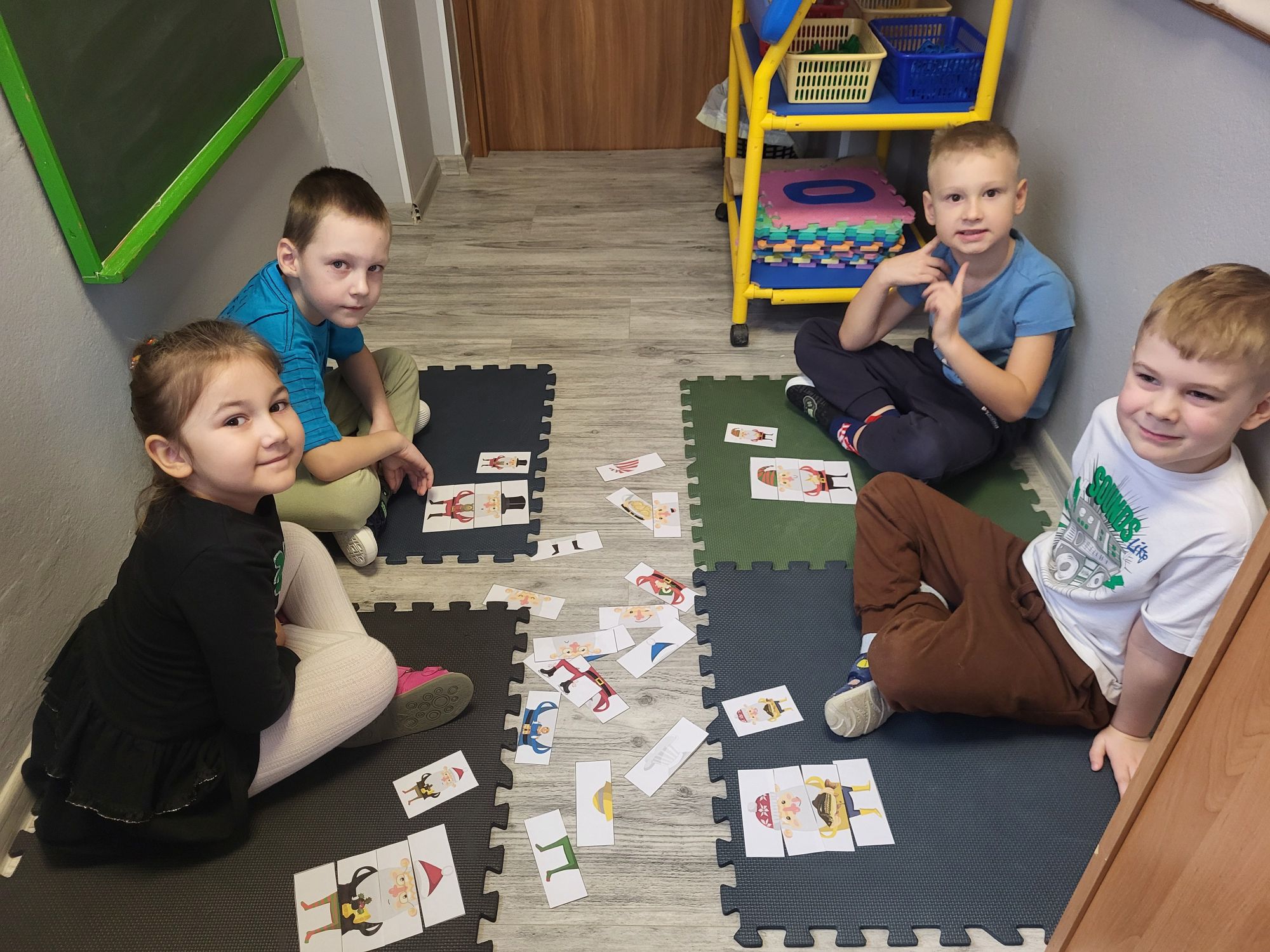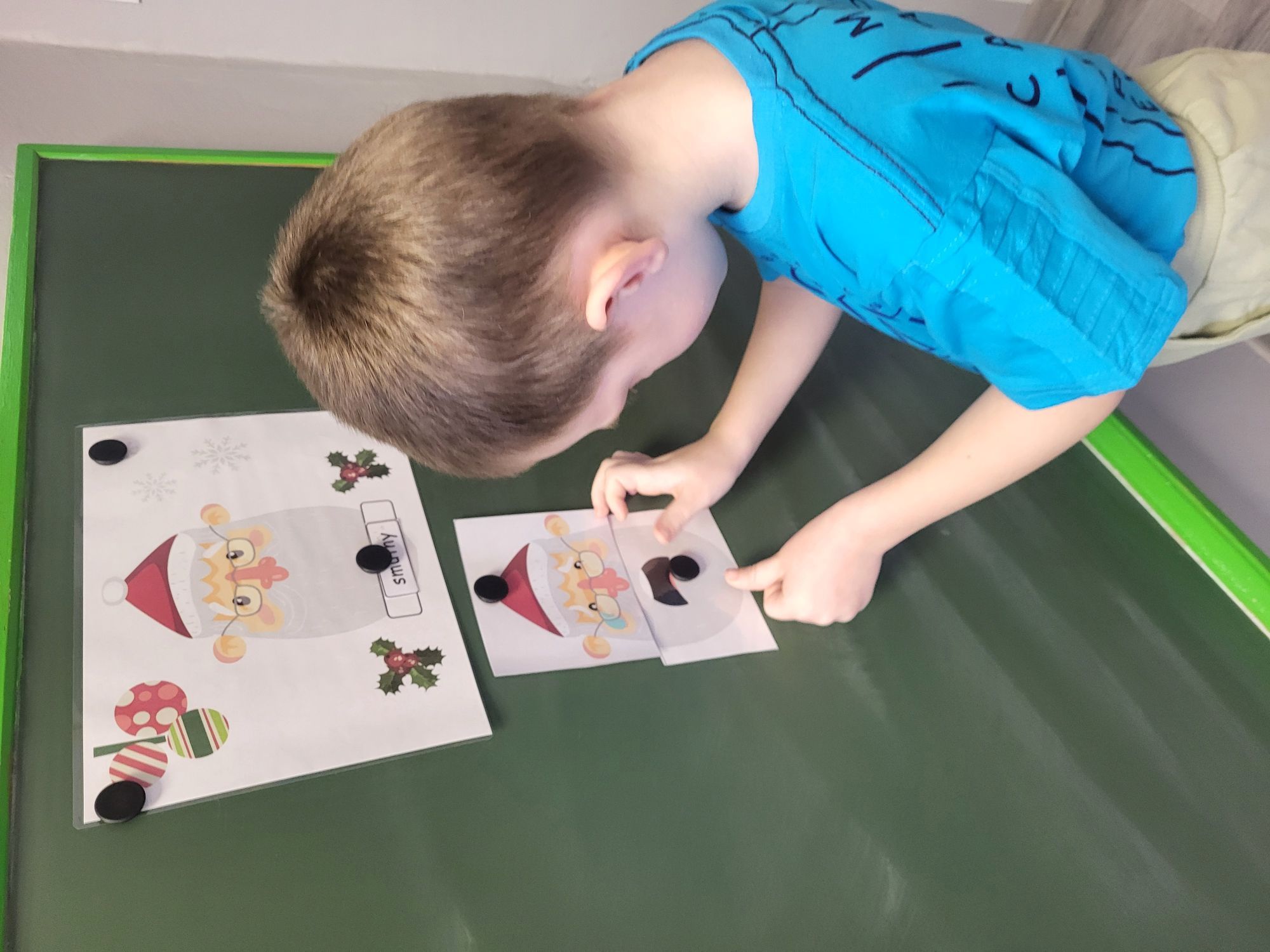 Na dzisiejszych zajęciach TUS dzieci 5 - letnie wspólnie układały obrazki z Mikołajami, wyrażające różne emocje. Odpowiadały na pytania nauczyciela, uczyły się czekania na swoją kolej, pomagały sobie nawzajem, oraz wyszukiwały, rozpoznawały i nazywały widoczne emocje.