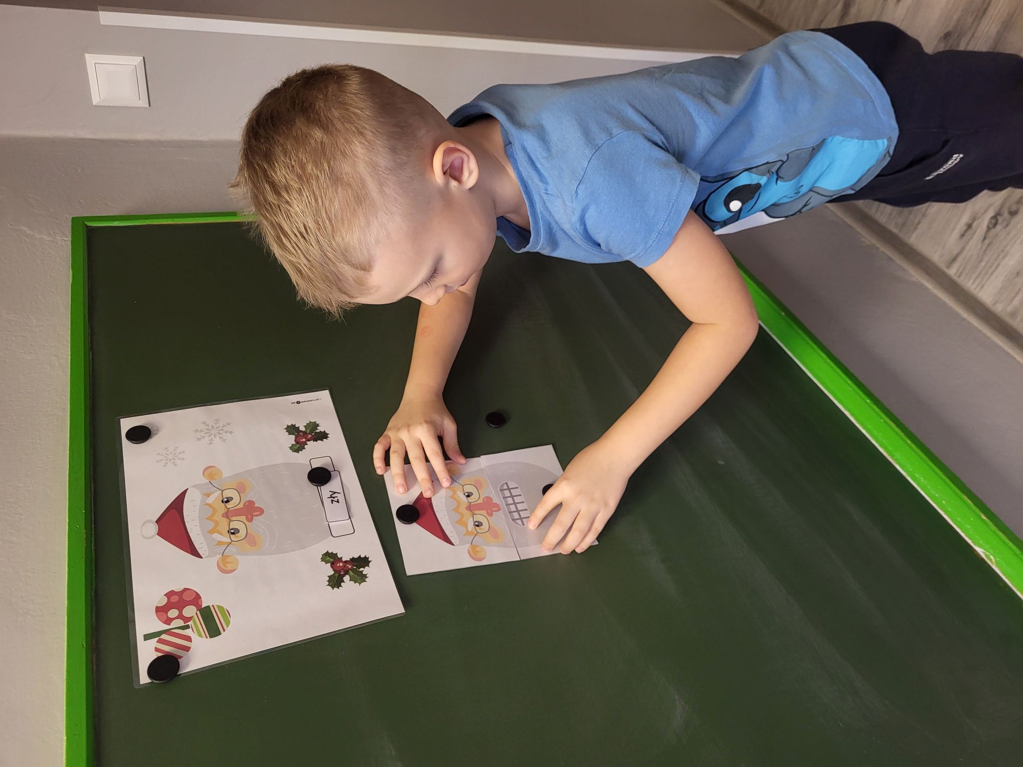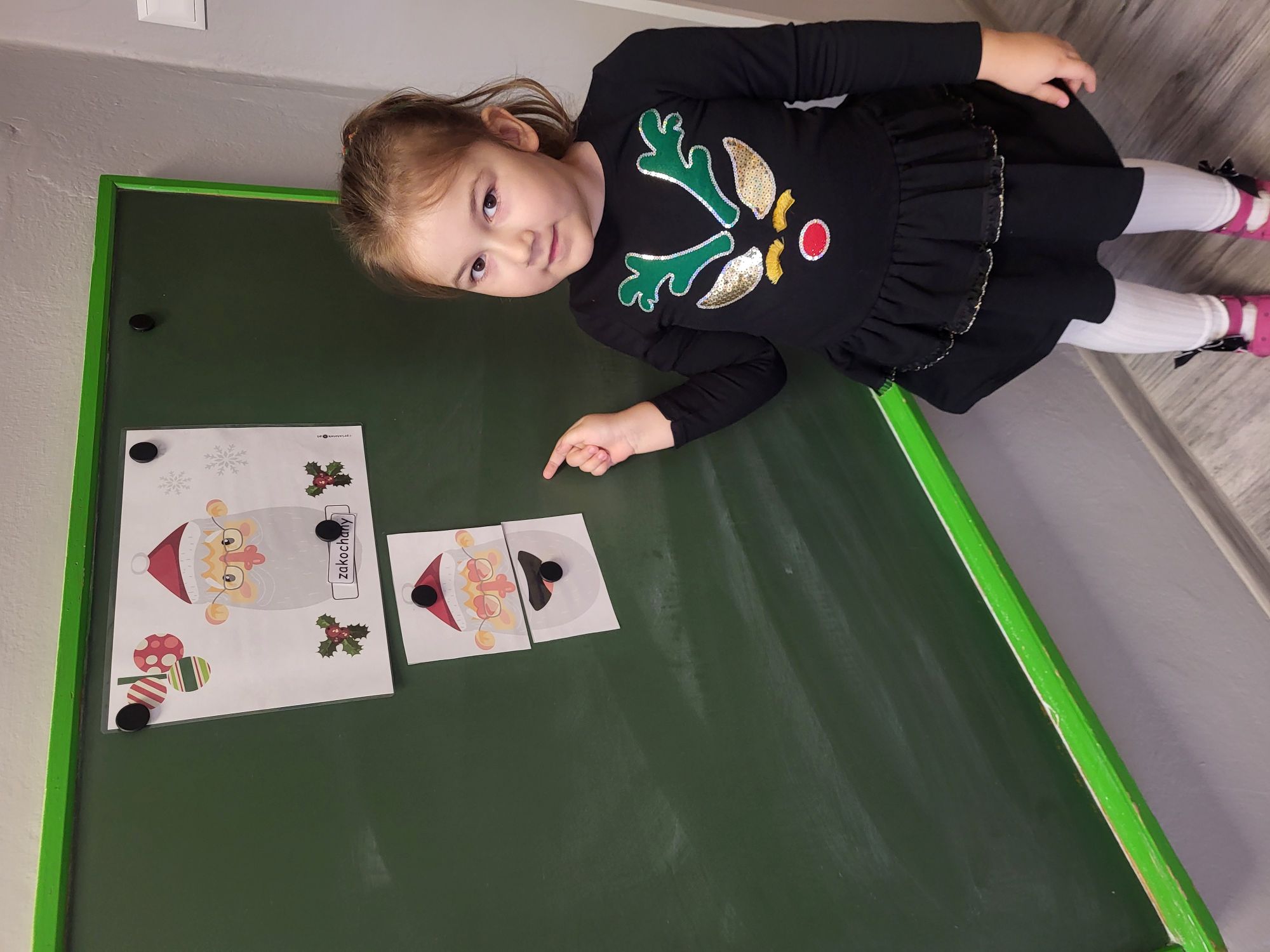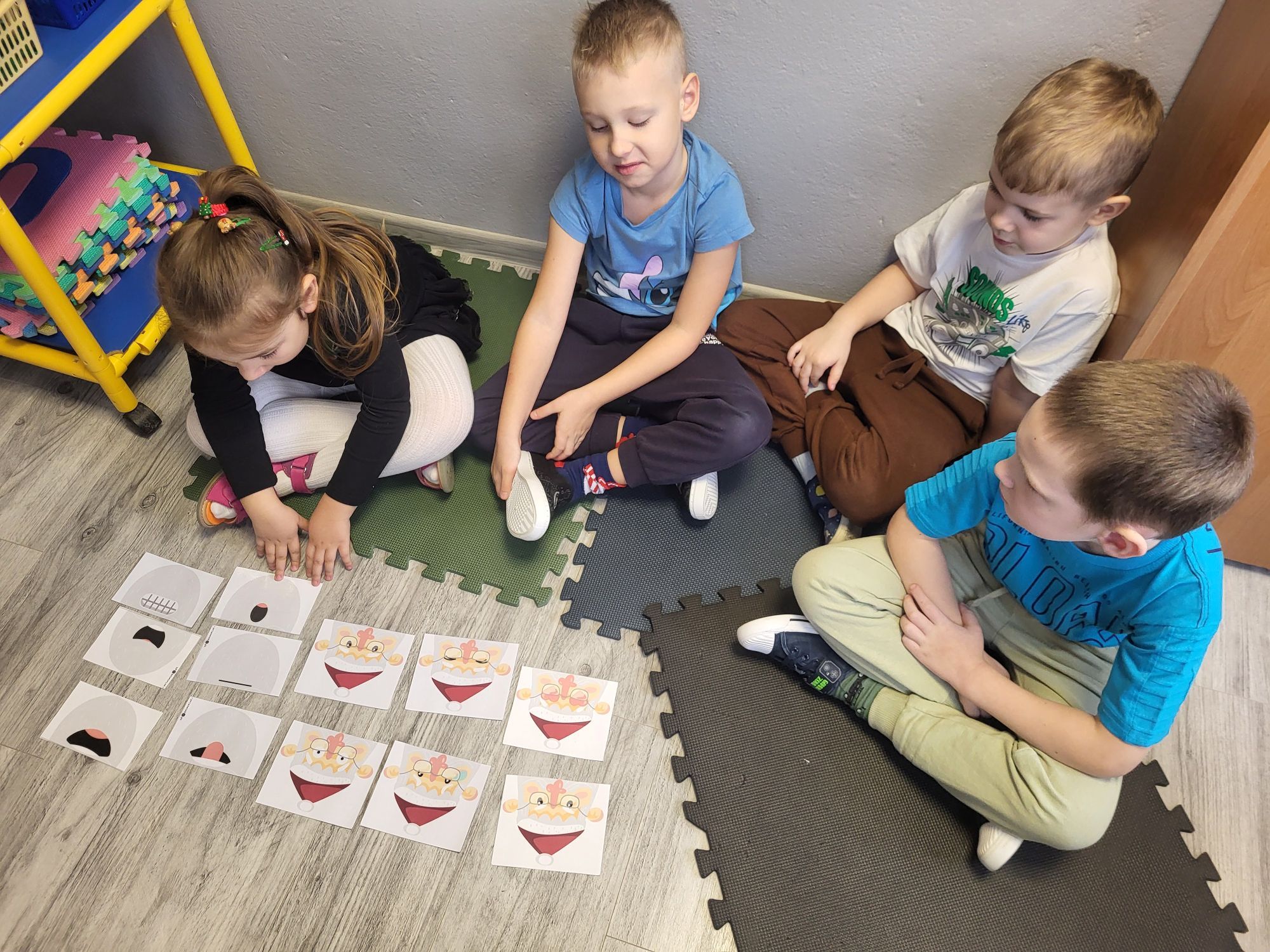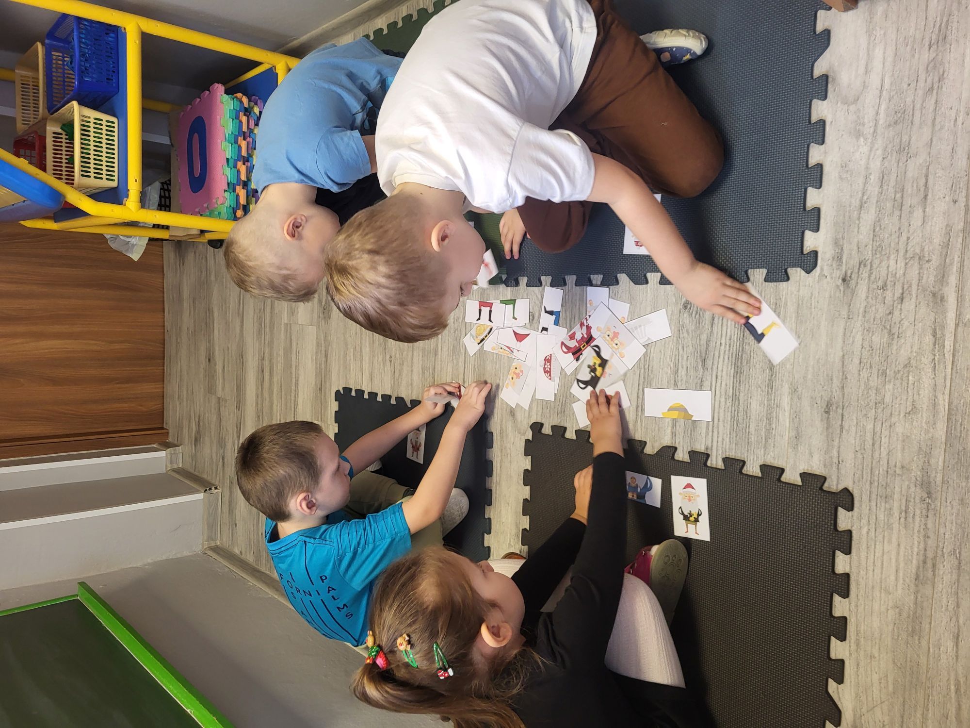 Na dzisiejszych zajęciach TUS dzieci 5 - letnie wspólnie układały obrazki z Mikołajami, wyrażające różne emocje. Odpowiadały na pytania nauczyciela, uczyły się czekania na swoją kolej, pomagały sobie nawzajem, oraz wyszukiwały, rozpoznawały i nazywały widoczne emocje.