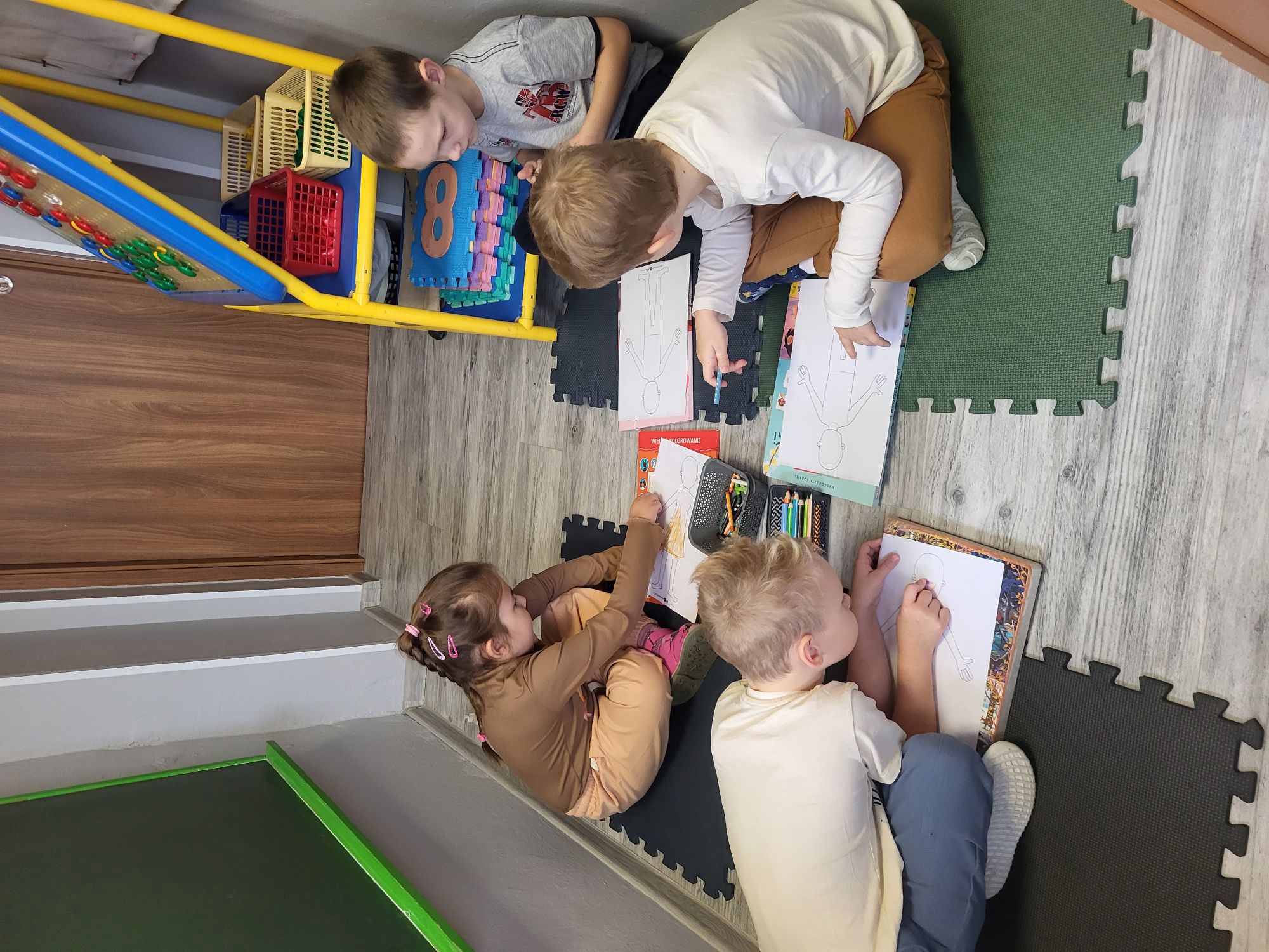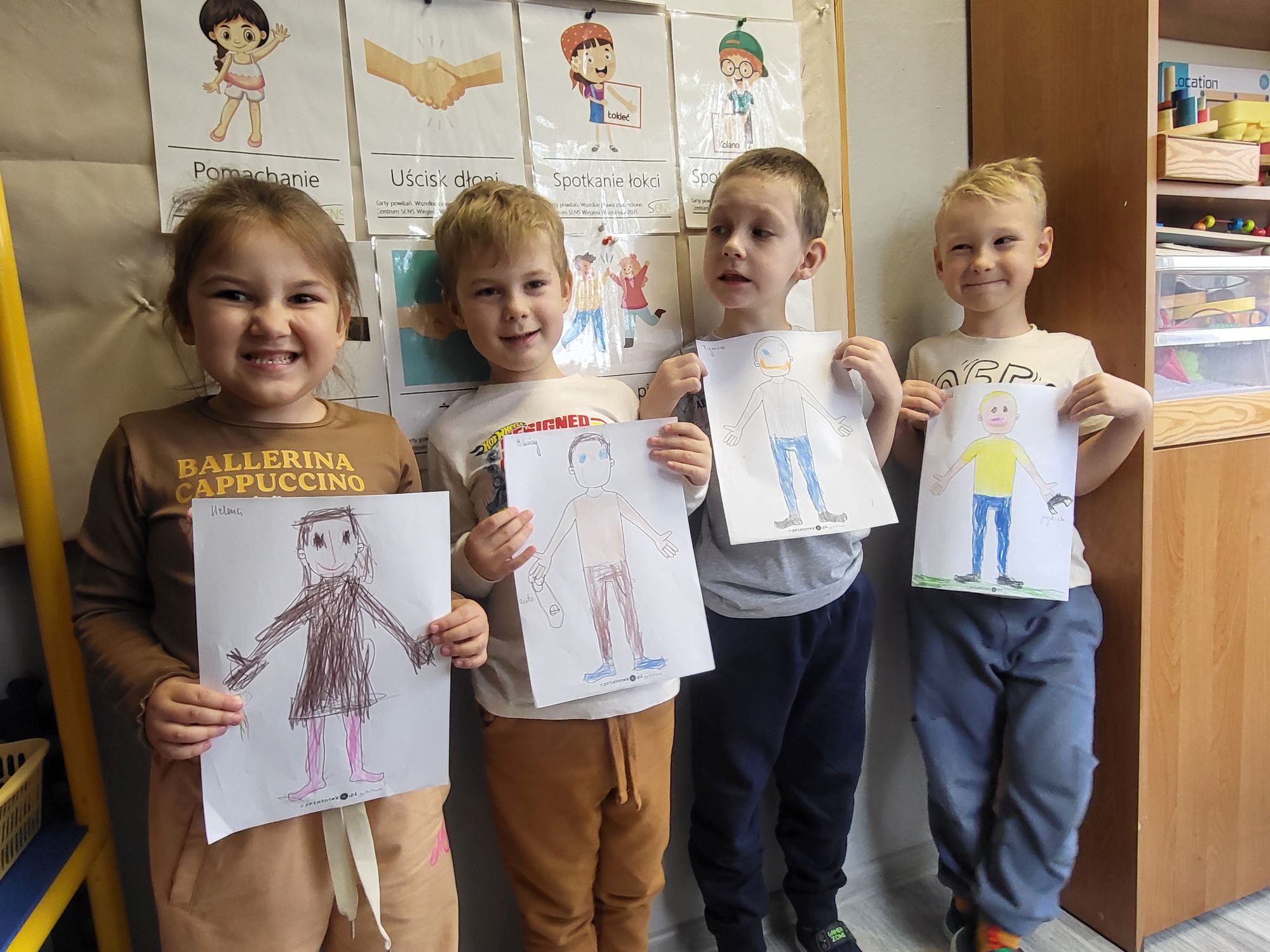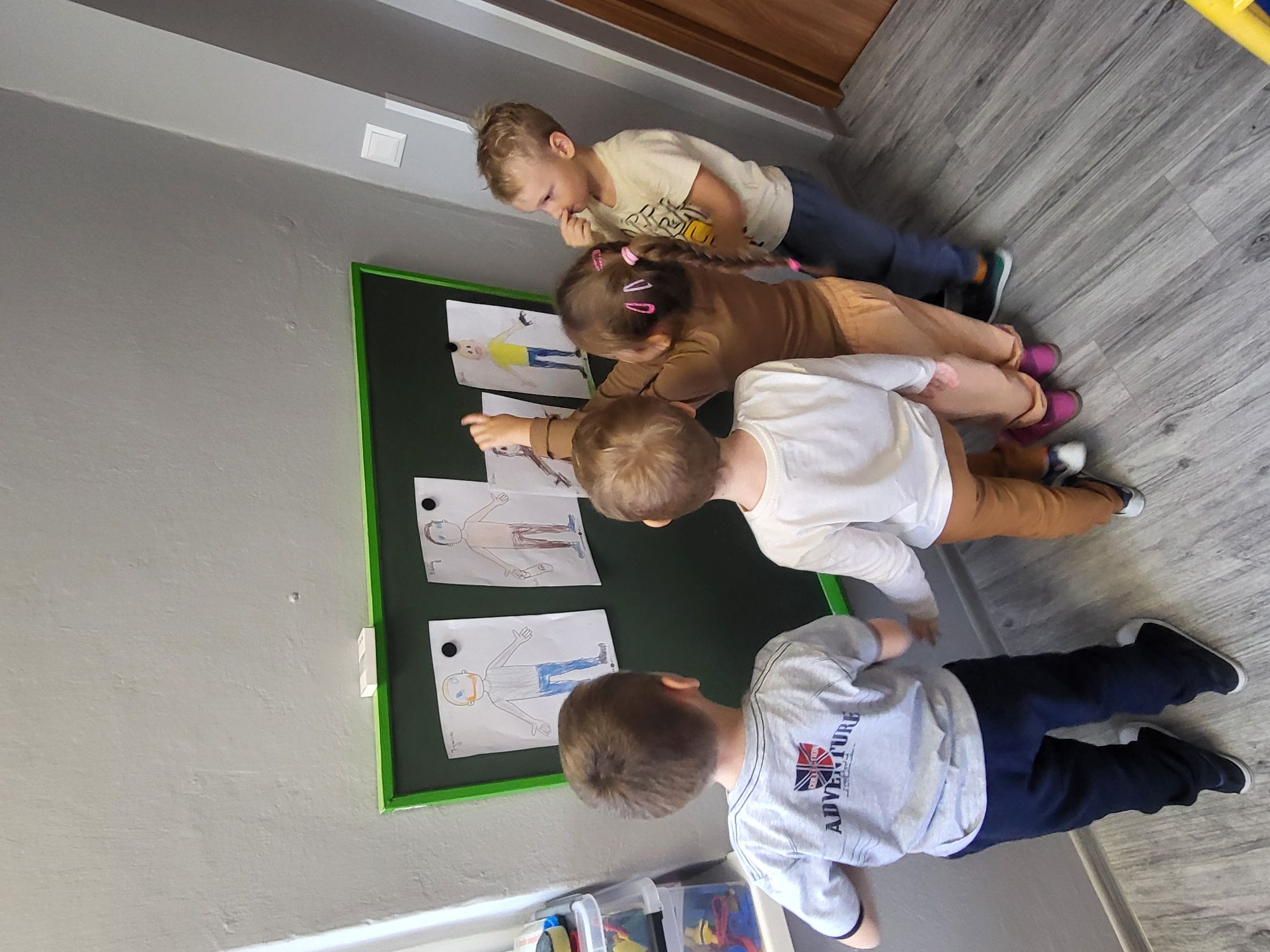 Podczas zajęć TUS dzieci 5-letnie rozmawiały o swoim dzisiejszym samopoczuciu, rysowały emocje oraz kończyły kolorowanie postaci ludzkiej. Na zakończenie zajęć prezentowały swoje wytwory.