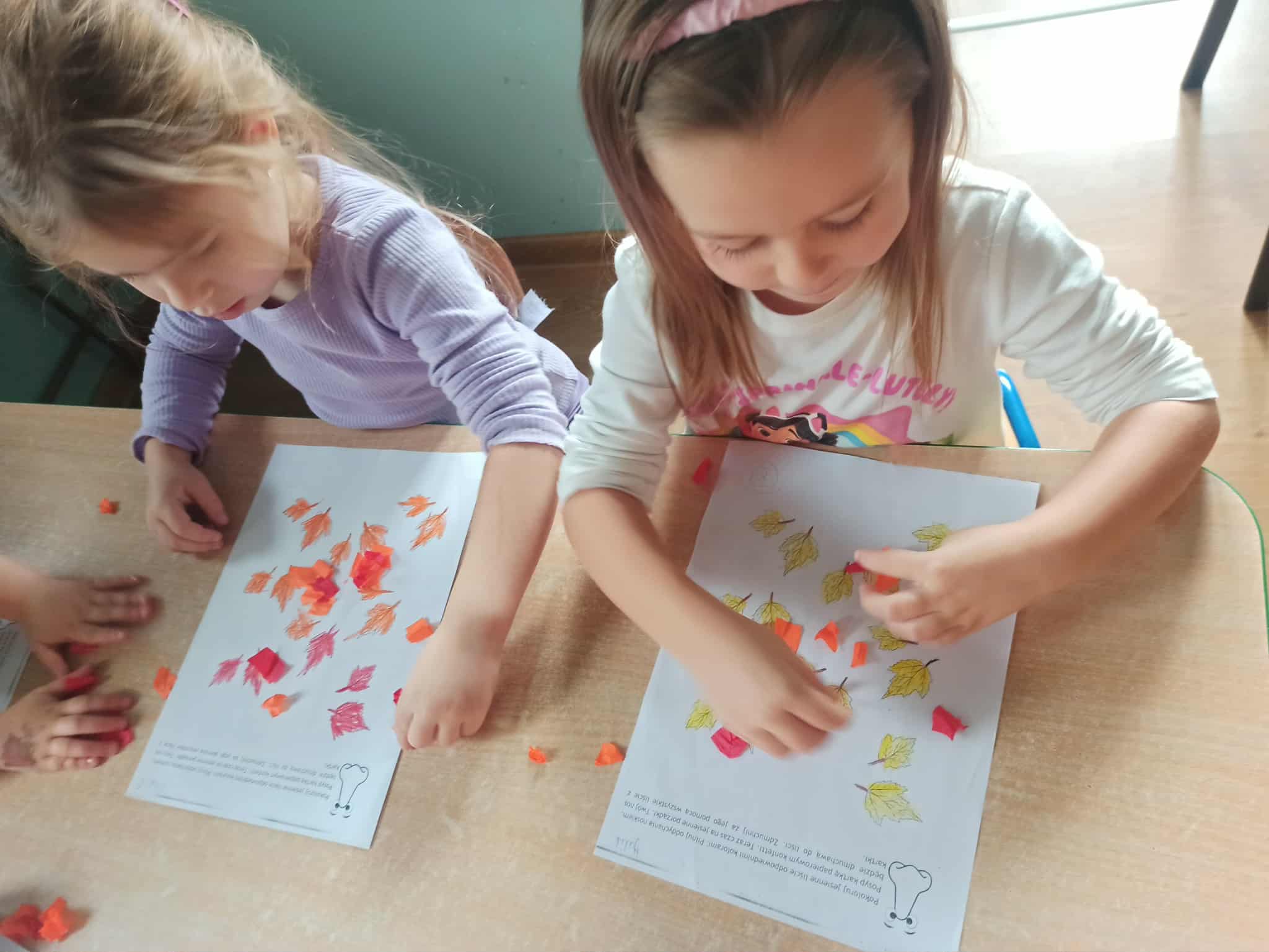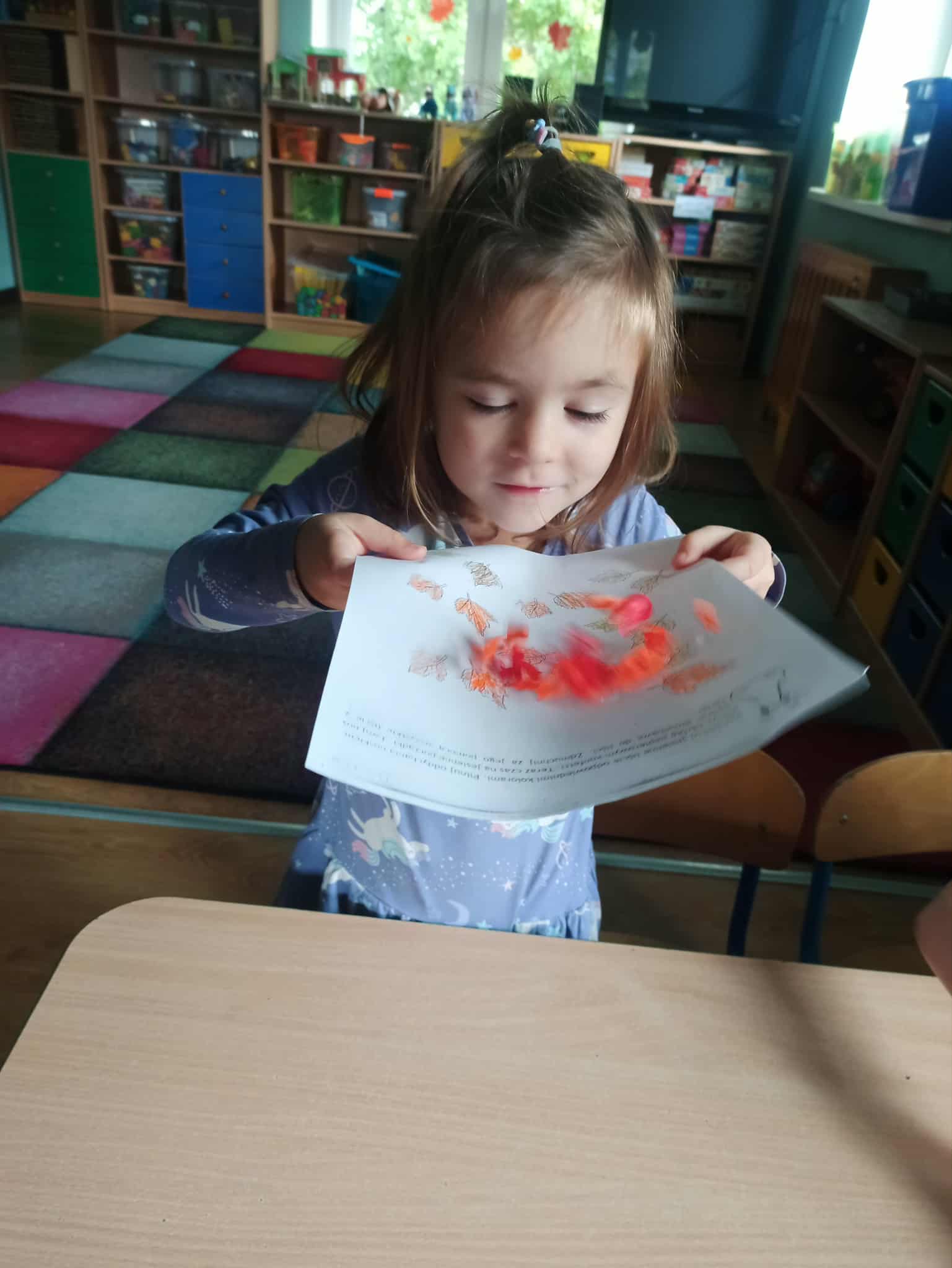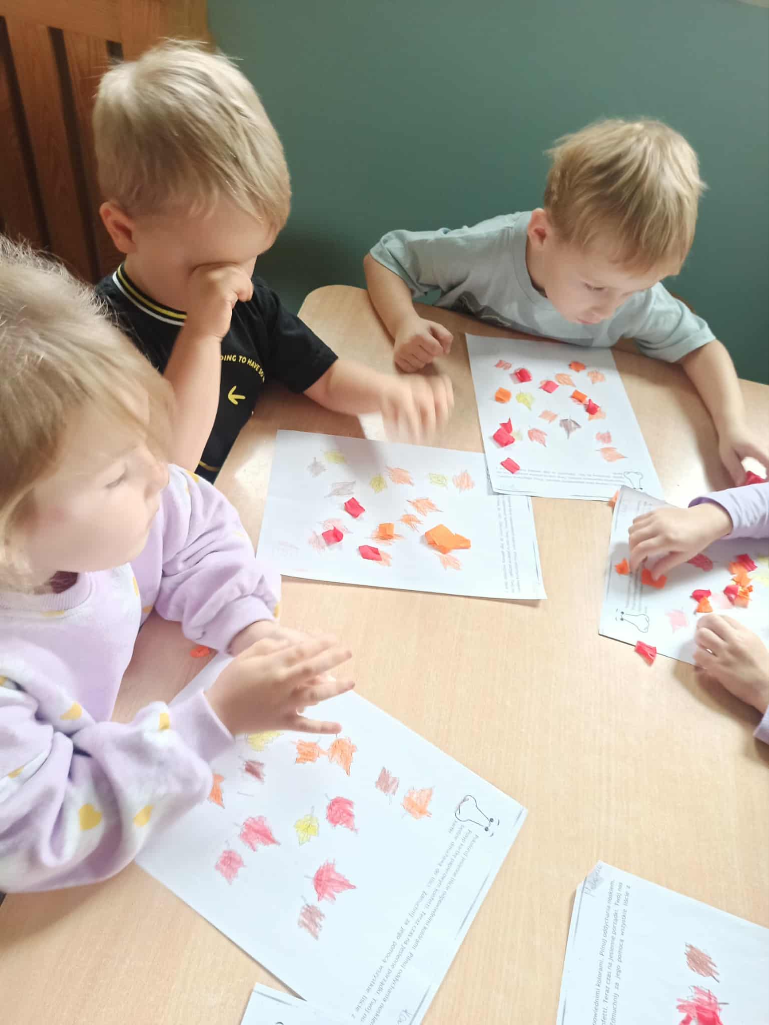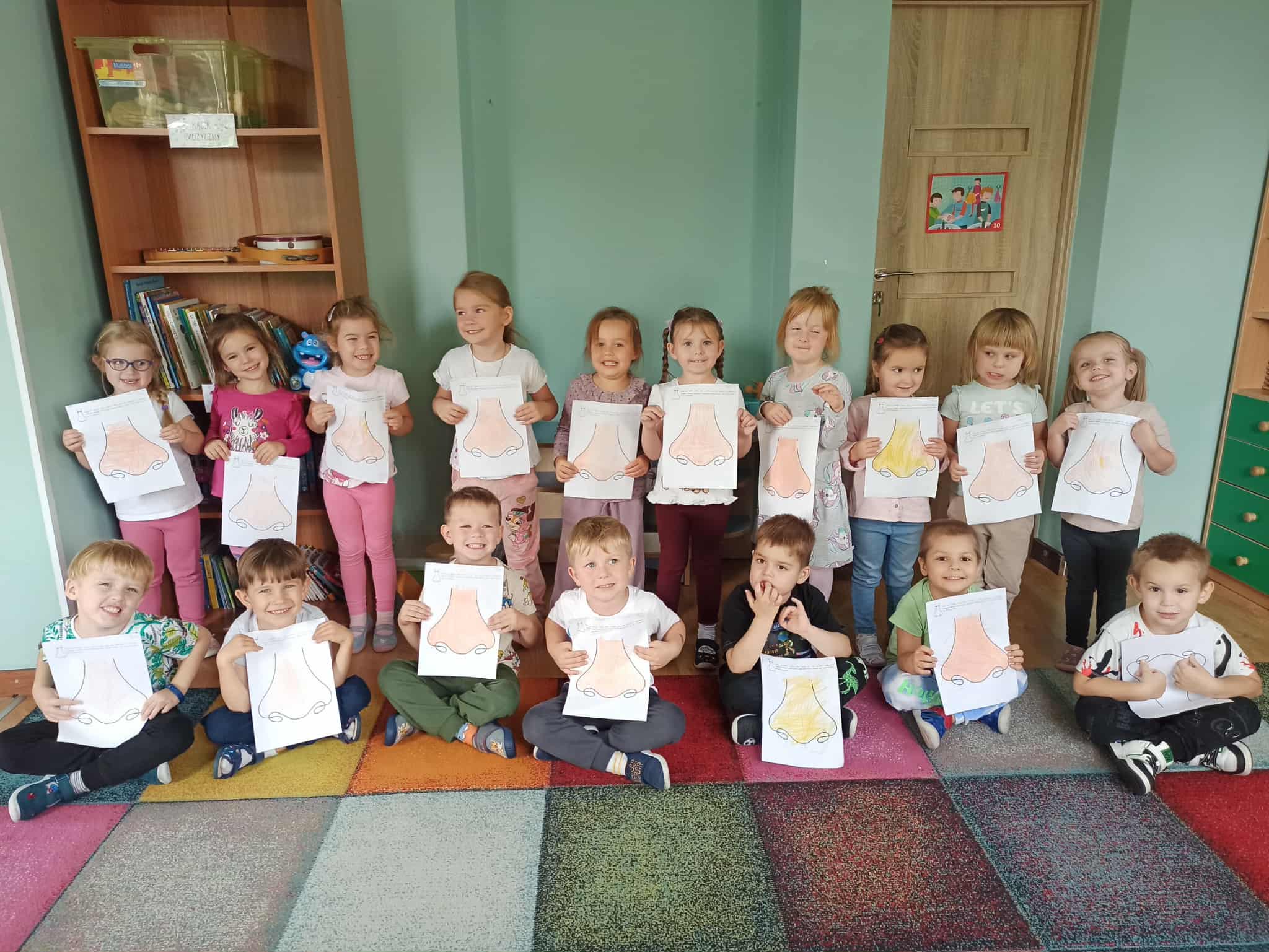 W naszej grupie zrealizowaliśmy pierwsze zajęcia z programu profilaktycznego pt. "Oddycham nosem cały rok". Jego celem jest upowszechnianie wiedzy na temat prawidłowego nosowego toru oddechowego oraz jego wpływu na zdrowie i codzienne funkcjonowanie. Przedszkolaki poznały postać Nosalka, która będzie im towarzyszyła w realizacji programu. Dzieci pokolorowały jego kontur i wykonały zlecone przez niego zadanie. Miały pokolorować jesienne liście, a później zmienić swój nos w dmuchawę i zdmuchnąć z karty pracy kawałki bibuły tak jak dmuchawy zdmuchują z ulic jesienne liście.