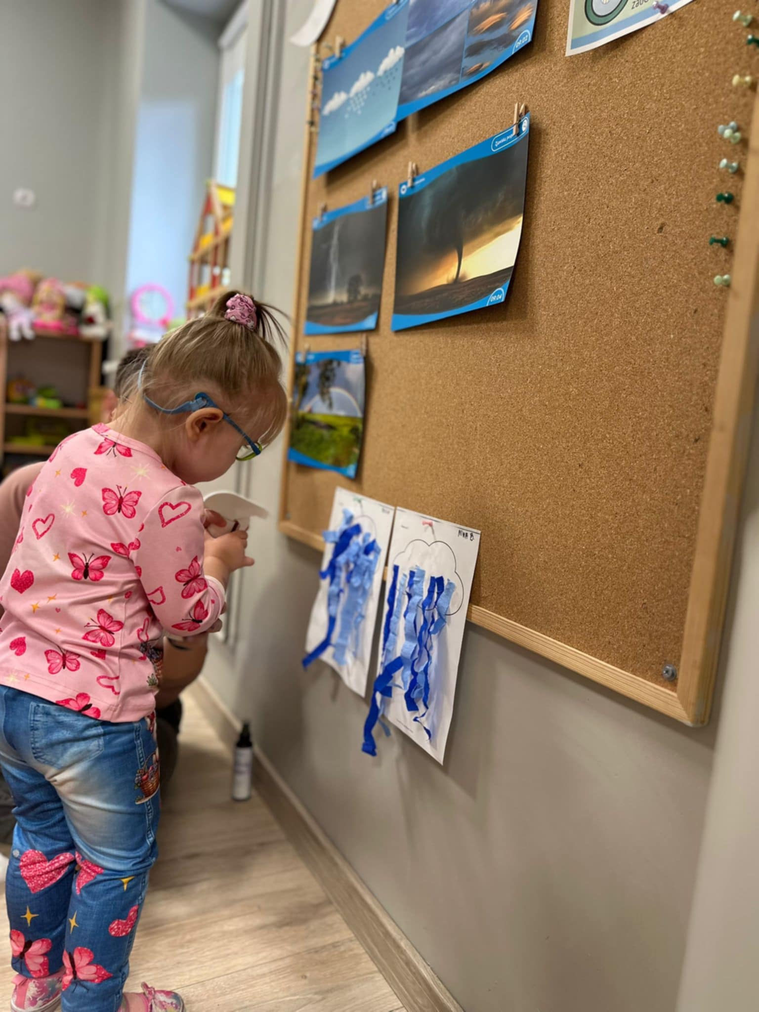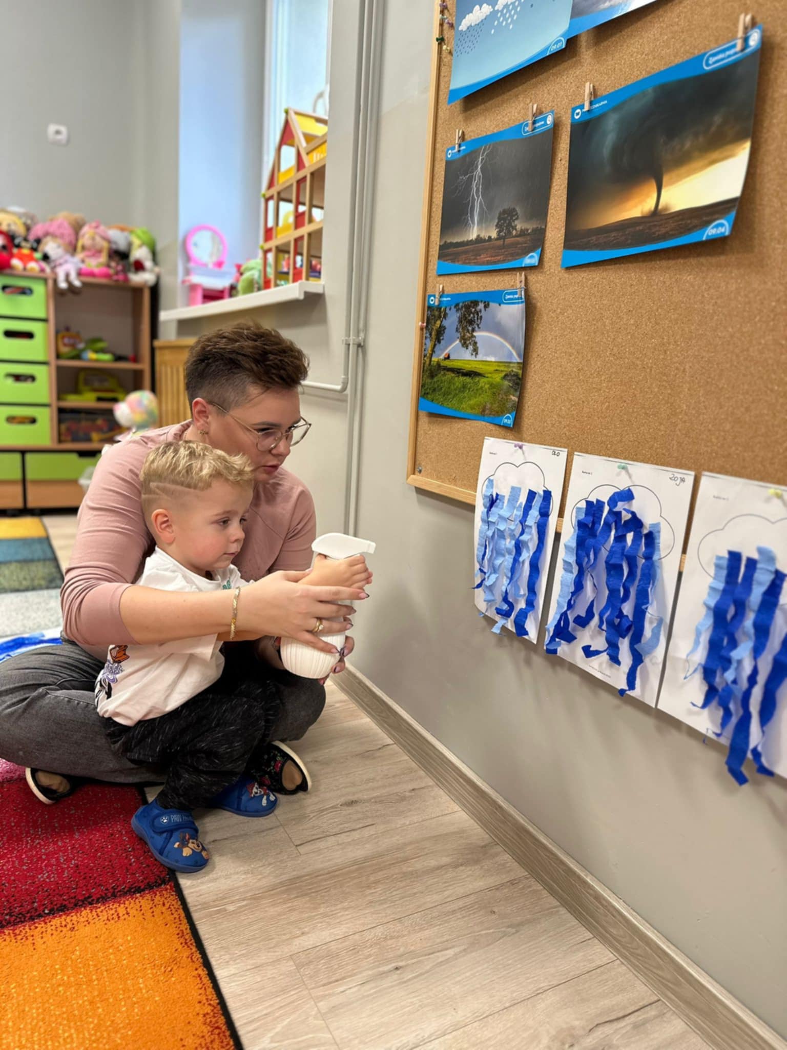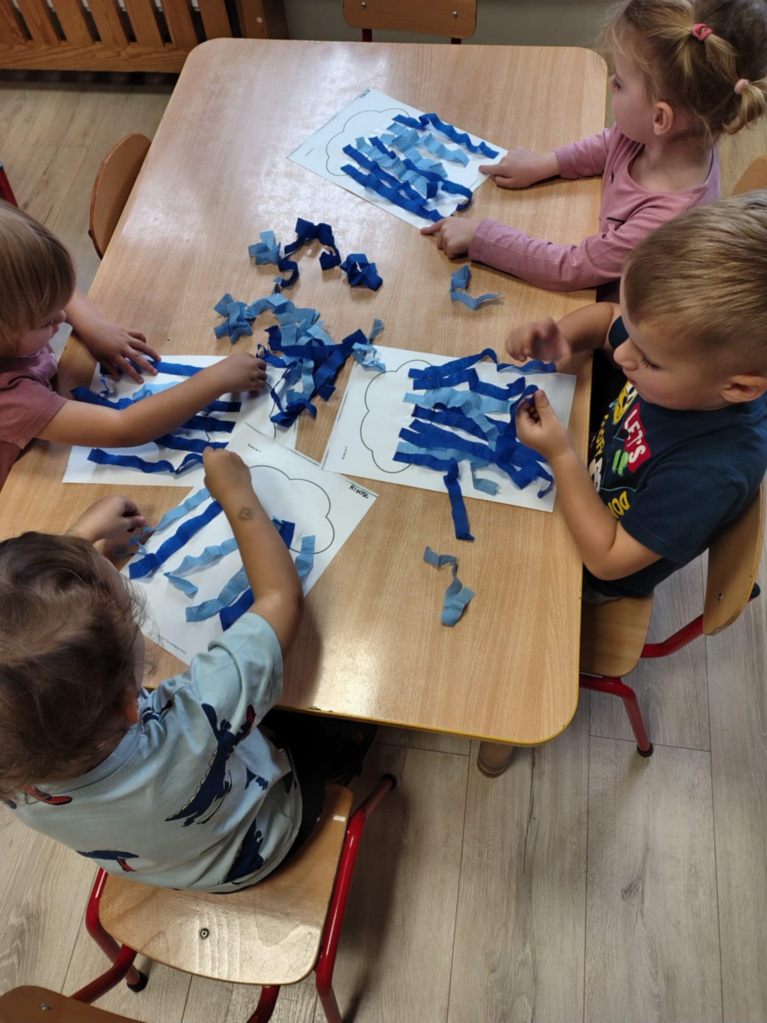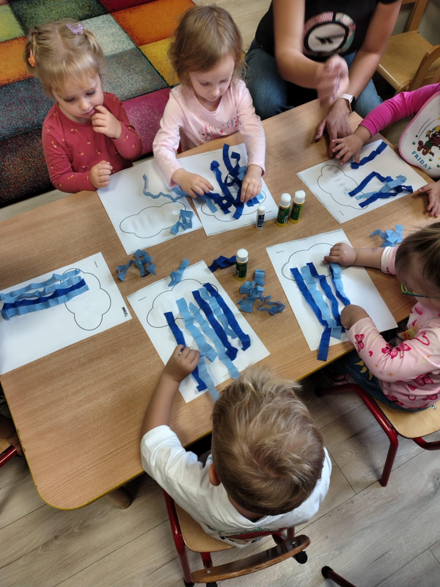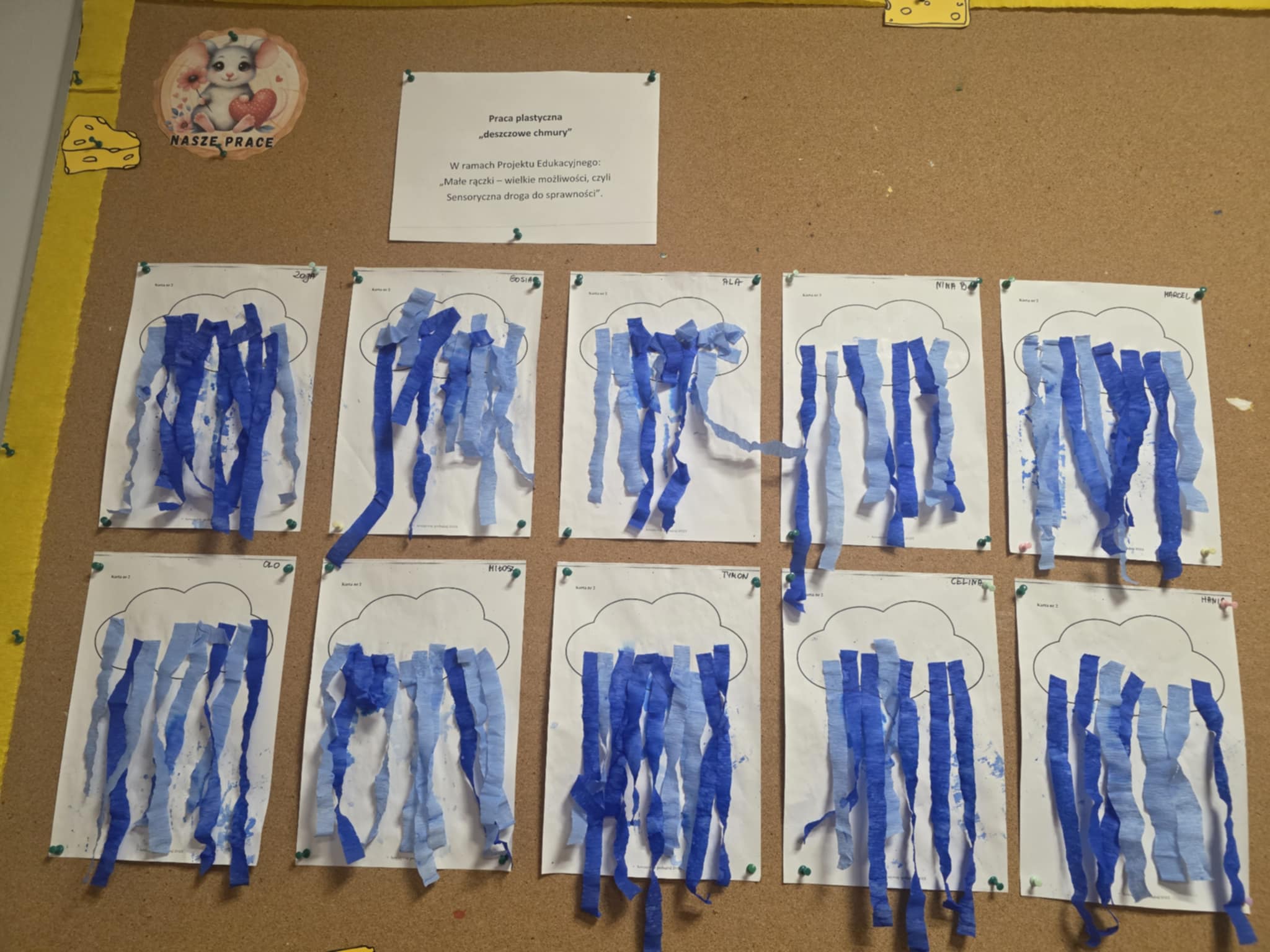 Ogólnopolski Projekt Edukacyjny "Małe rączki - wielkie możliwości, czyli sensoryczna droga do sprawności" Dzieci wykonały pierwsze zadanie: deszczowe chmury. Maluszki wykleiły niebieską bibułą chmurkę, a następnie przy użyciu spryskiwacza z wodą, spryskały ją, aby powstał deszcz. Dzieci mogły zaobserwować, że bibuła zabarwiła wodę na kolor niebieski i z naszej chmurki zaczął padać deszcz.