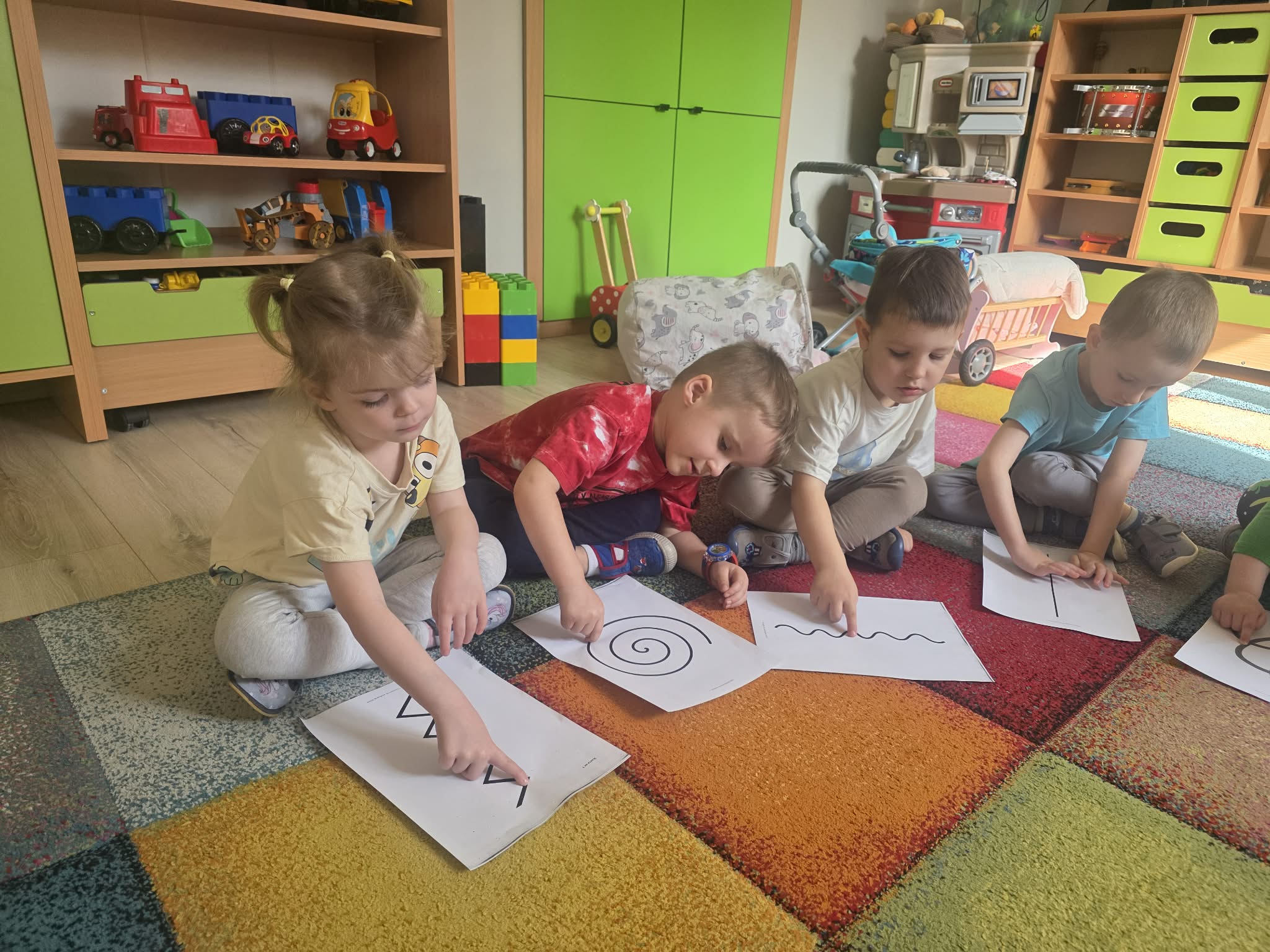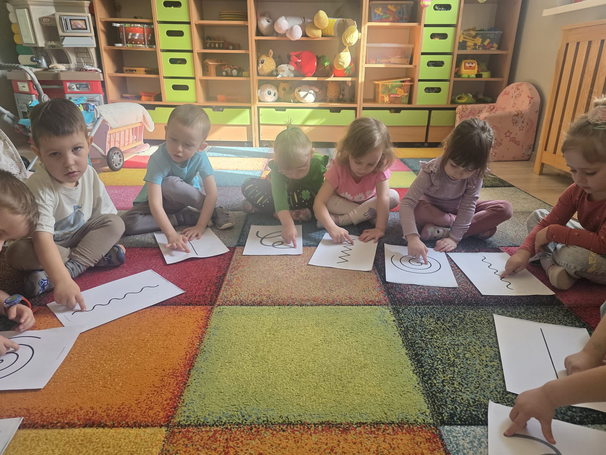 Następnie, przy dźwiękach muzyki, dzieci kreśliły palcem różne wzory, co sprawiło im wiele radości i pozwoliło na twórczą ekspresję