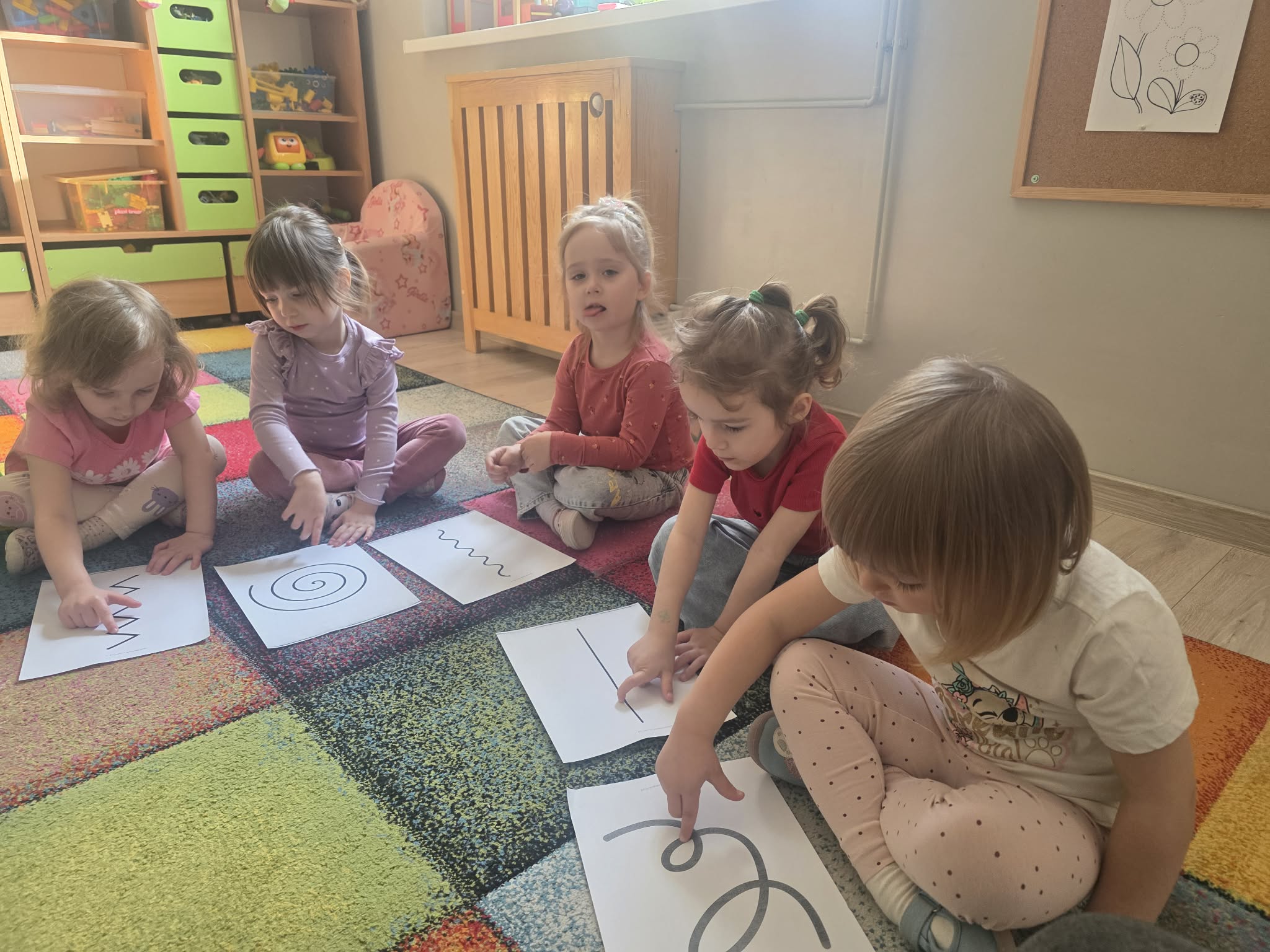 Dzieci z dużym zaangażowaniem i ciekawością poznawały różnorodne faktury, dotykały, badały i porównywały powierzchnie – od miękkich i przyjemnych po bardziej chropowate. Każde dziecko miało możliwość samodzielnego doświadczenia wszystkiego „po kolei”, rozwijając przy tym wrażliwość dotykową oraz sprawność małych rączek.