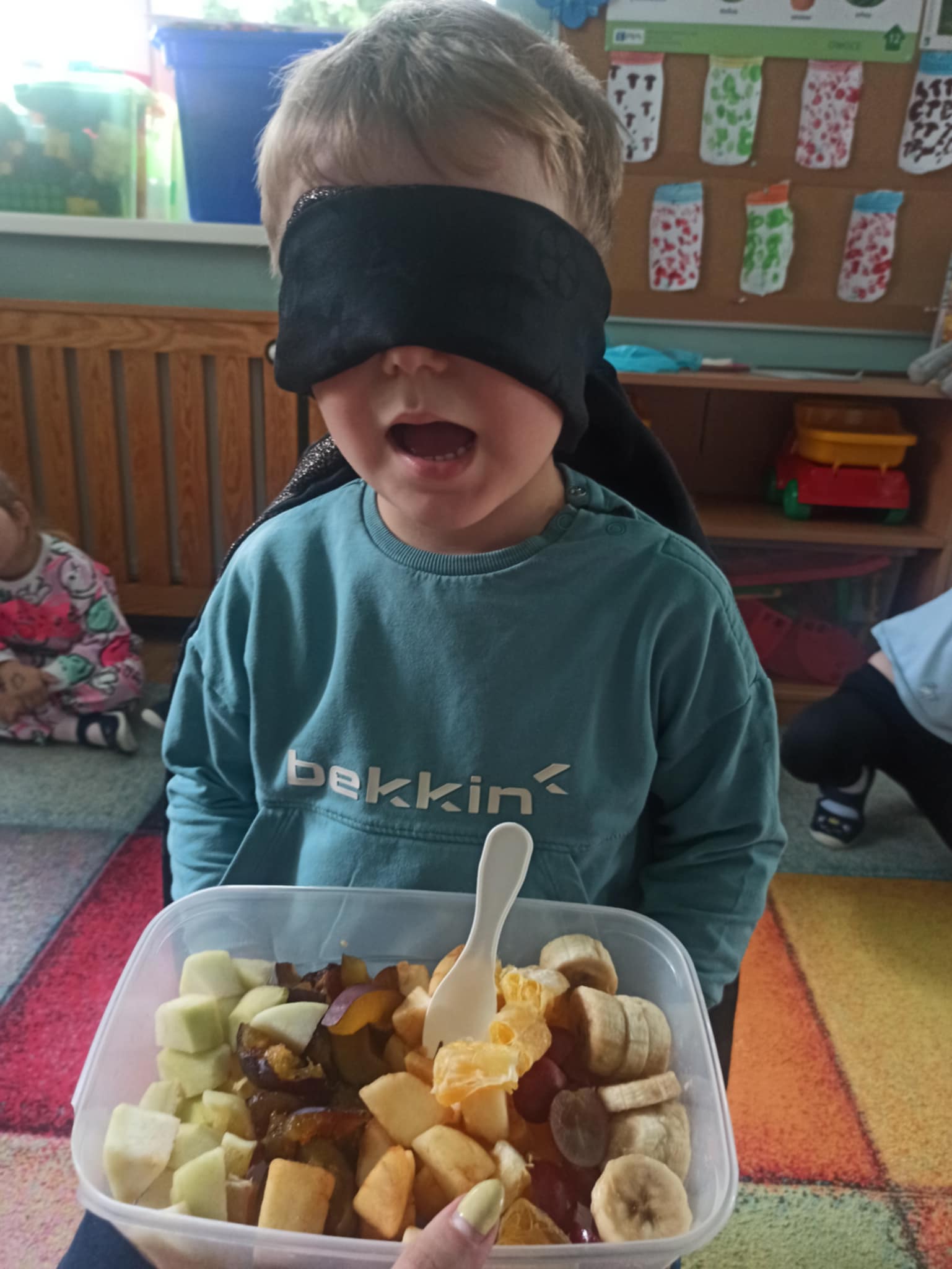 Liski uczestniczyły w zajęciach, w których za pomocą zmysłów odgadywały znane owoce. Przedszkolaki dotykały, wąchały a także opisywały cechy poszczególnych owoców. Były również uświadomione iż należy zachować zasady higieny podczas przygotowania oraz spożywania owoców. Na koniec zajęć każdy obecny Lisek zapozował do zdjęcia w jabłuszku.