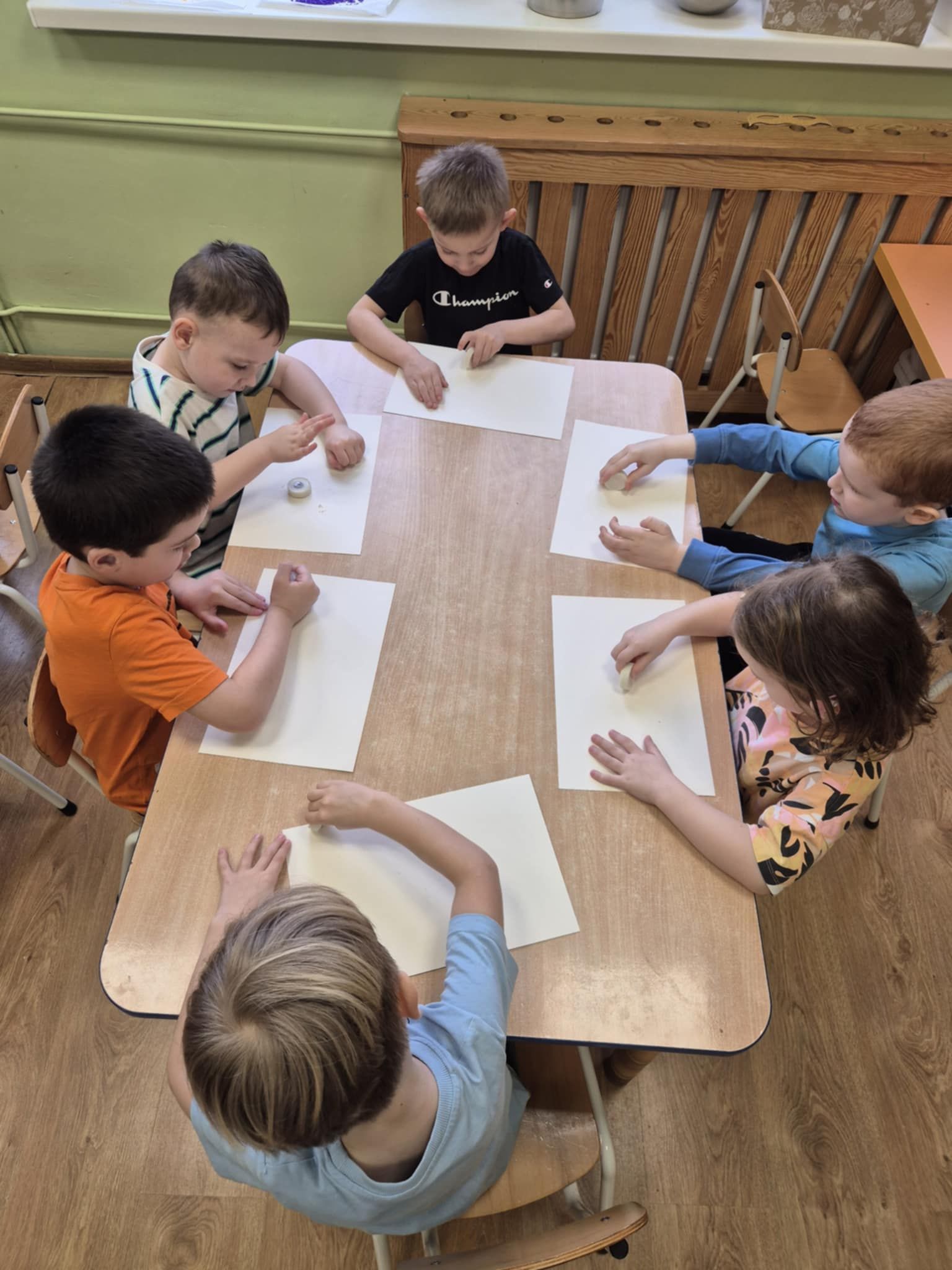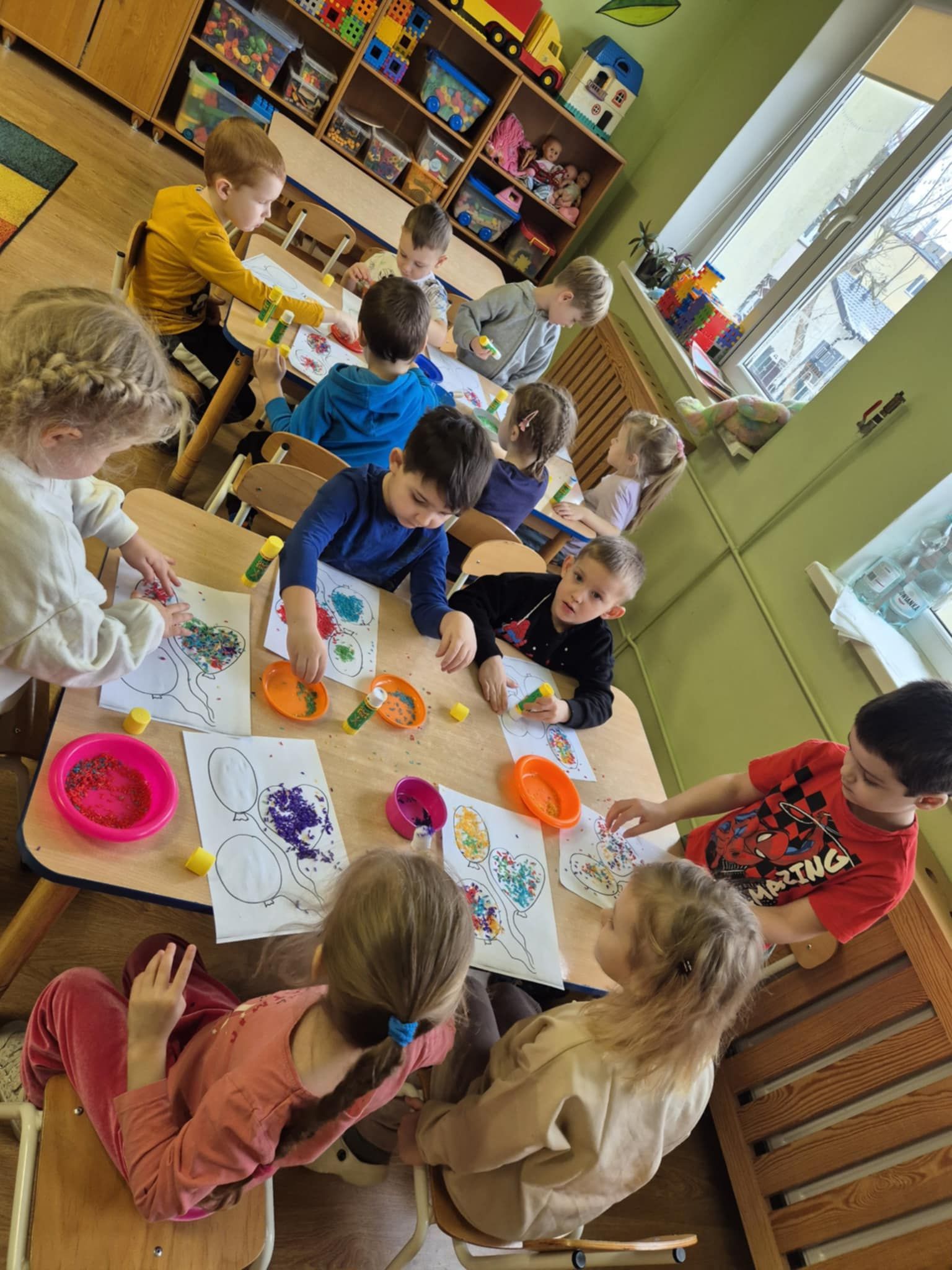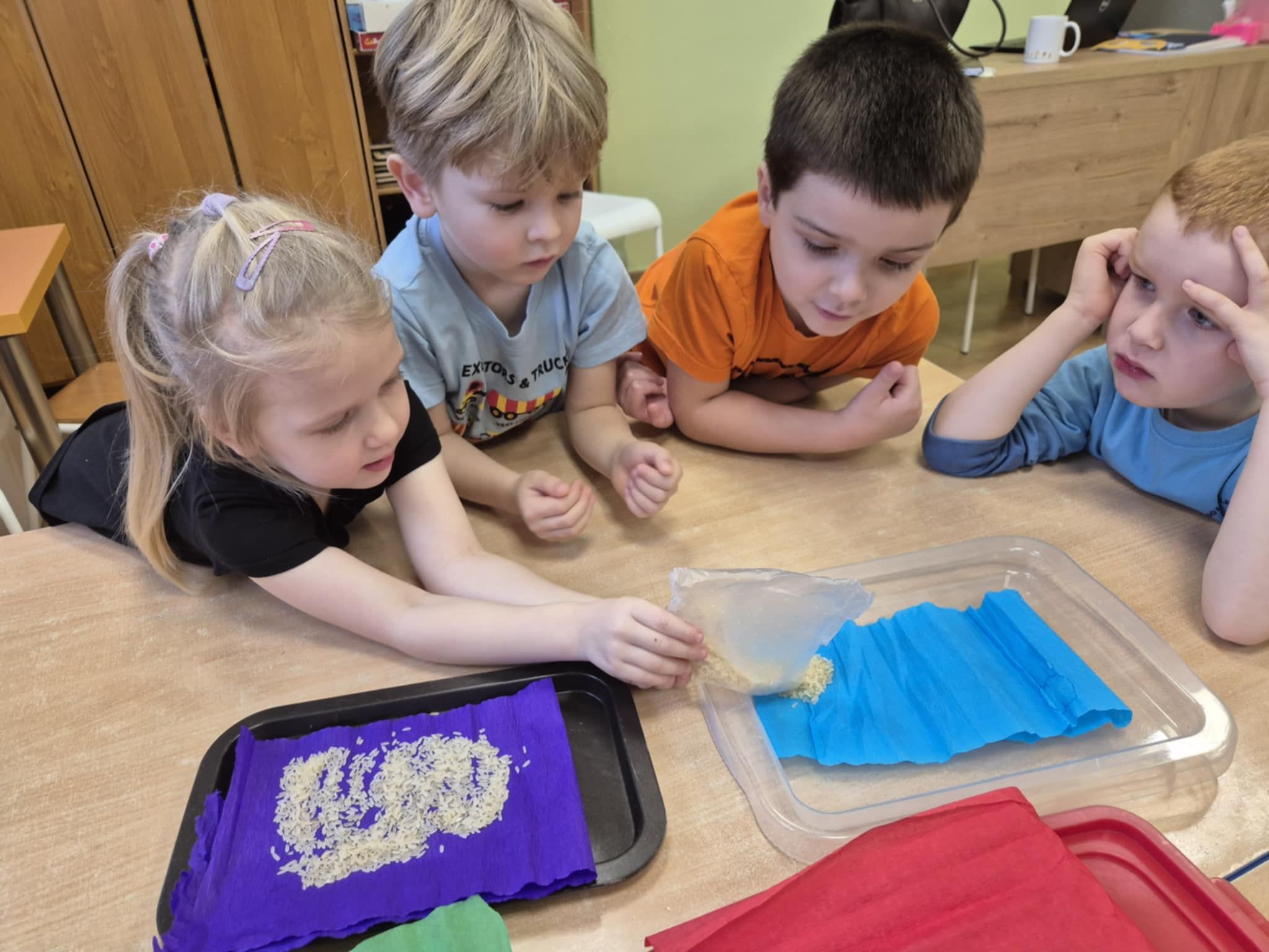 W ramach projektu plastycznego nasze przedszkolaki ostatnio samodzielnie barwiły ryż, którym wyklejały obrazki oraz malowały świecą.