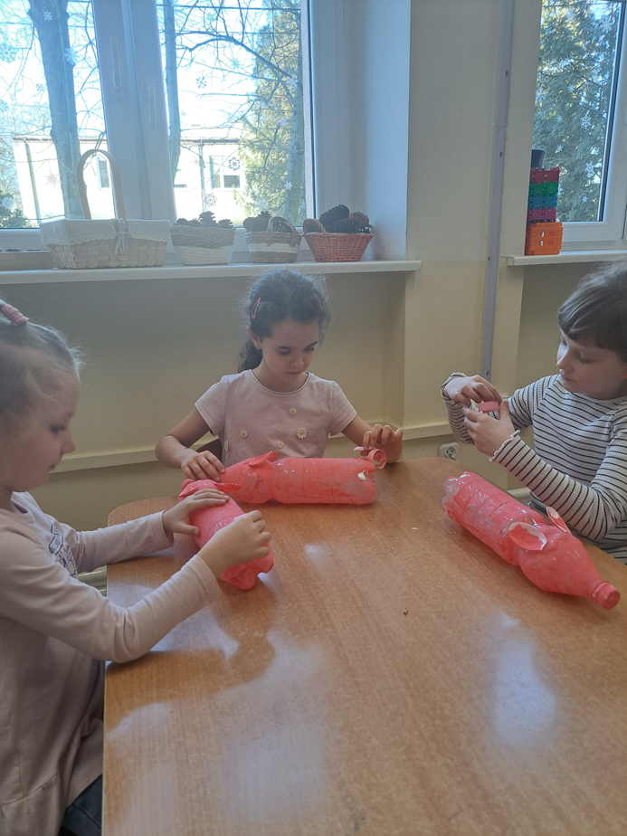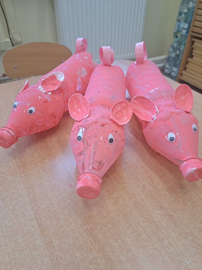 W ramach realizacji projektu edukacyjnego „MALI WIELCY ODKRYWCY” dzieci uczestniczyły w pracy zespołowej, podczas której wykonały świnki z plastikowych butelek. Zajęcia rozwijały kreatywność, współpracę oraz uczyły, jak w ciekawy sposób można wykorzystać materiały z recyklingu.