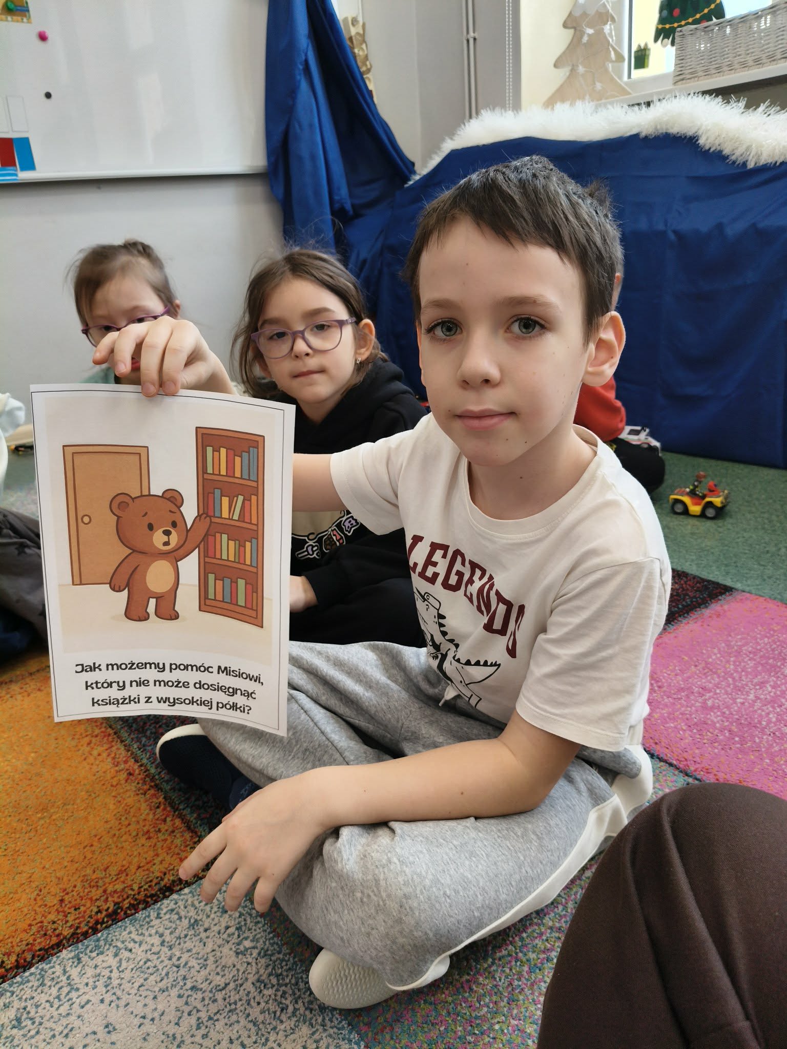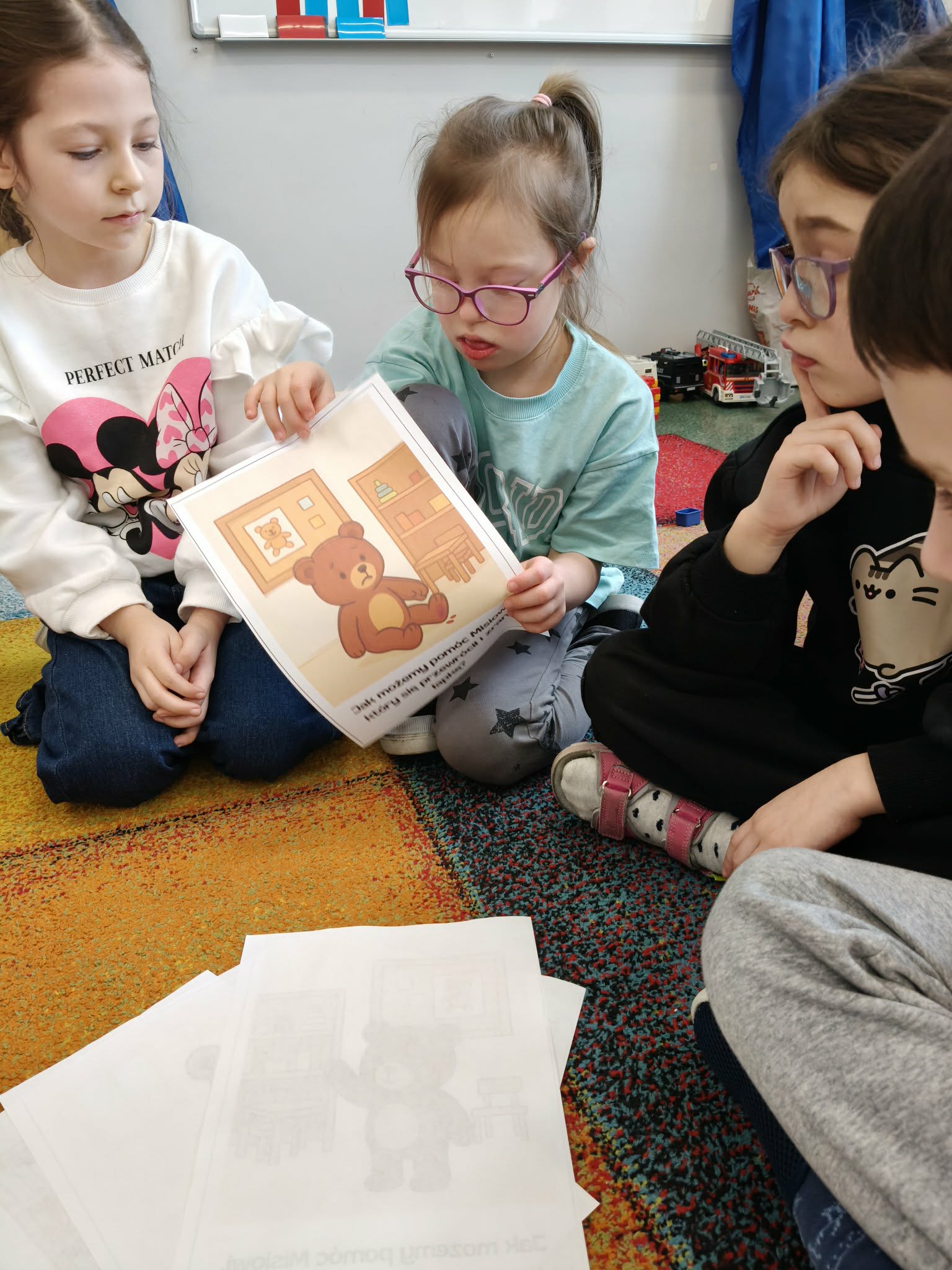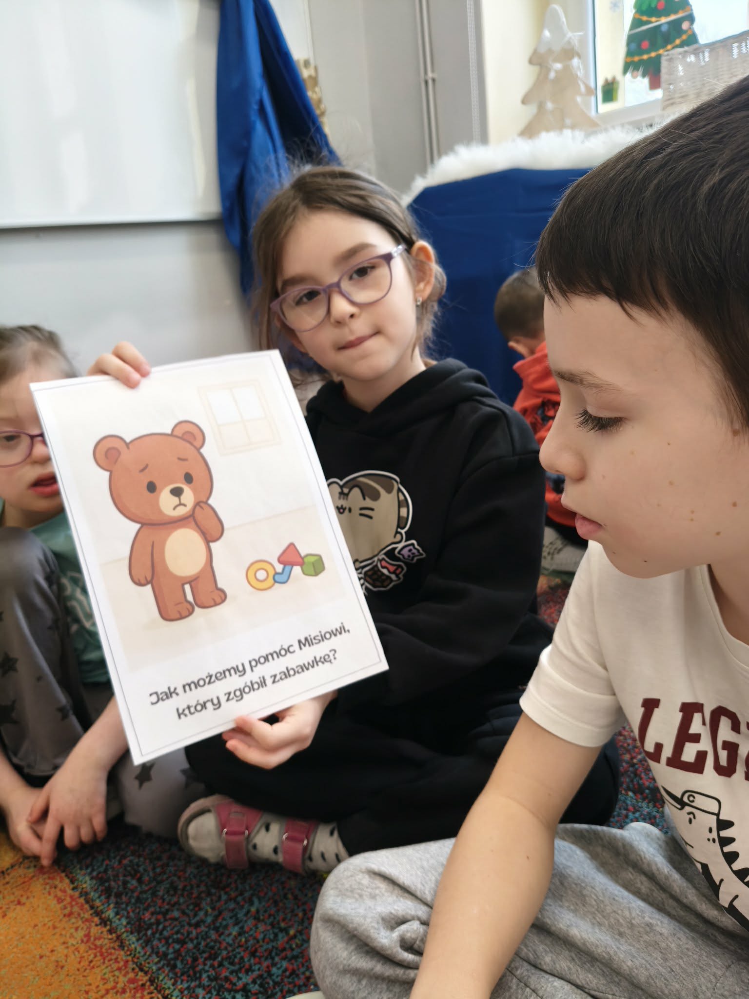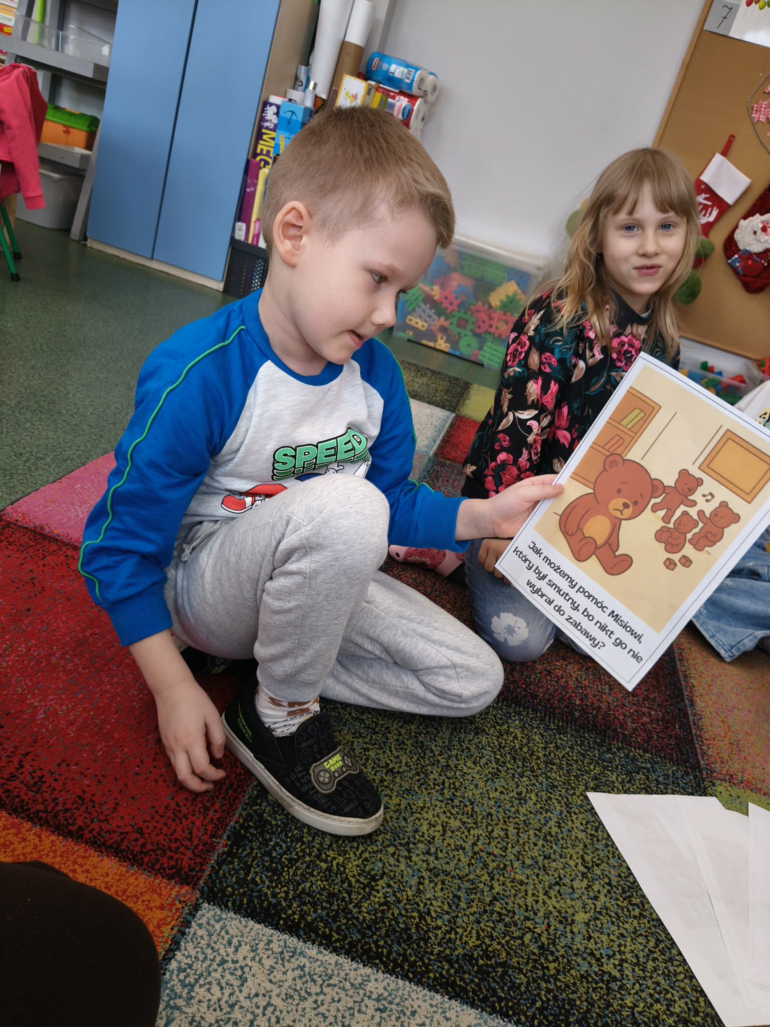 Podczas zajęć rozmawialiśmy o tym jak ważną wartością jest niesienie pomocy potrzebującym. Dzieci rozwijały w sobie poczucie empatii, podczas rozwiązywania zadań problemowych. Podawały różne sposoby pomocy misiowi, który jej potrzebował w sytuacjach z życia codziennego. Dzieci uczyły się rozumienia emocji innych osób, dostarczania wsparcia i okazywania troski.