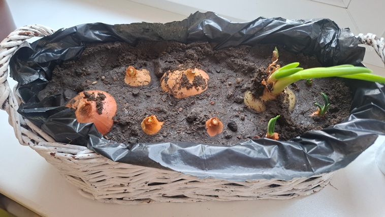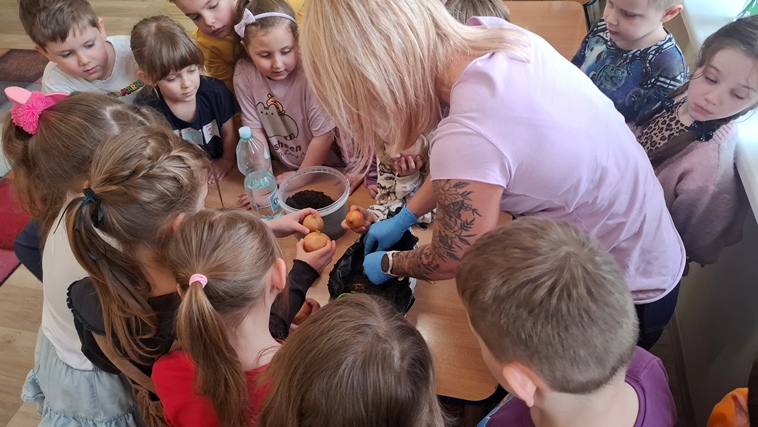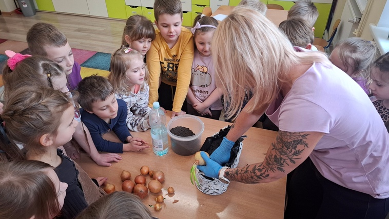 Przedszkolaki sadziły cebulę. Poznały etapy wzrostu cebuli.