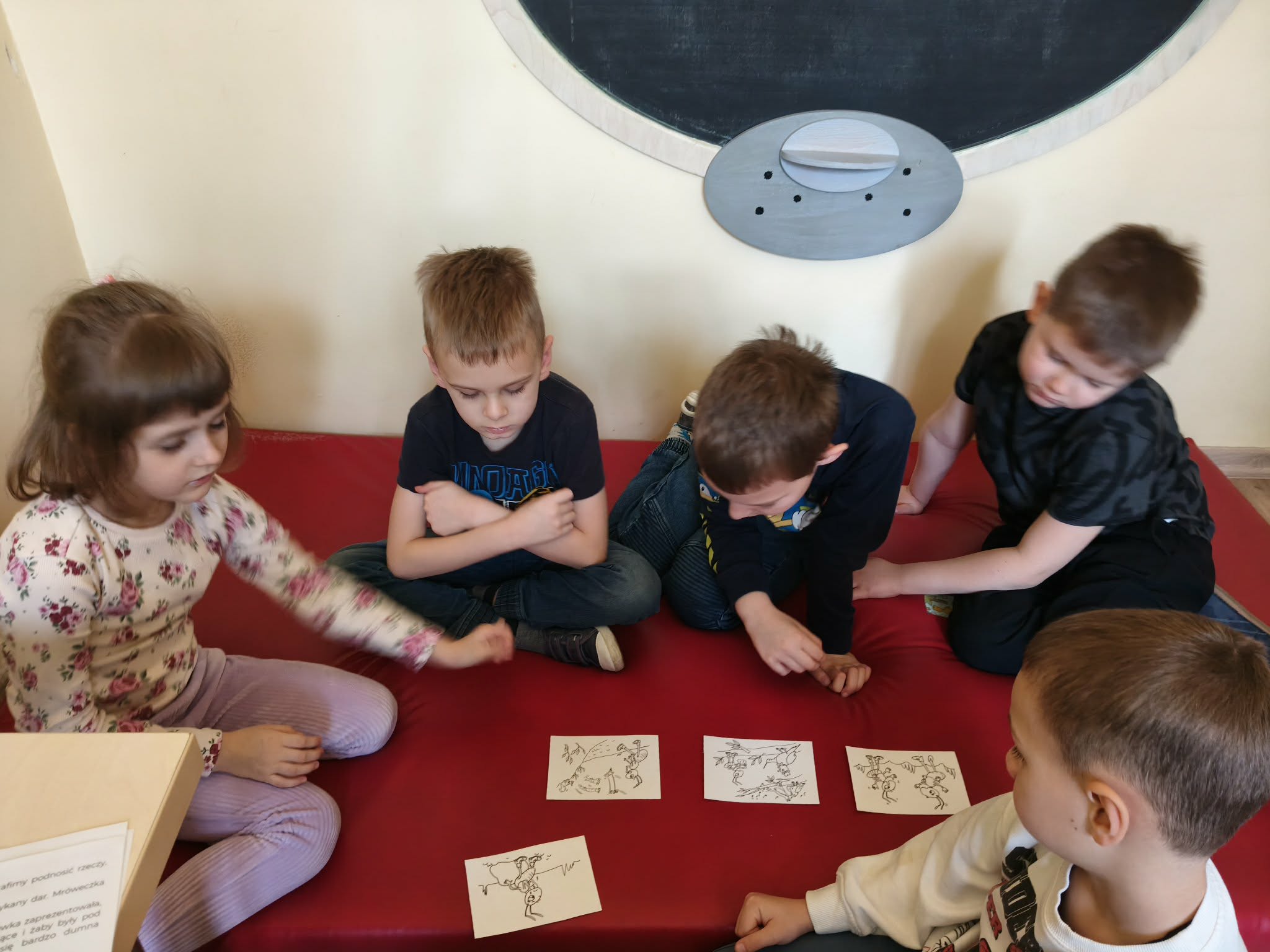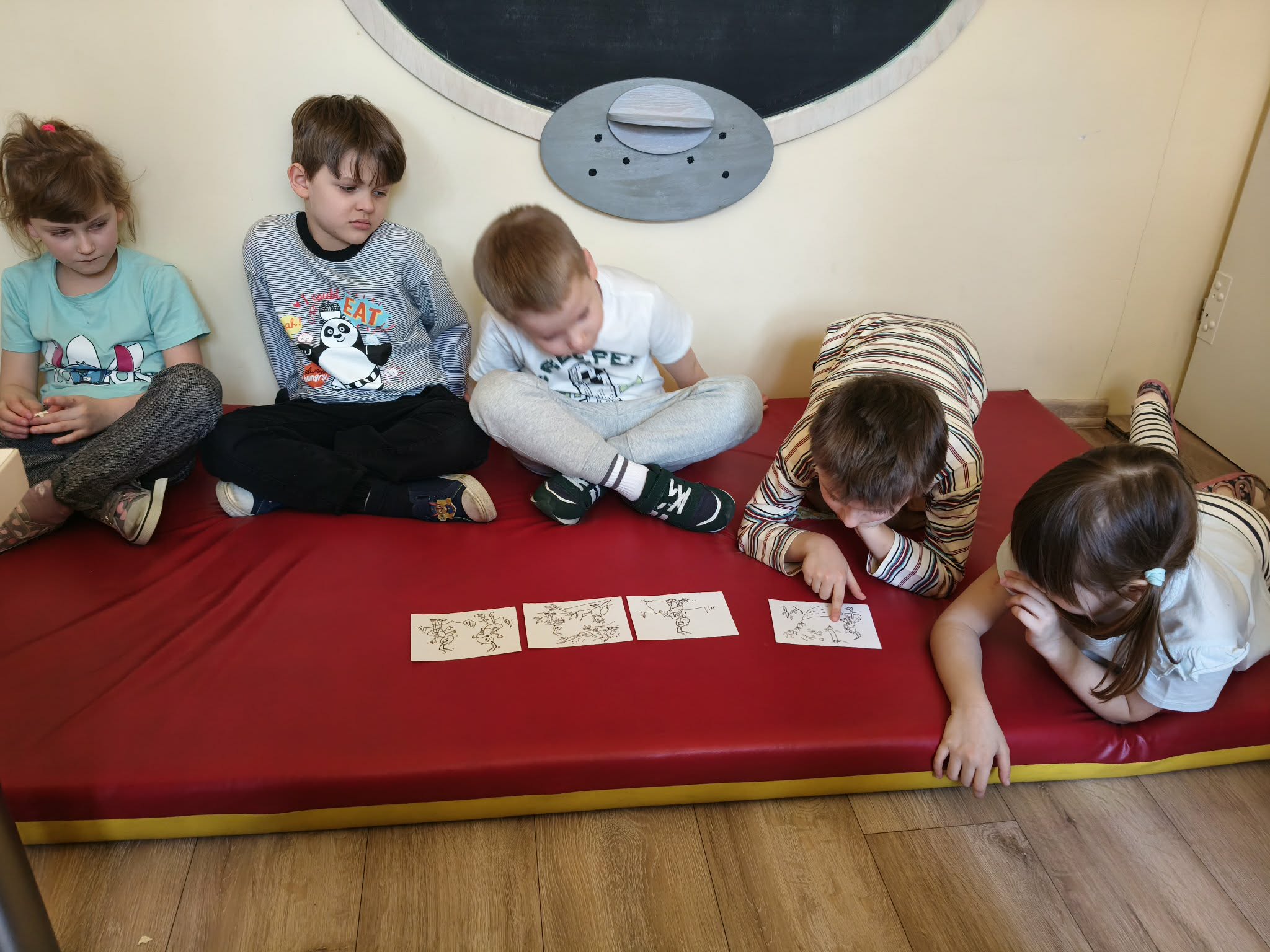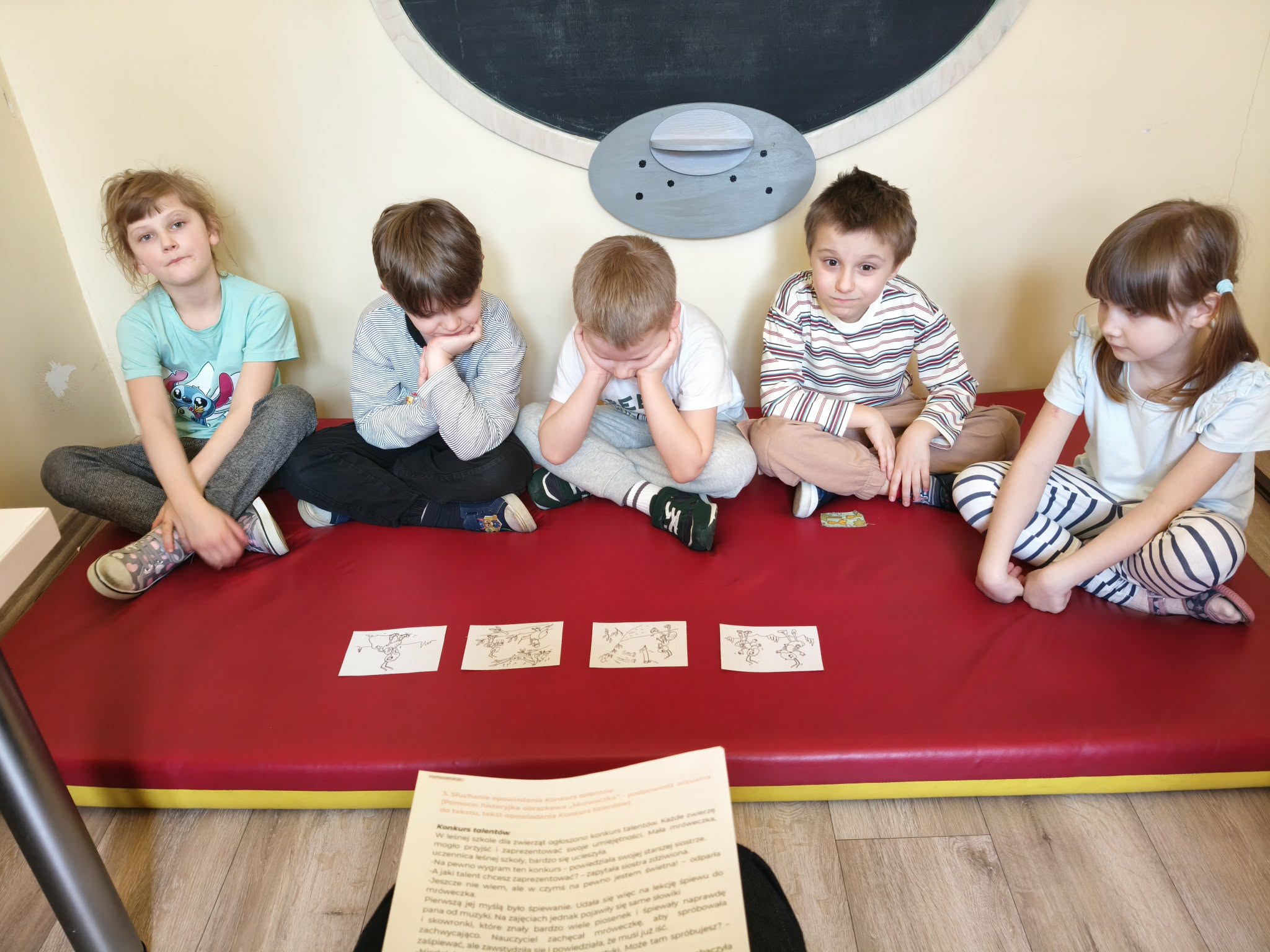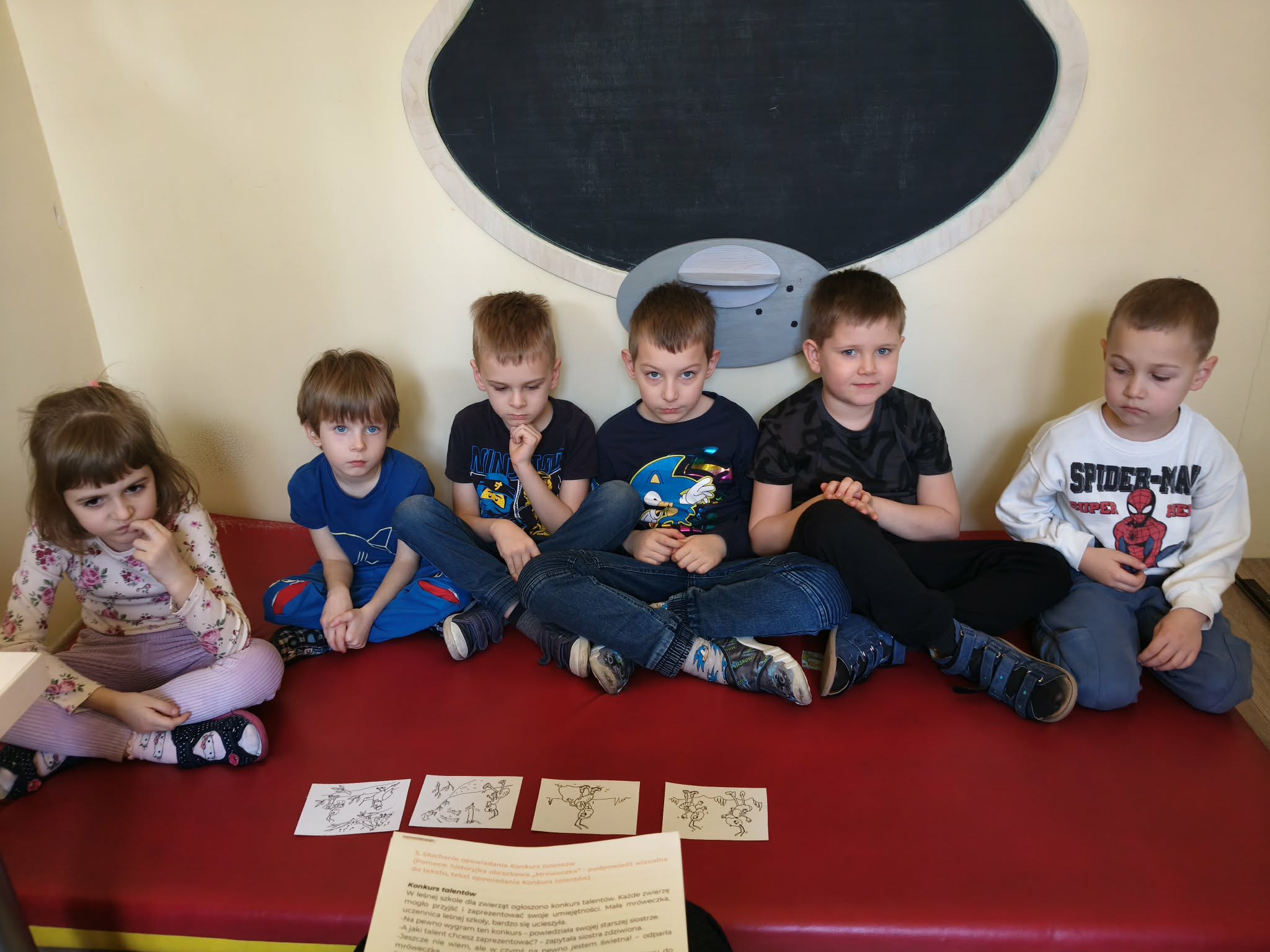 Podczas zdzisiejszych zajęć TUS dzieci rozmawiały o swoich talentach/umiejętnościach. Wspólnie uznały, że każdy z nas jest najlepszy w czymś innym. Następnie wysłuchały opowiadania pt.:"Konkurs talentów". Udzielały odpowiedzi na pytania do poznanego tekstu. Wspólnie układały historyjkę odrazkową, zgodnie z kolejnością zdarzeń. Uczestniczyły w zabawie ruchowej z elementami dramy, przekazywały sobie kostkę w okreslony sposób (jako goracą, ciężką, lepiącą, itp.). Otrzymał również kartę pracy do wykonania w domu.