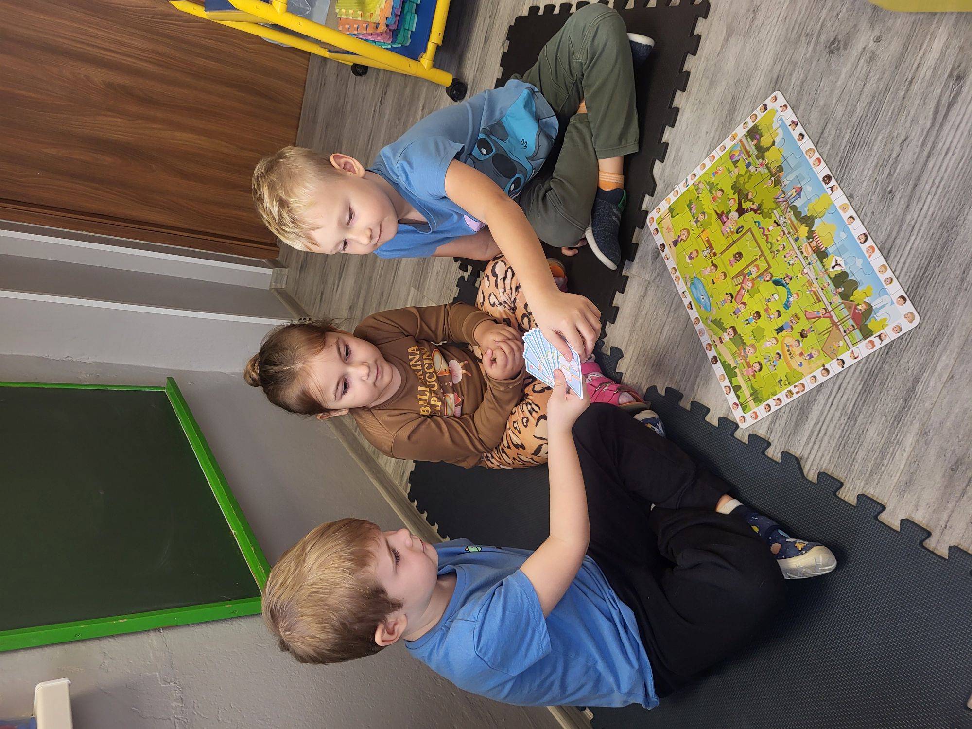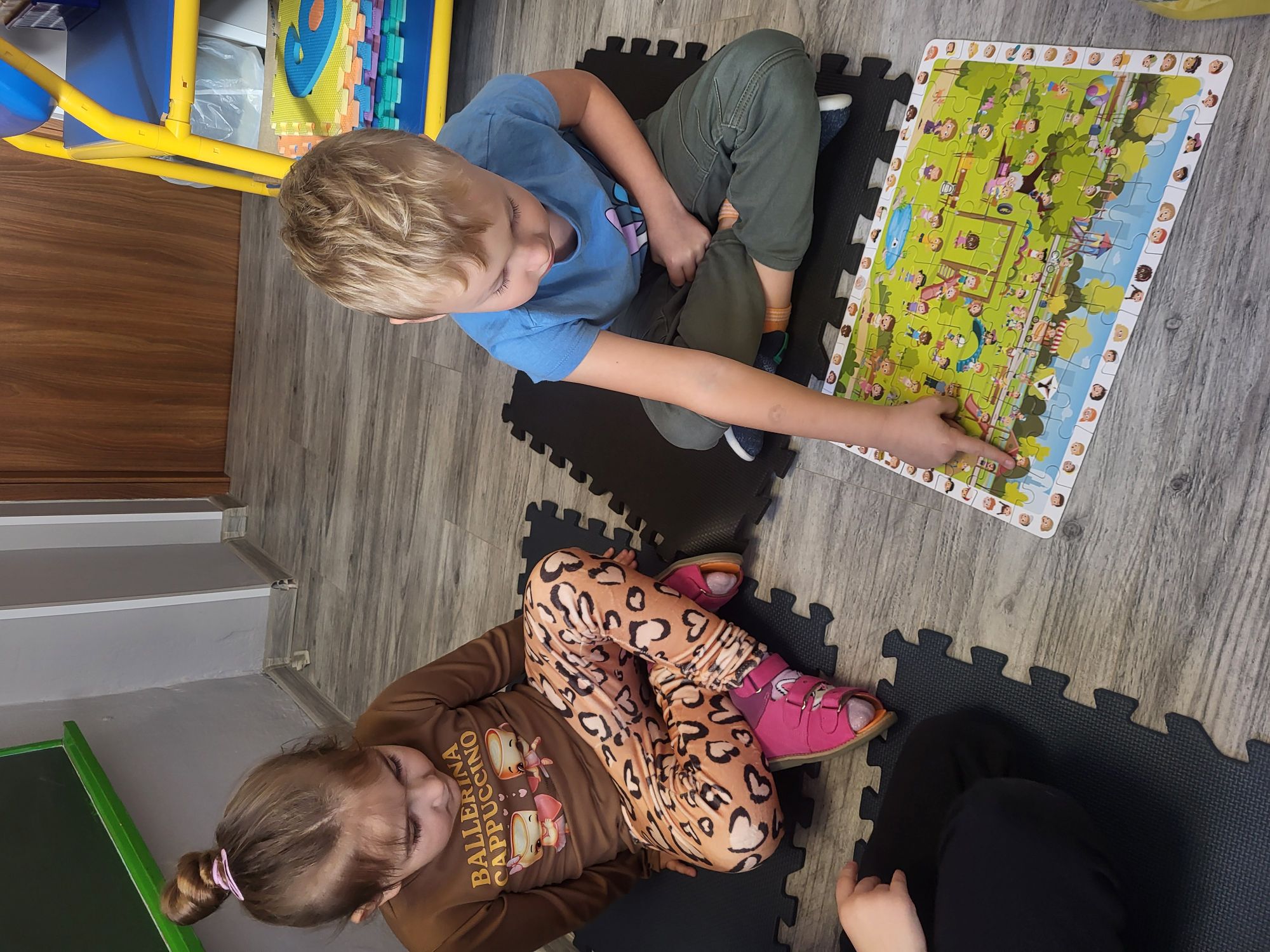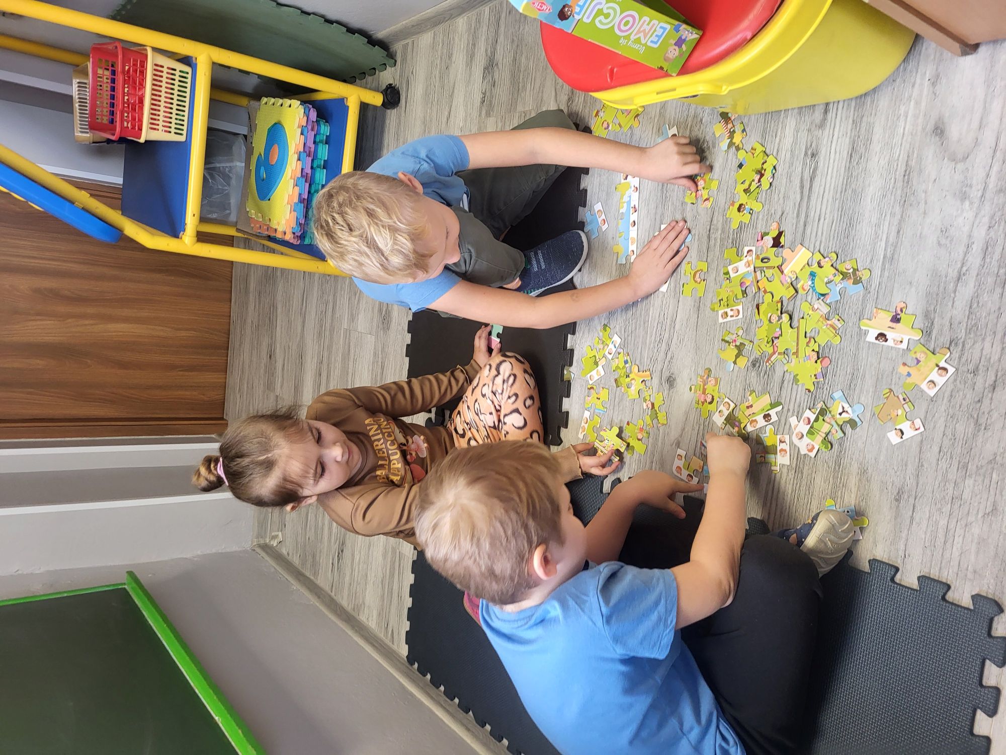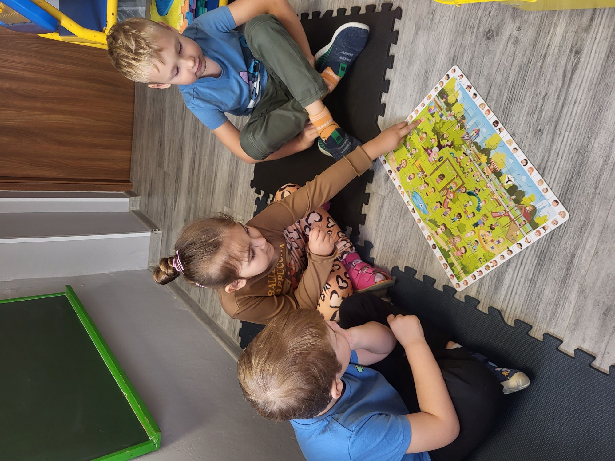 Podczas dzisiejszych zajęć TUS dzieci uczyły się współpracy, czekania na swoją kolej oraz pomagania sobie w trakcie wykonywania zadań. Wyszukiwały, liczyły, zgadywały, rozmawiały o emocjach dzieci widocznych na układance oraz rozwijały umiejętności percepcyjne przy wspólnej zabawie.