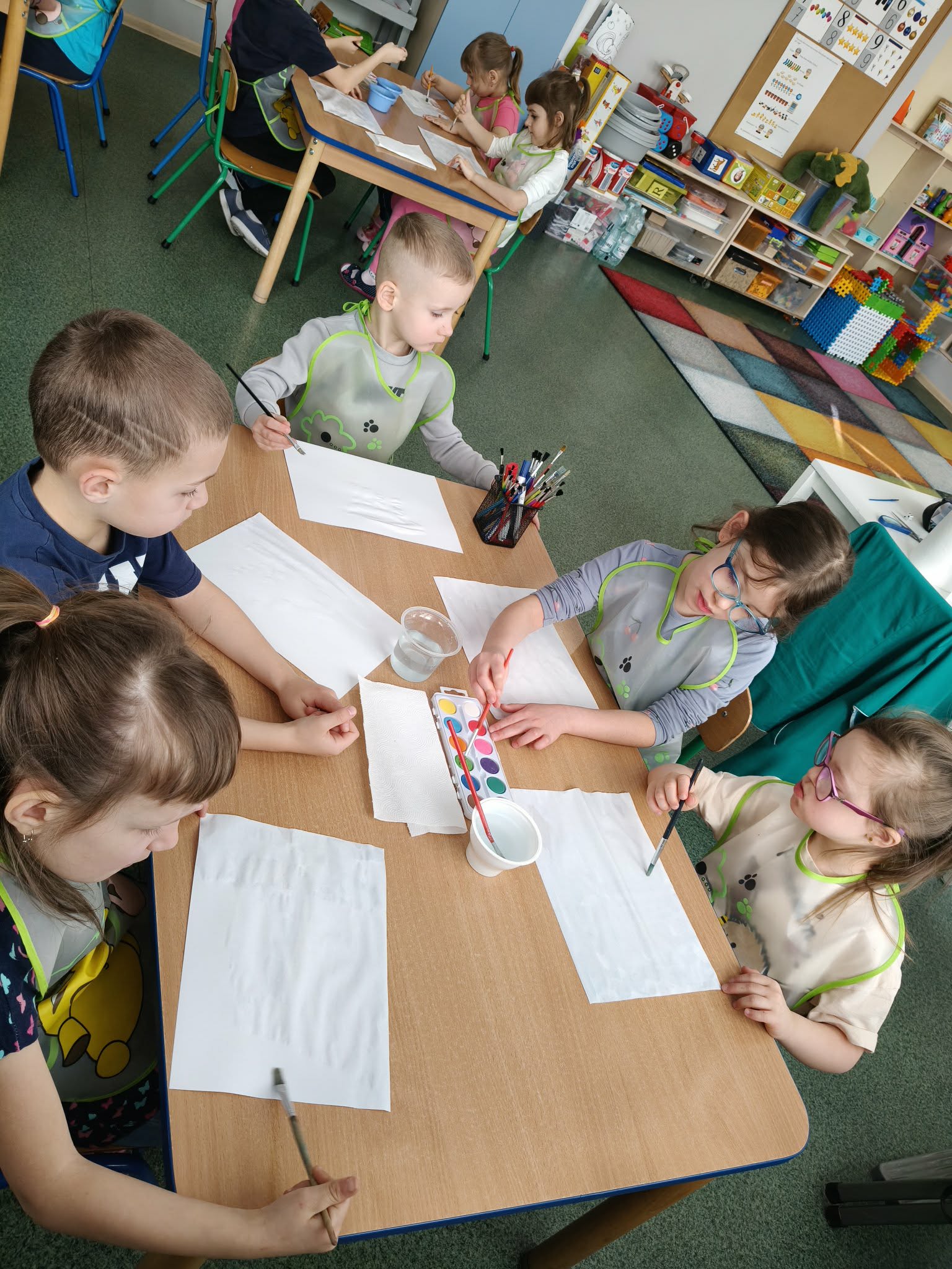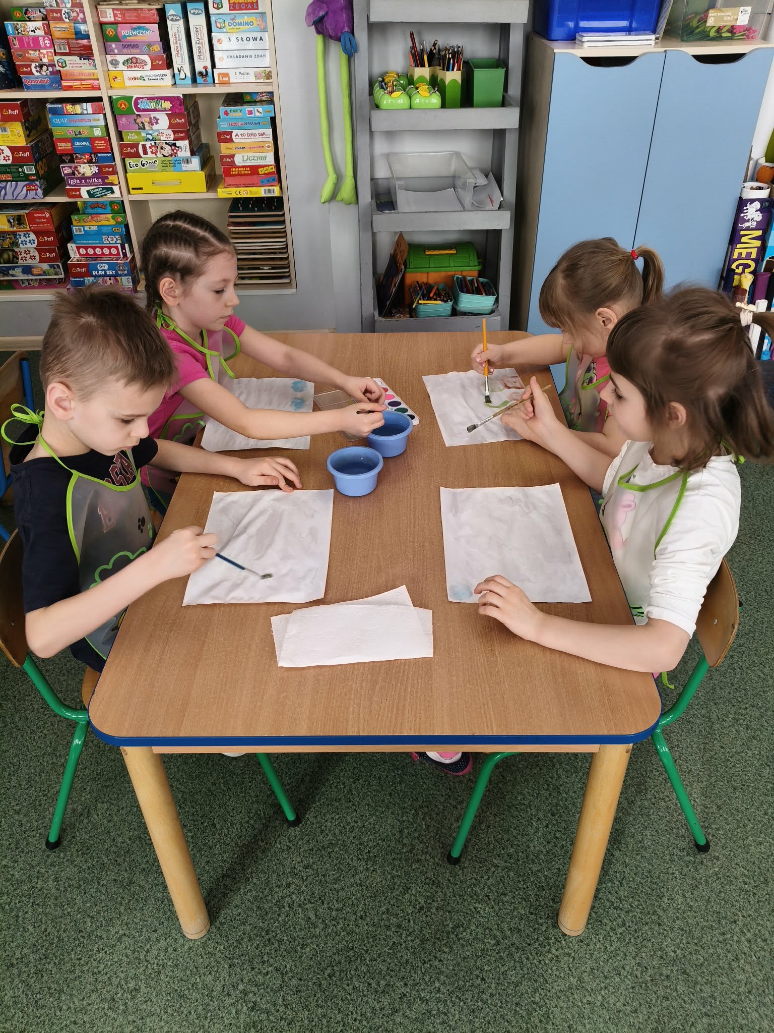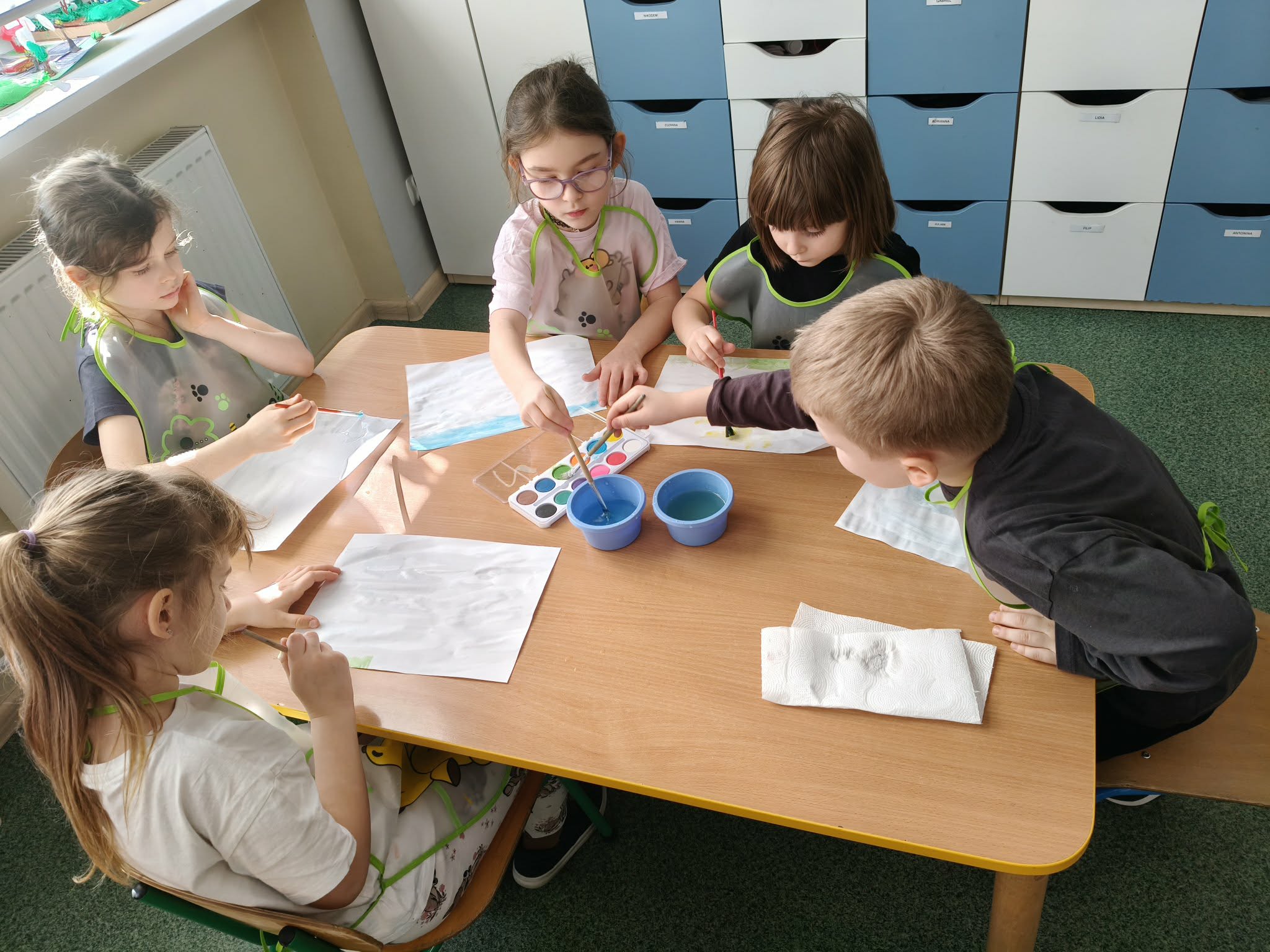 Dzieci podczas zajęć plastycznych malowały wiosenny pejzaż, metodą "mokre w mokrym".