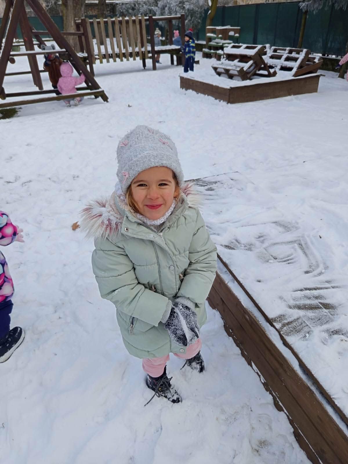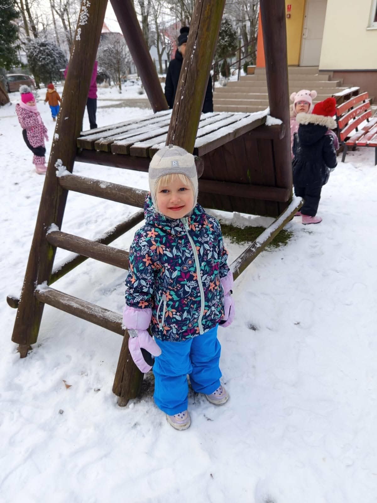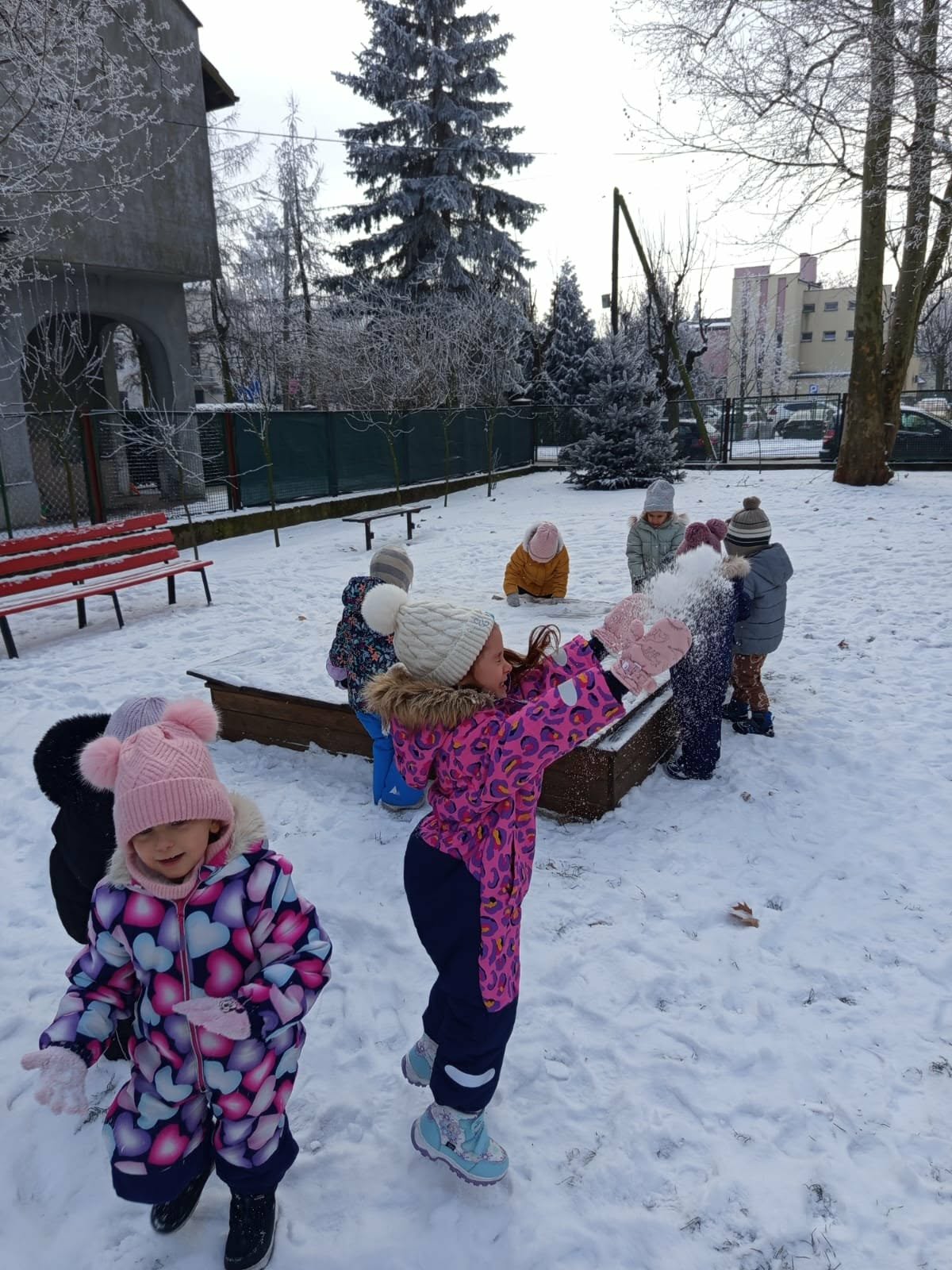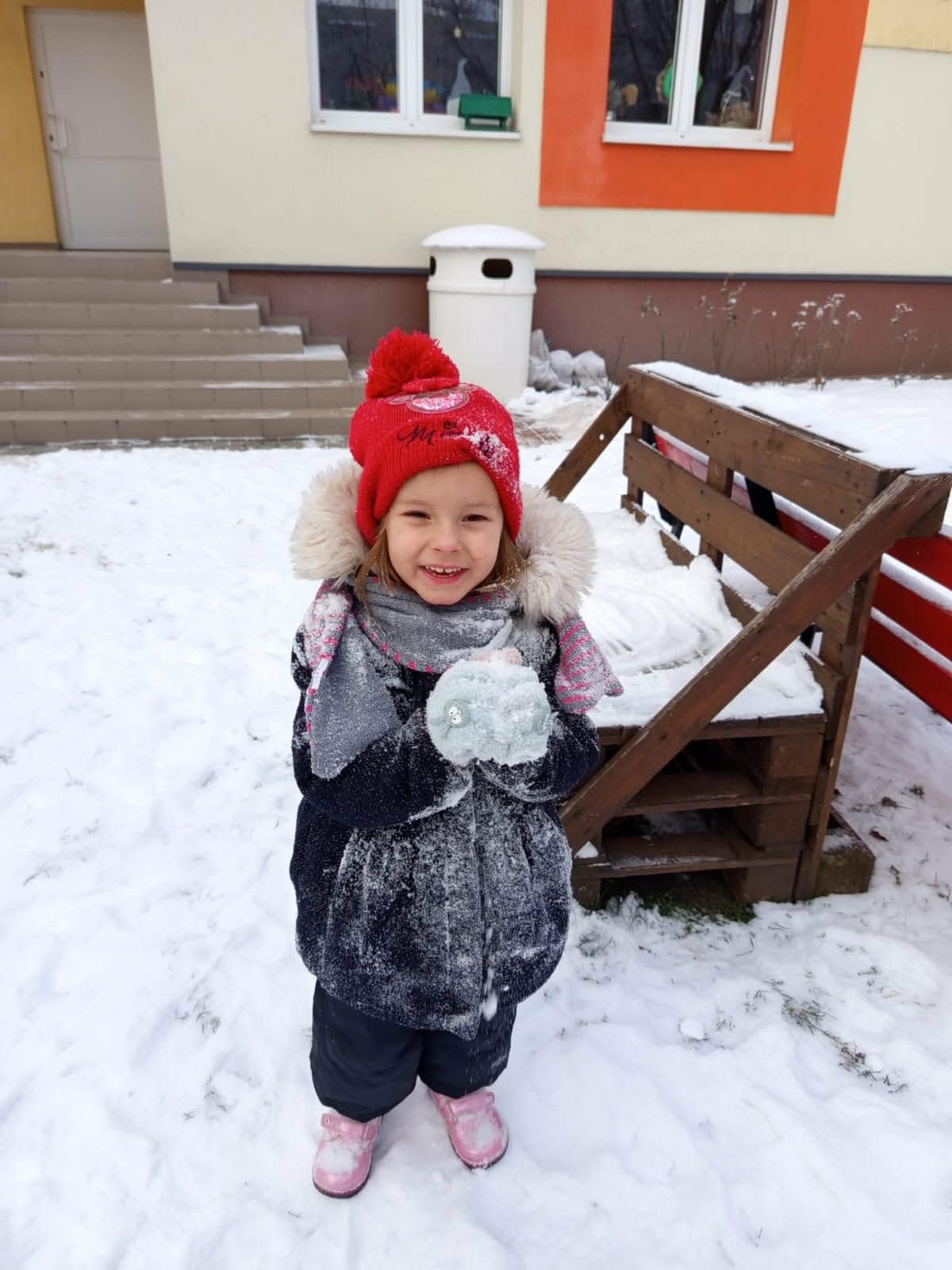Biały puszek pozwolił na zabawy w ogrodzie przedszkolnym. Przedszkolaki szalały z radości, rzucały się śnieżkami, lepiły bałwanki, robiły orzełki, turlały się po śniegu, chodziły po swoich śladach a uśmiechy nie schodziły im z twarzy.