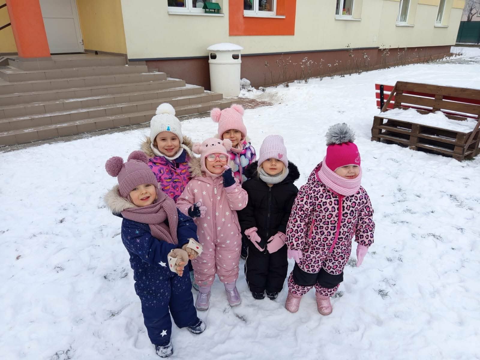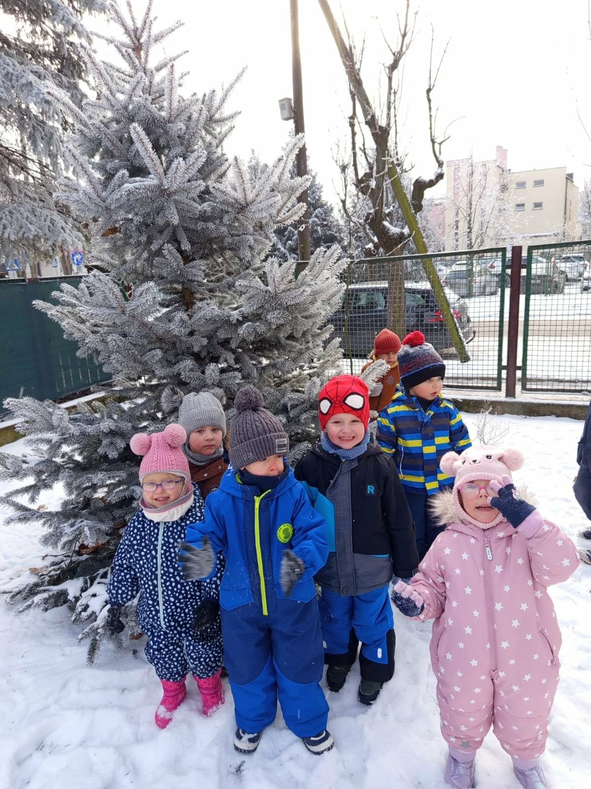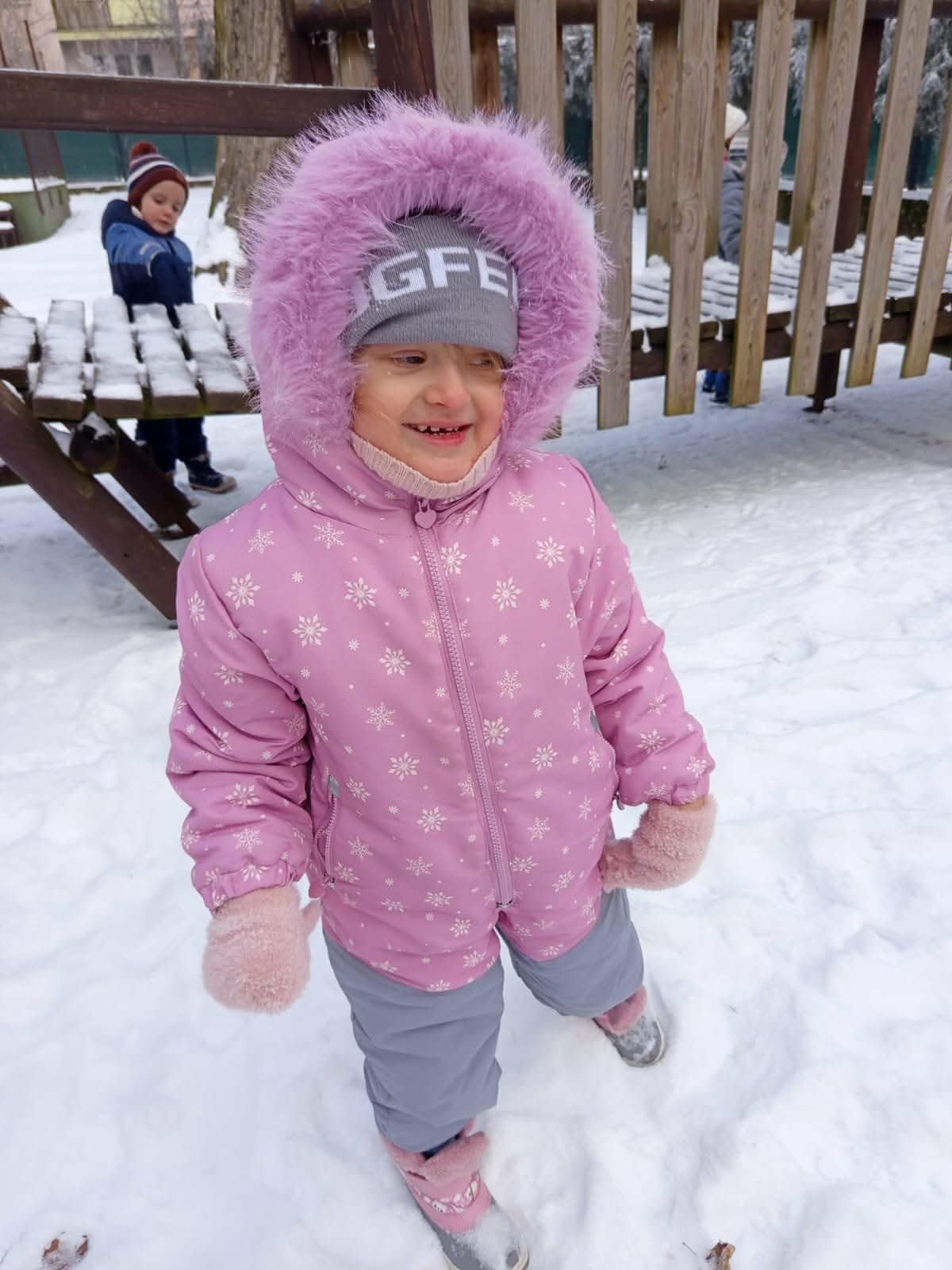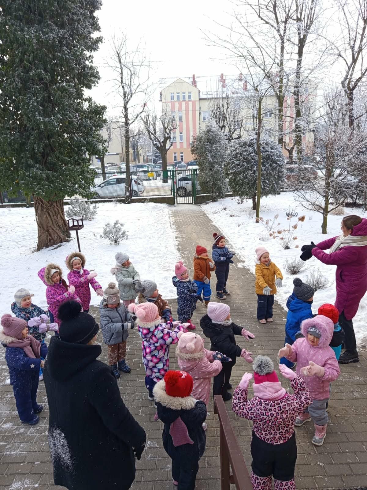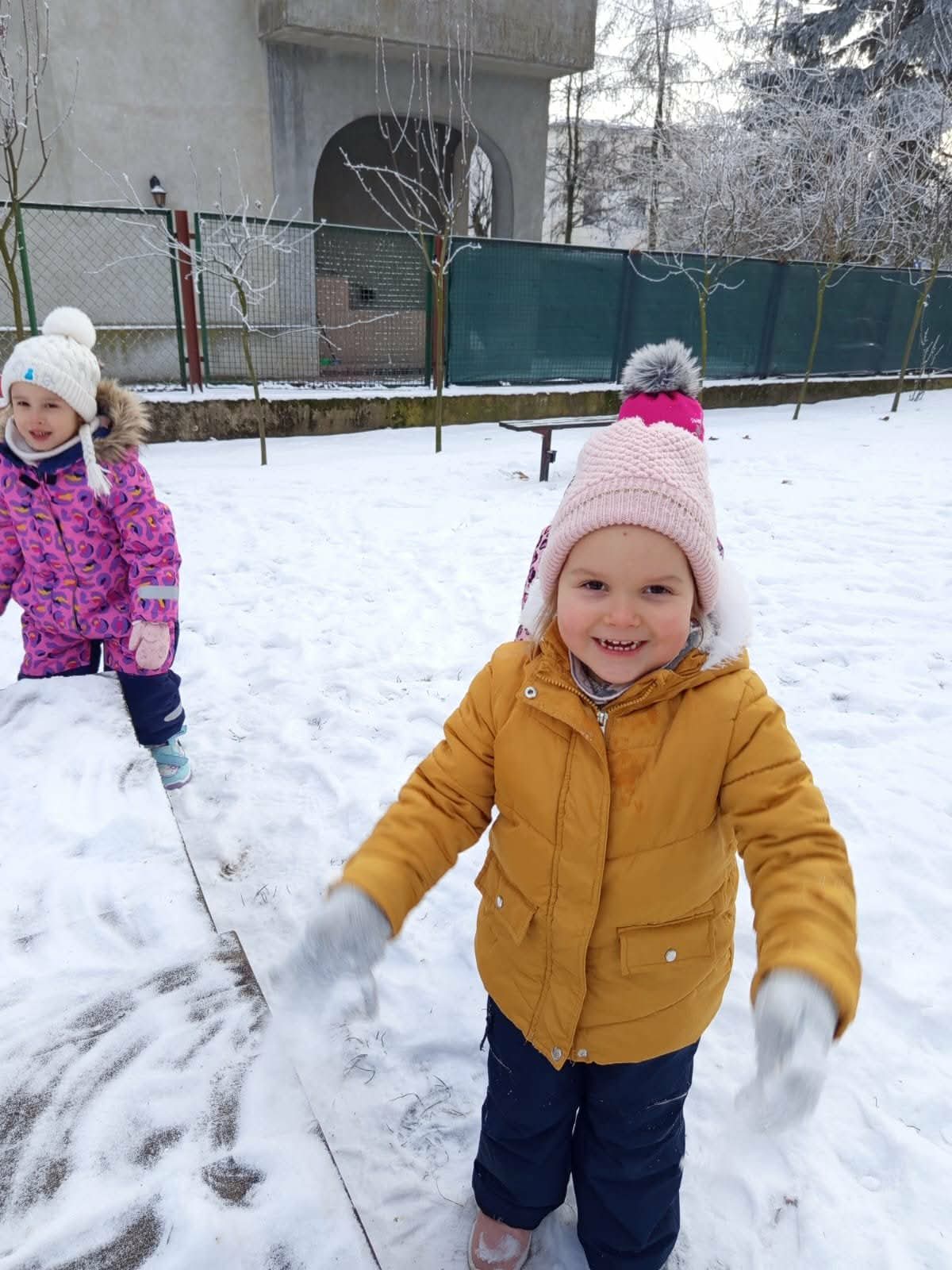 Biały puszek pozwolił na zabawy w ogrodzie przedszkolnym. Przedszkolaki szalały z radości, rzucały się śnieżkami, lepiły bałwanki, robiły orzełki, turlały się po śniegu, chodziły po swoich śladach a uśmiechy nie schodziły im z twarzy.