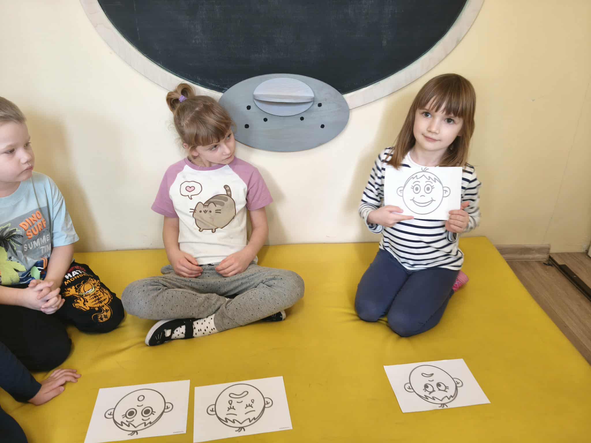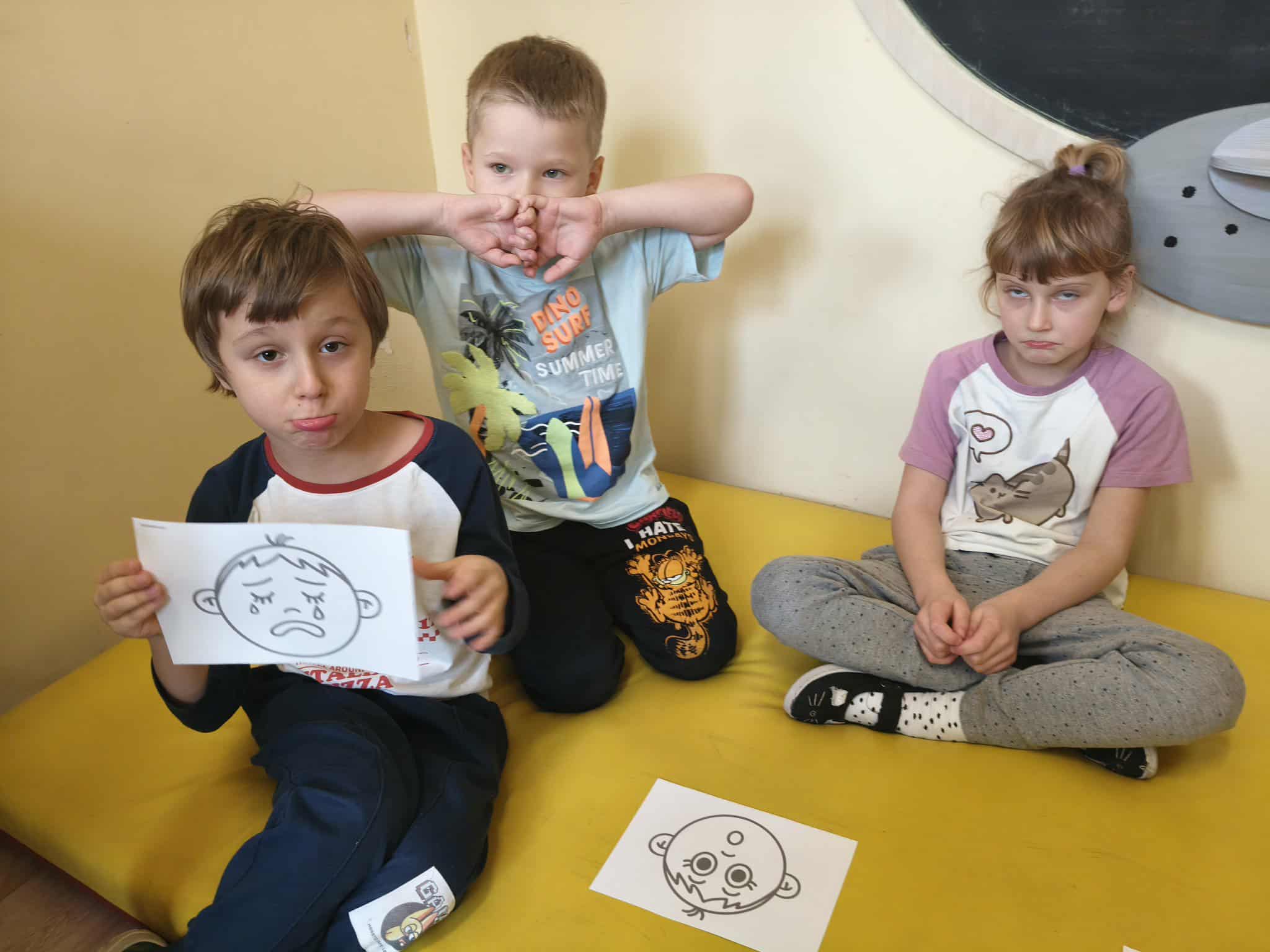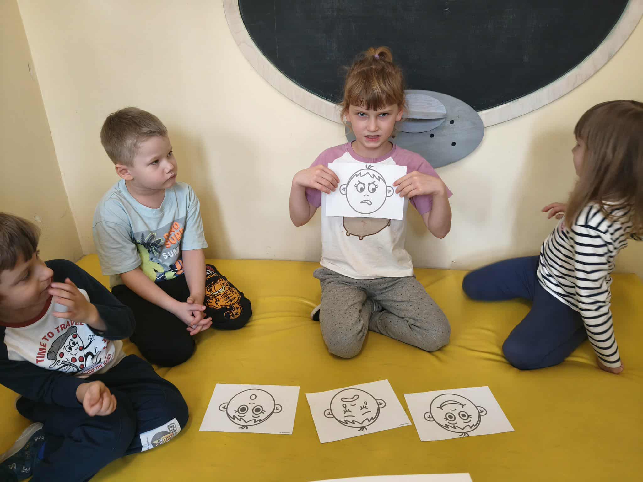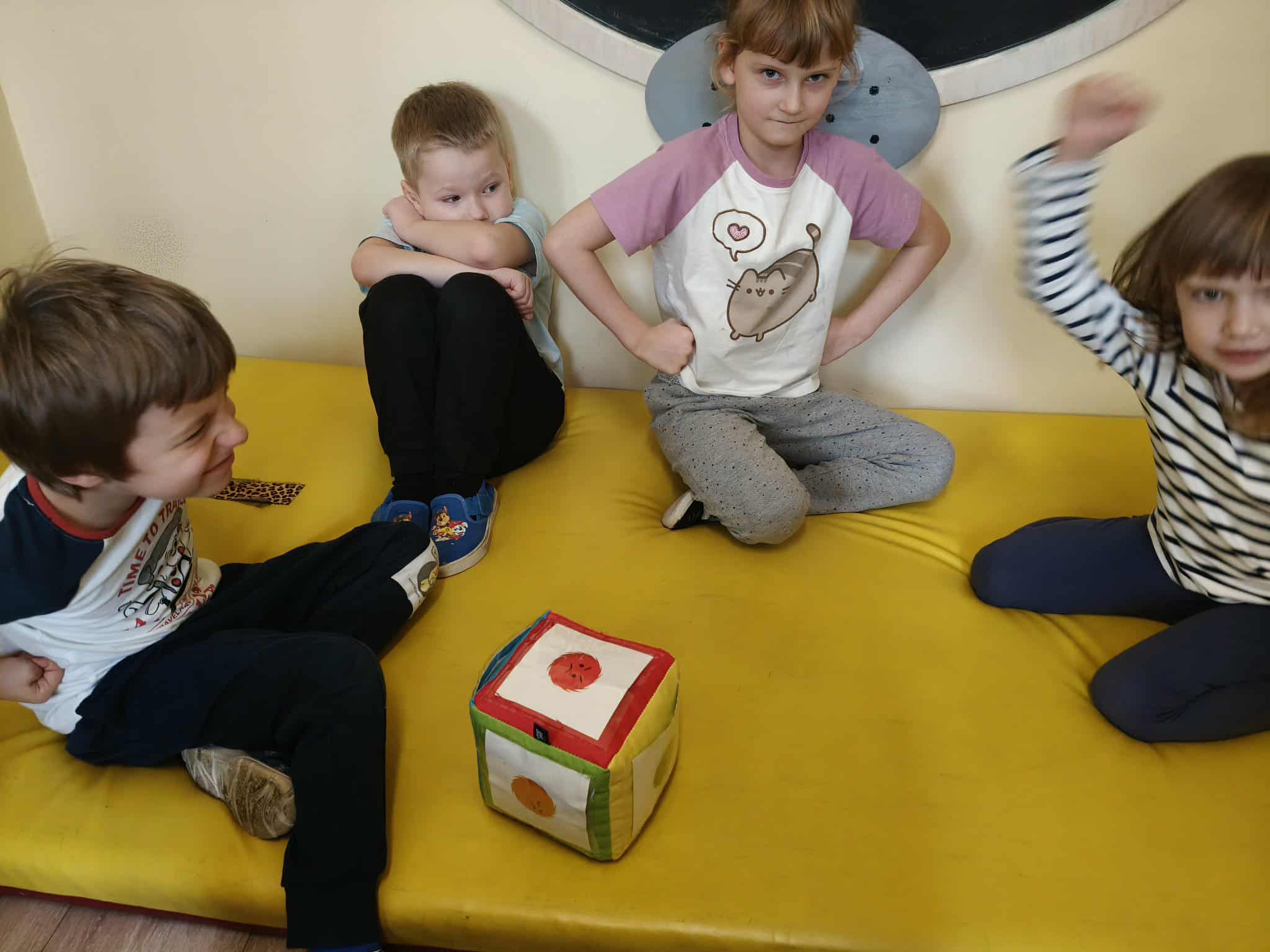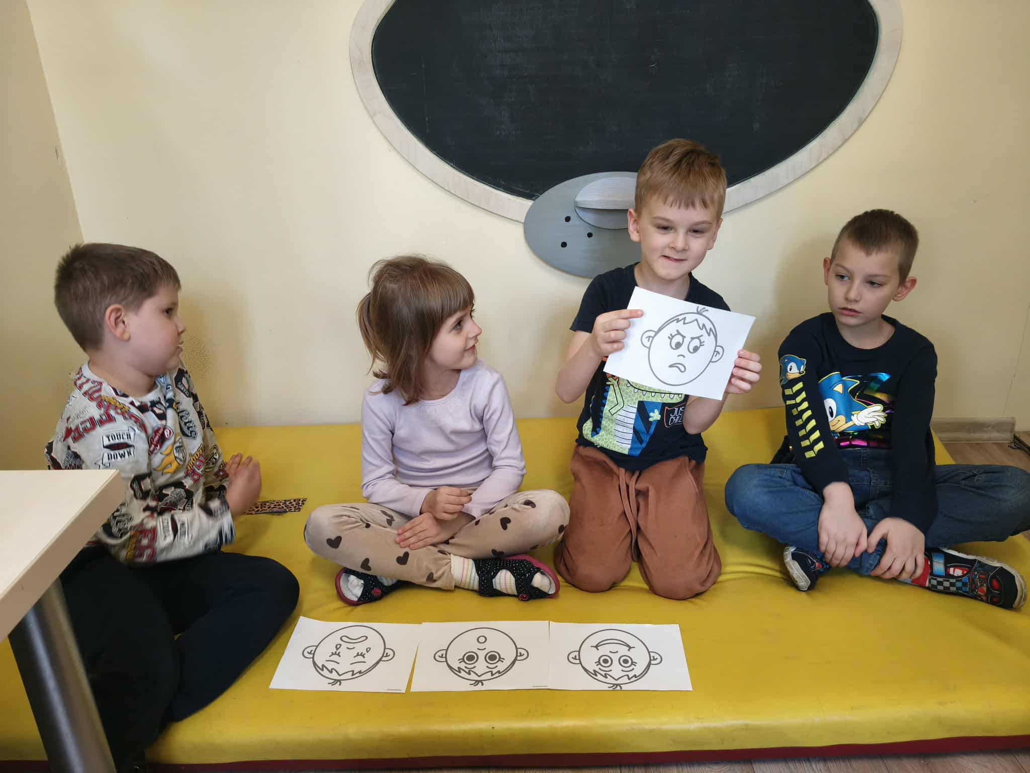 Podczas zajęć TUS dzieci poznawały emocje tj.: radość, smutek, złość, strach. Dzieci uczestniczyły w zabawach: Kalambury z bombą, Układanki emocji, Kostka z emocjami. Podczas zabaw rozwijały umiejetność współdziałania, aktywizowały procesy twórcze, ćwiczyły uwagę i percepcję słuchową.