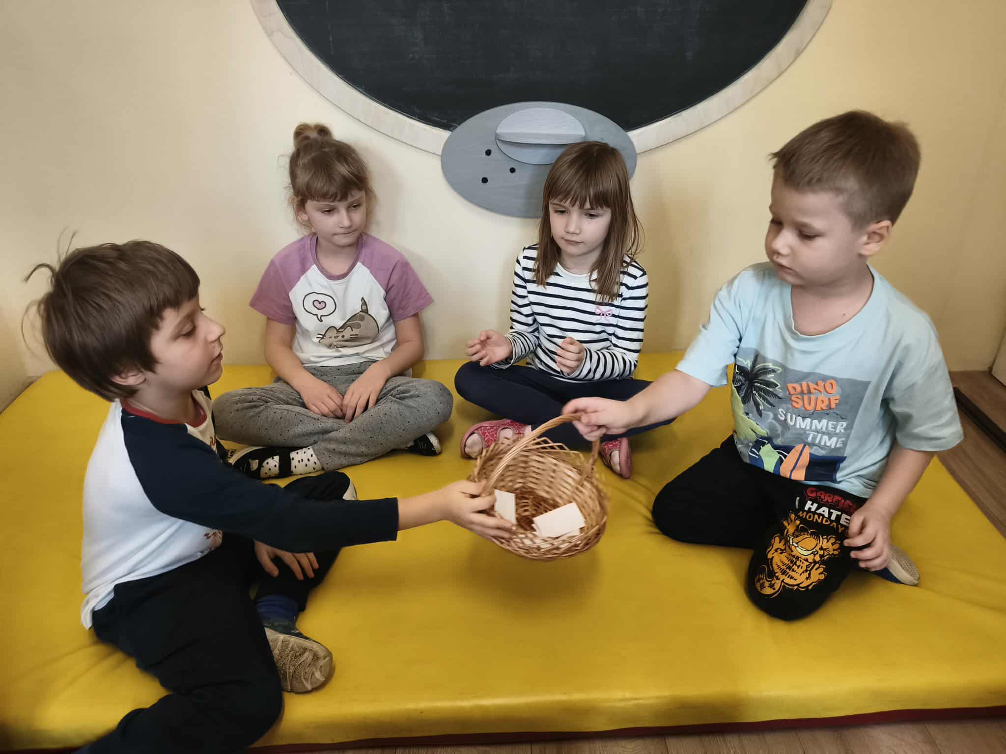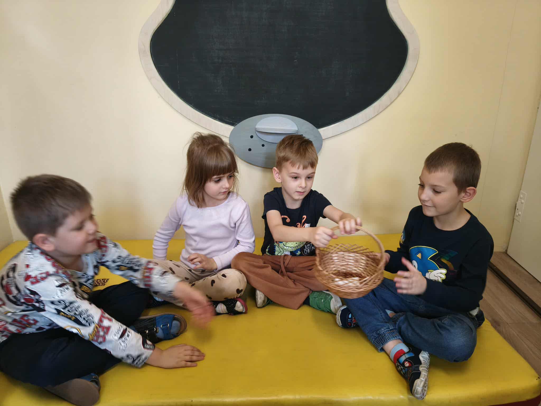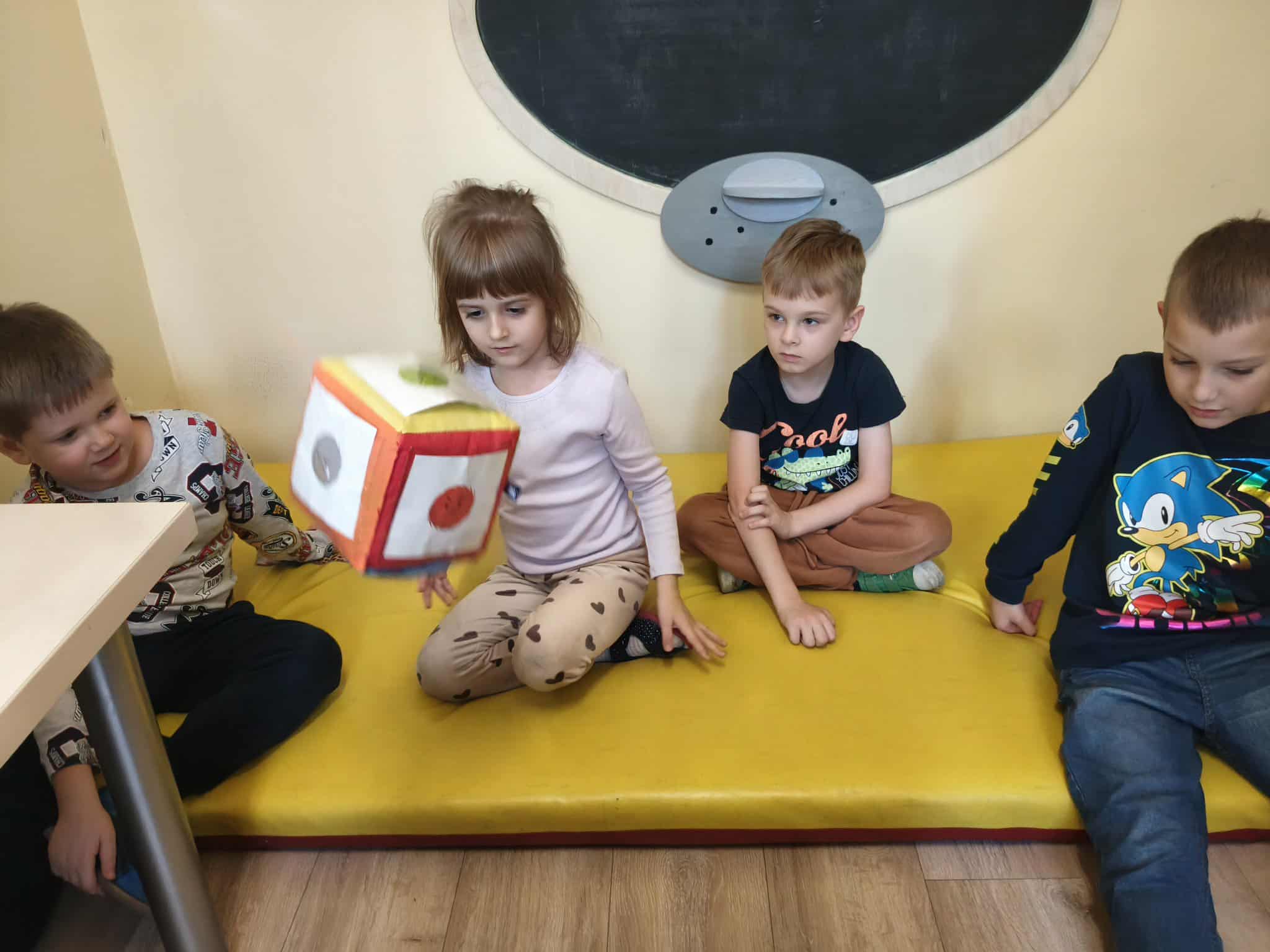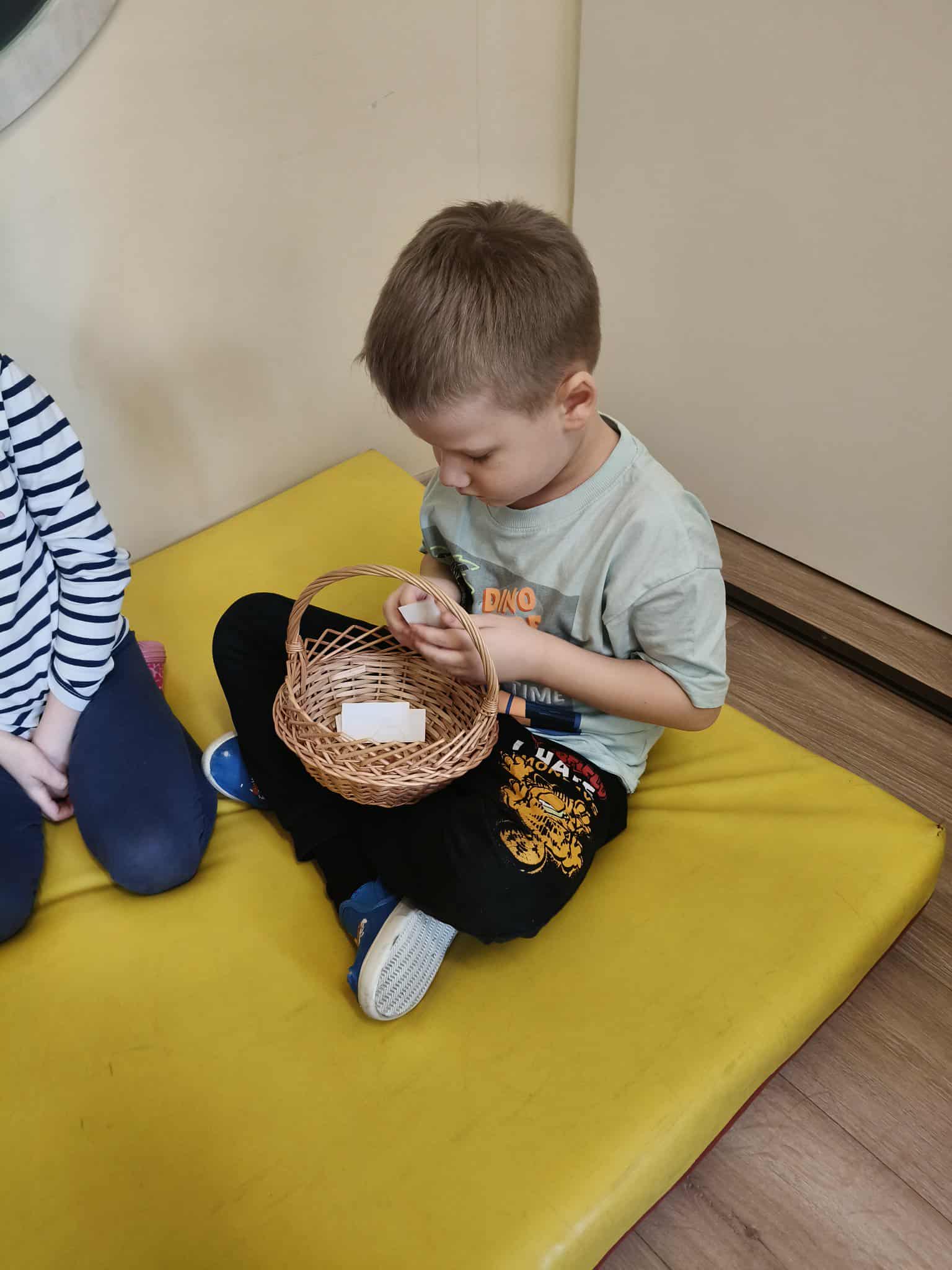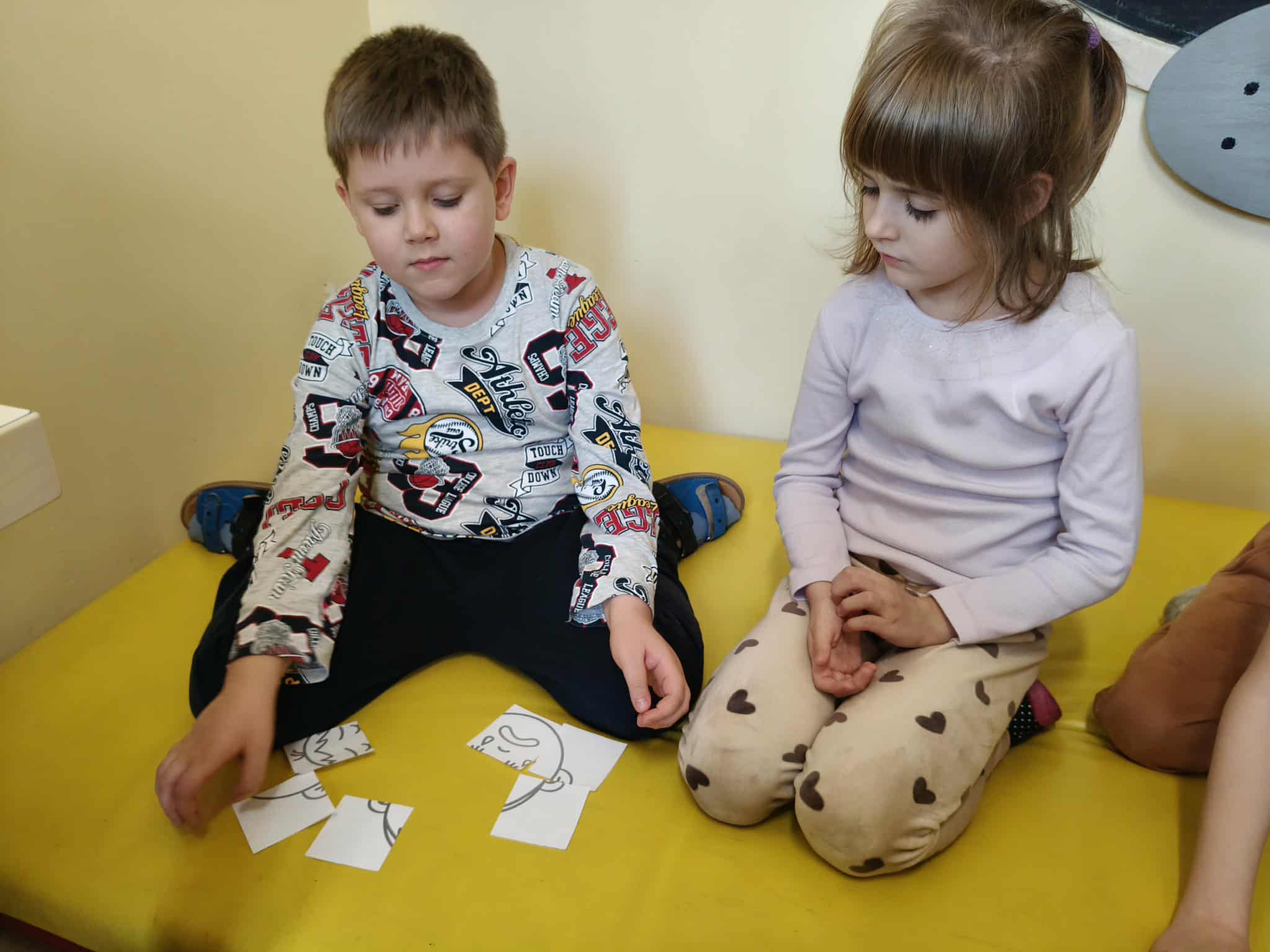 Podczas zajęć TUS dzieci poznawały emocje tj.: radość, smutek, złość, strach. Dzieci uczestniczyły w zabawach: Kalambury z bombą, Układanki emocji, Kostka z emocjami. Podczas zabaw rozwijały umiejetność współdziałania, aktywizowały procesy twórcze, ćwiczyły uwagę i percepcję słuchową.