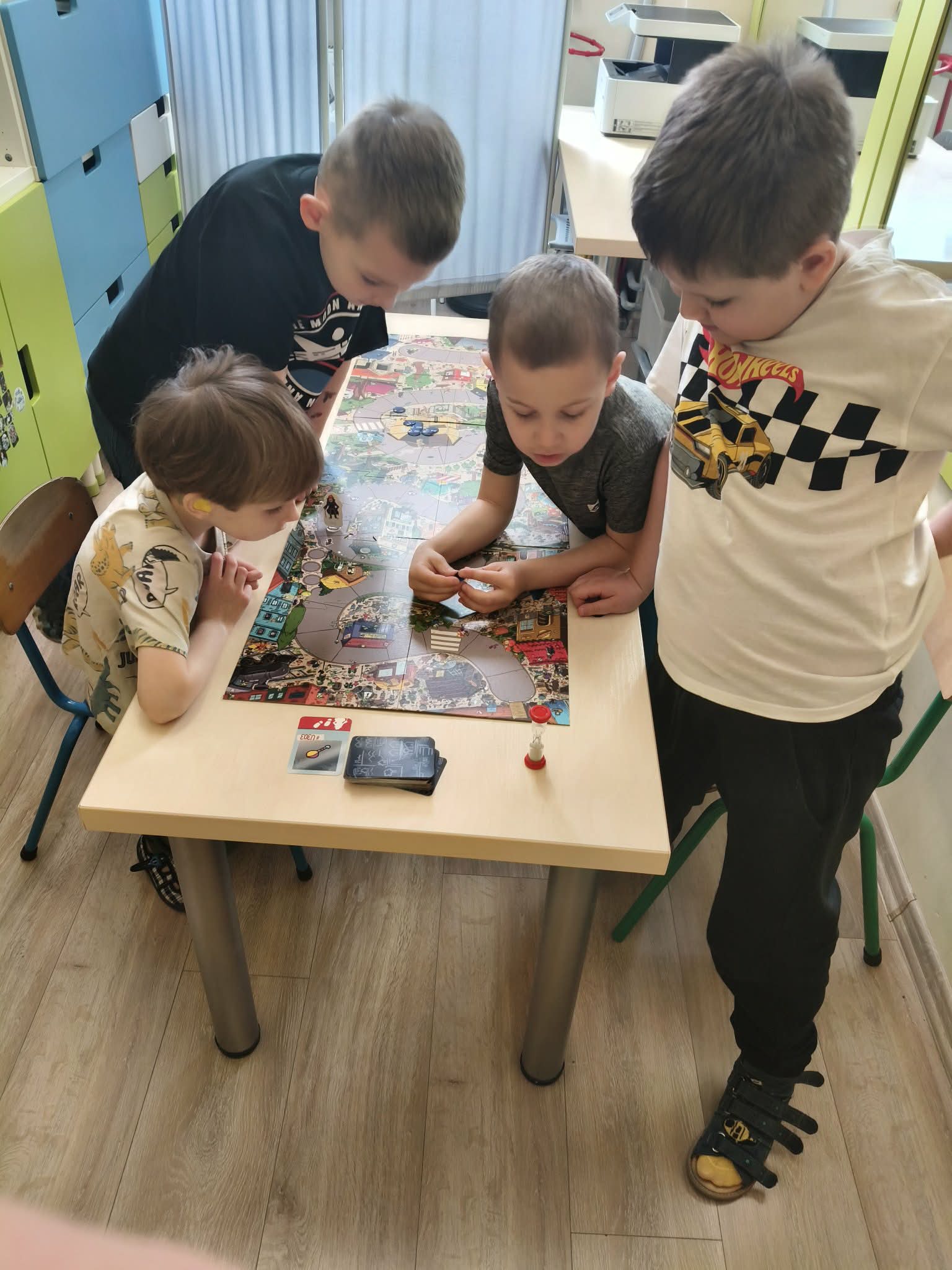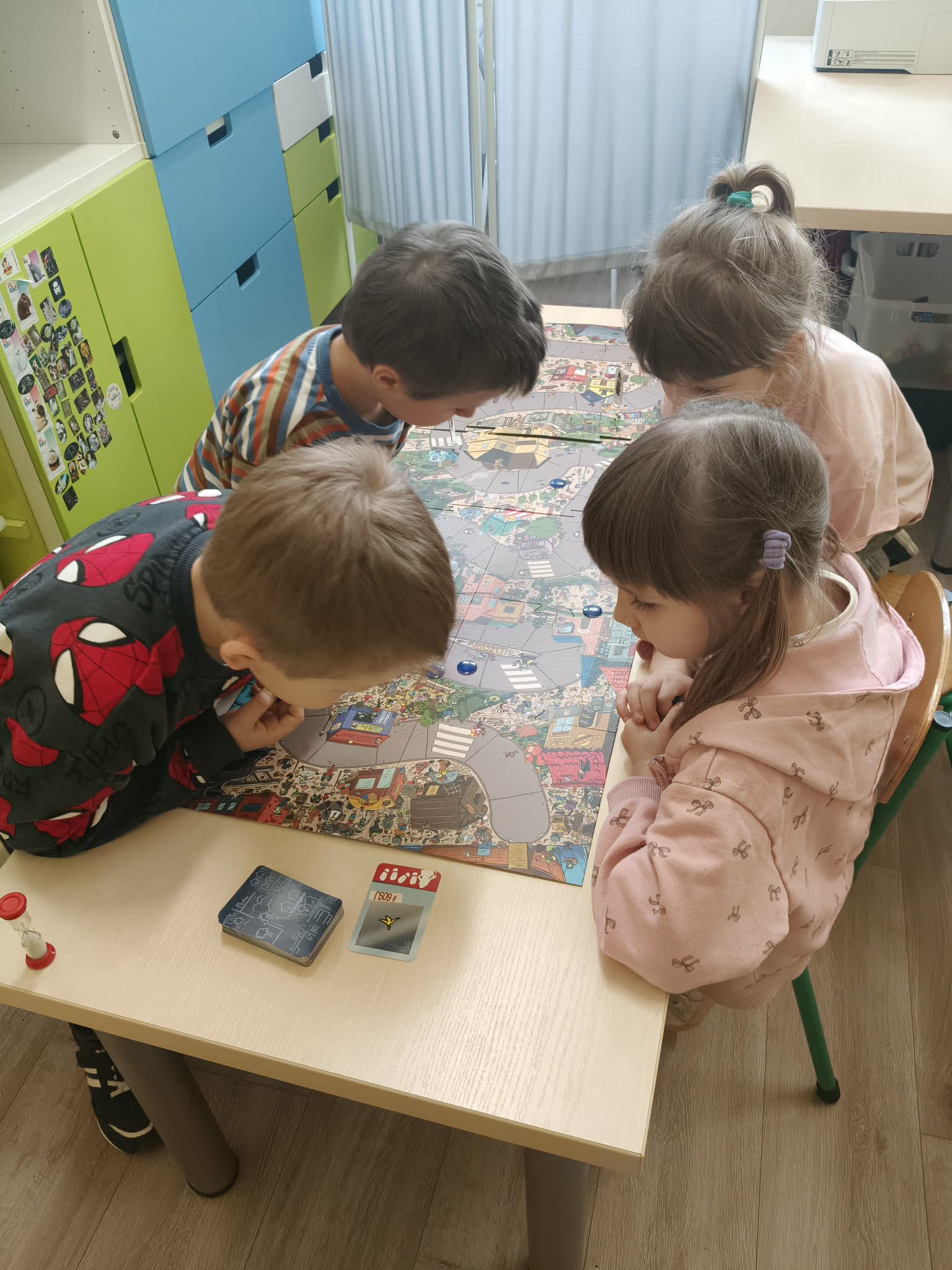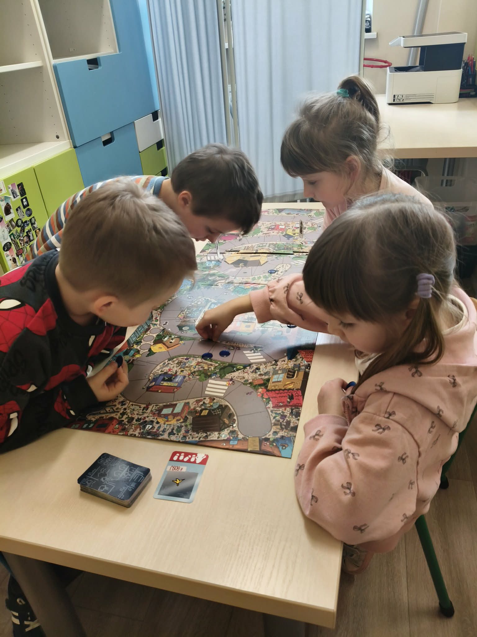 Dzieci podczas dzisiejszych zajęć TUS uczyły się współpracy, na podstawie gry z serii Rodzina Treflików " Spy Guy - miasto". Podczas gry dzieci wykazywały się nie tylko spostrzegawczością, ale również umiejetnością współpracy. Udzielały sobie wsparcia, podpowiadały, by wspólnie osiągnąć zamierzony cel gry.