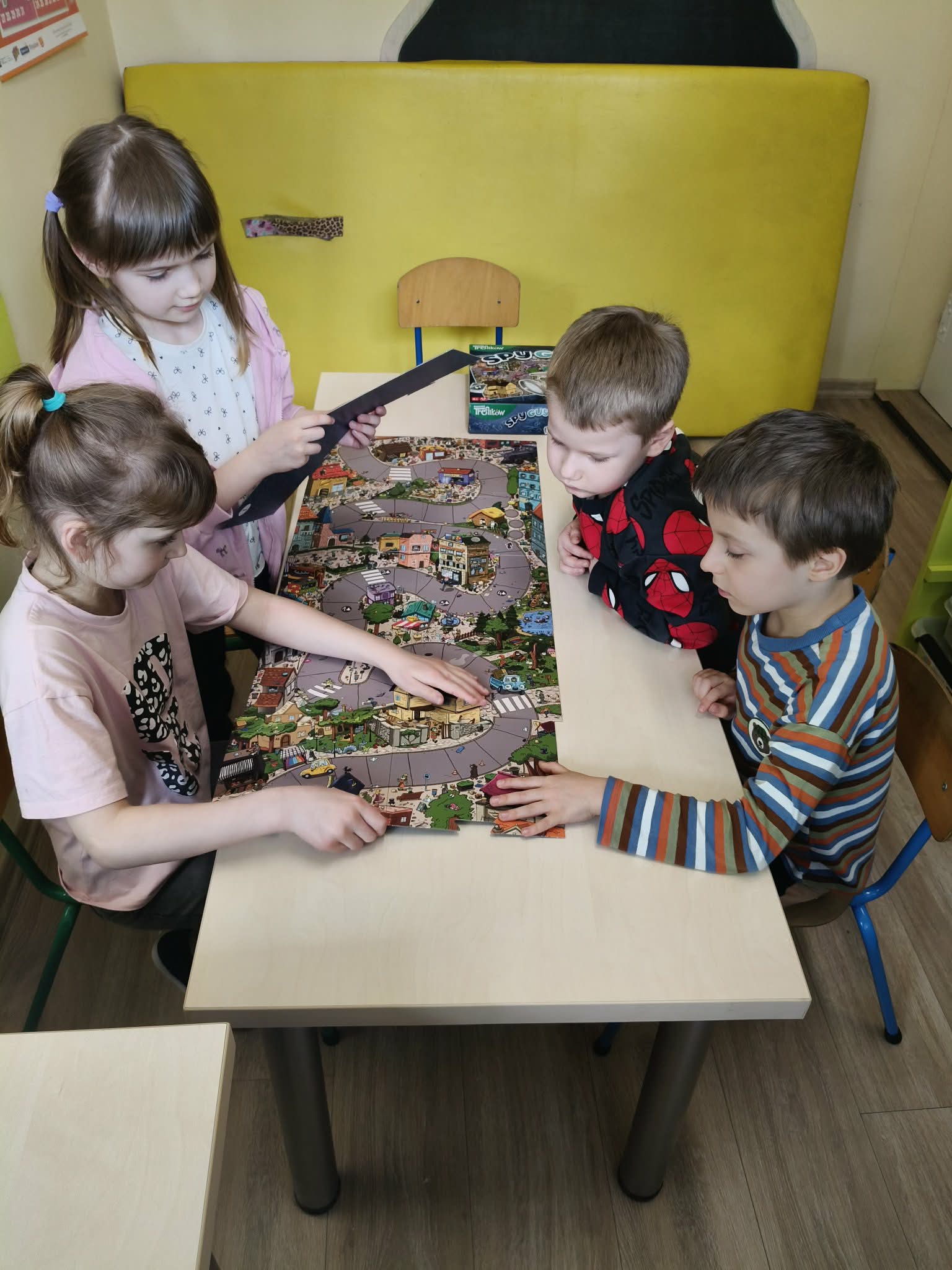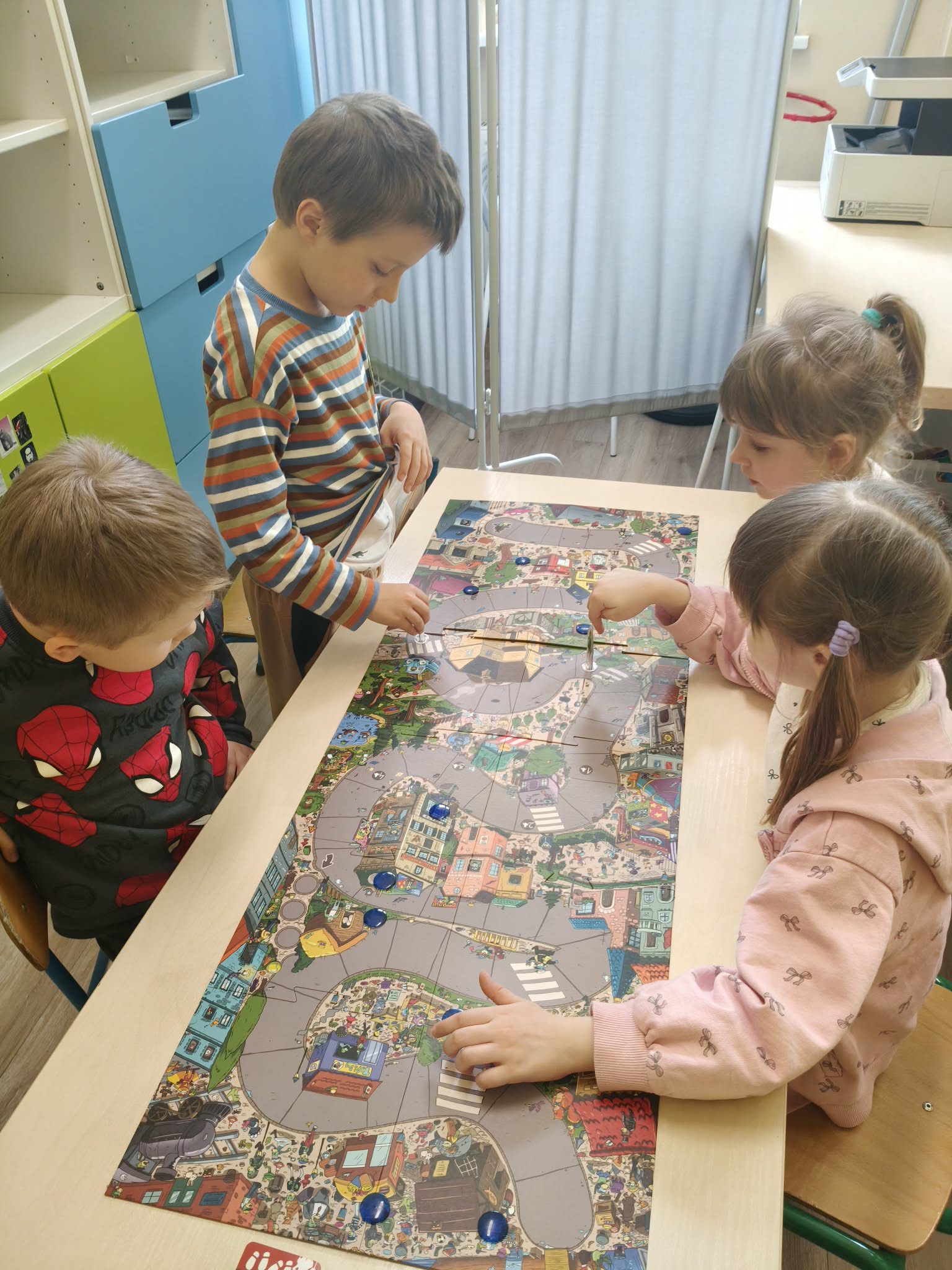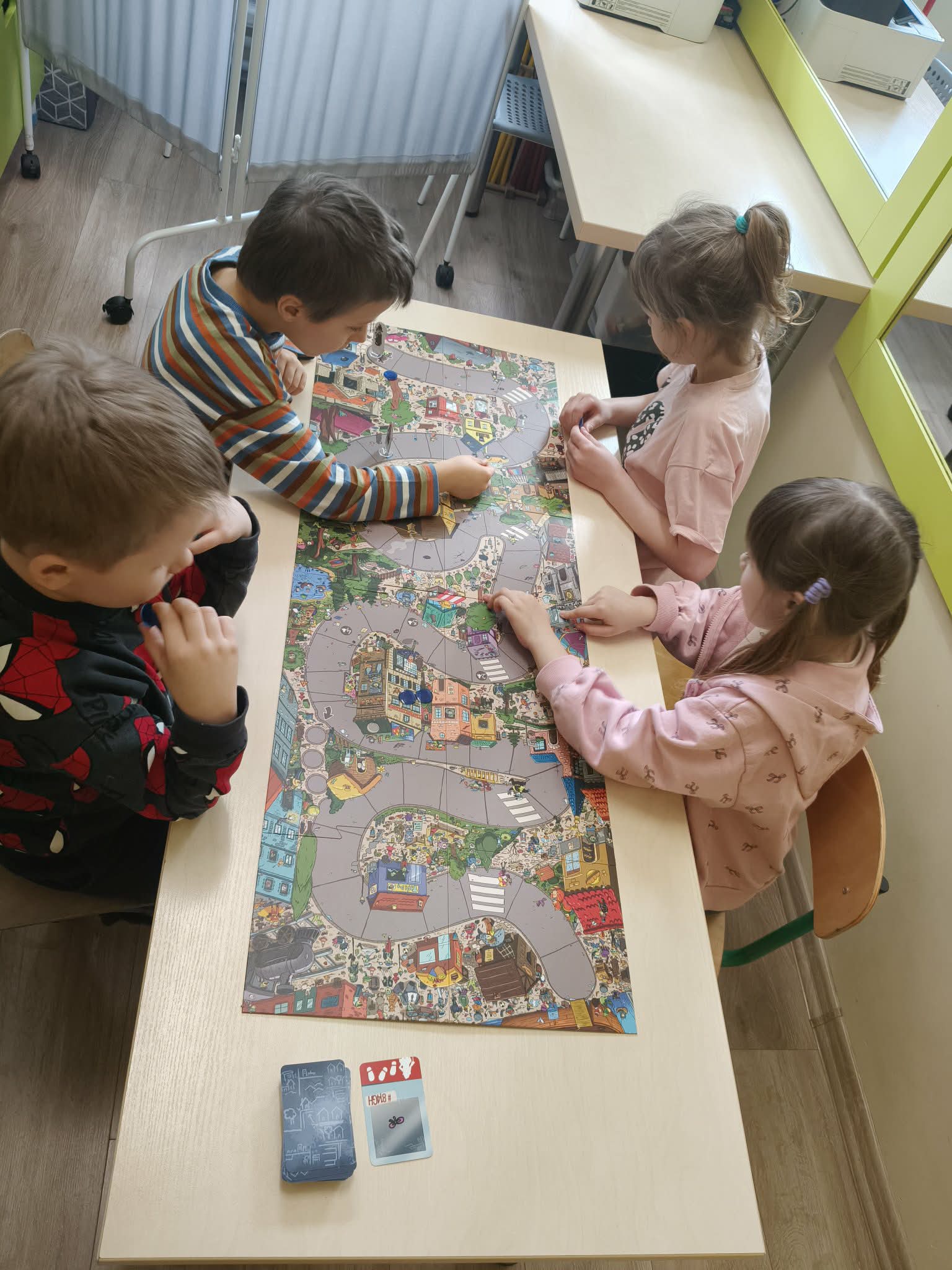 Dzieci podczas dzisiejszych zajęć TUS uczyły się współpracy, na podstawie gry z serii Rodzina Treflików " Spy Guy - miasto". Podczas gry dzieci wykazywały się nie tylko spostrzegawczością, ale również umiejetnością współpracy. Udzielały sobie wsparcia, podpowiadały, by wspólnie osiągnąć zamierzony cel gry.