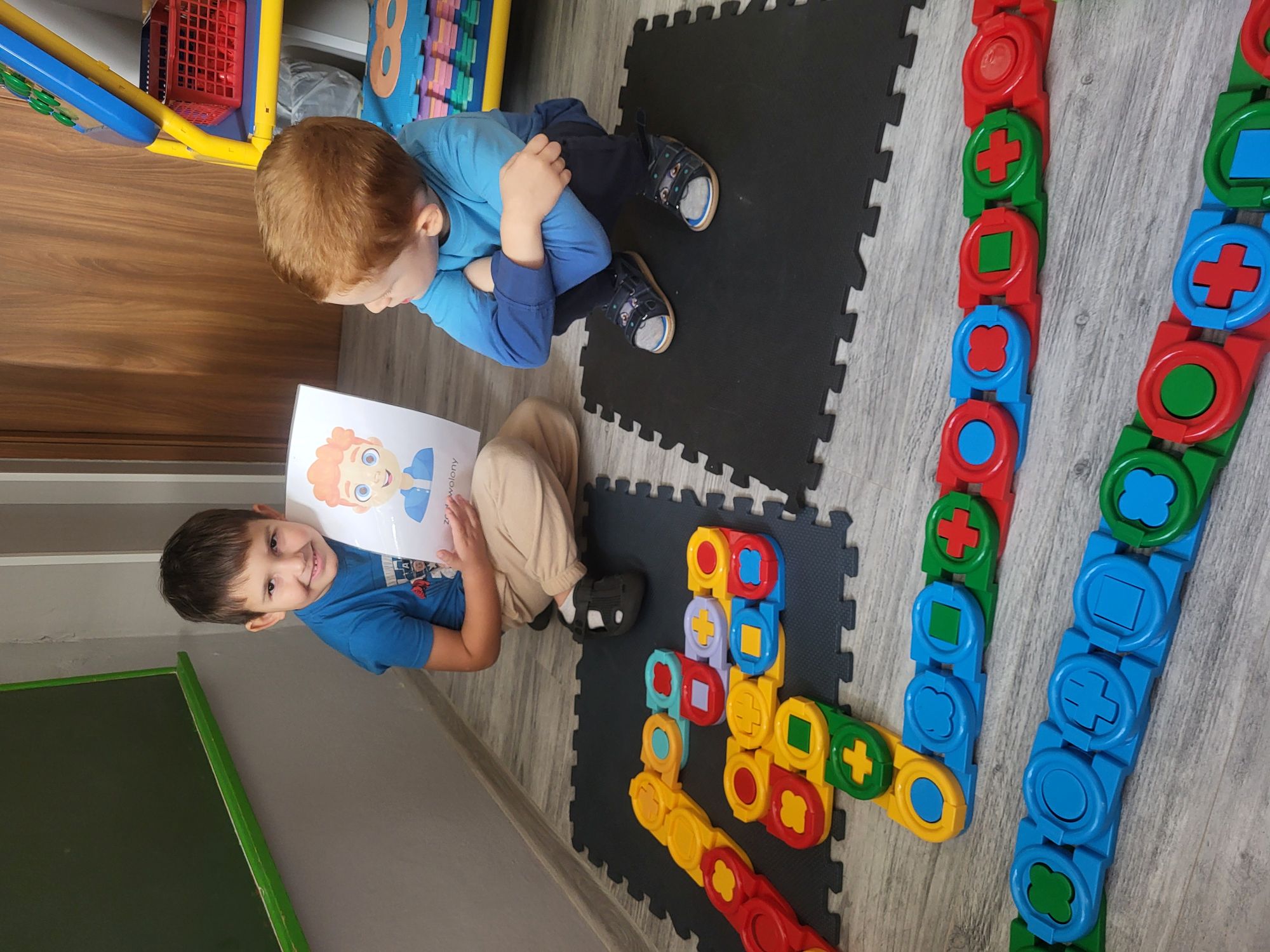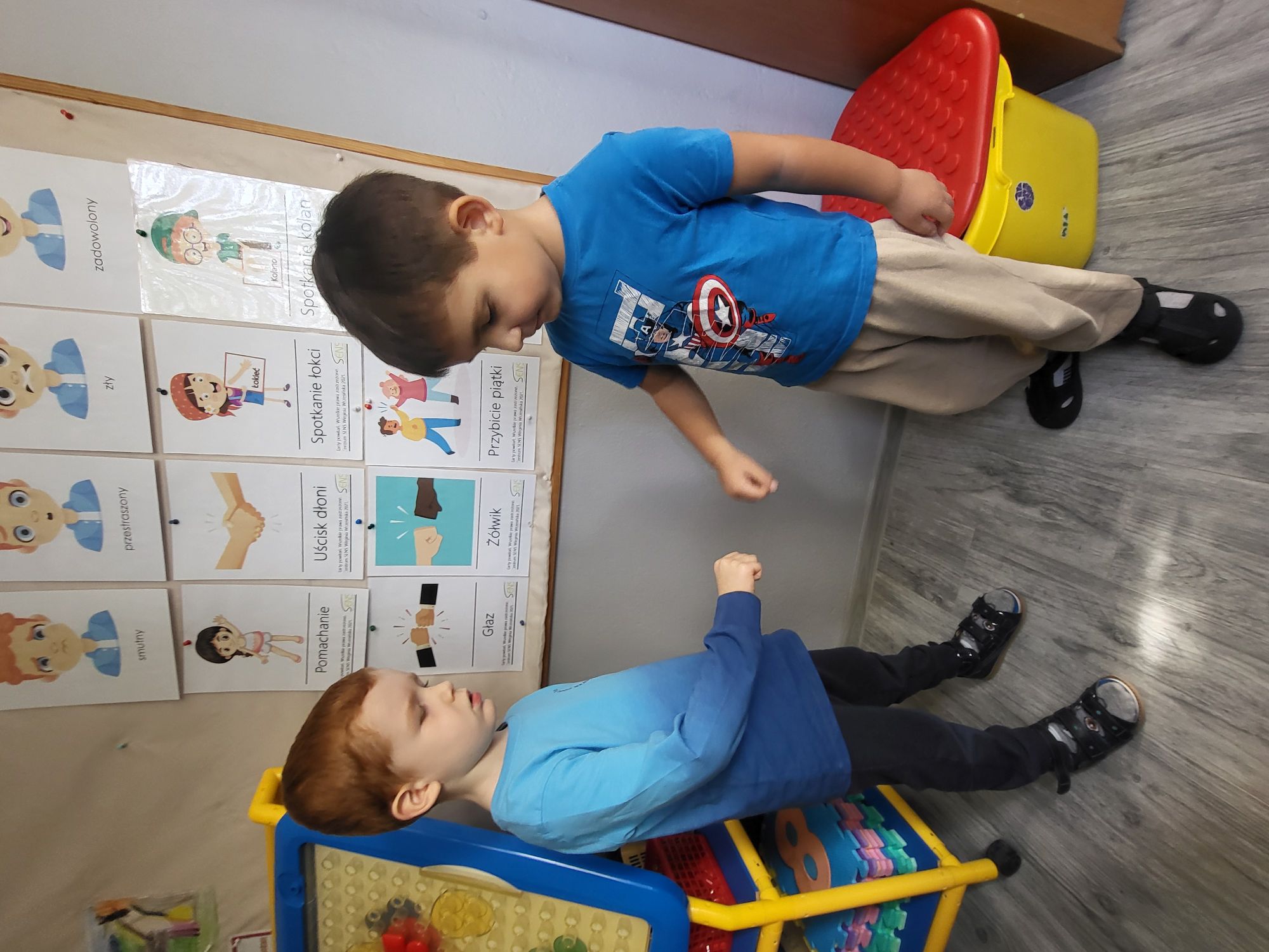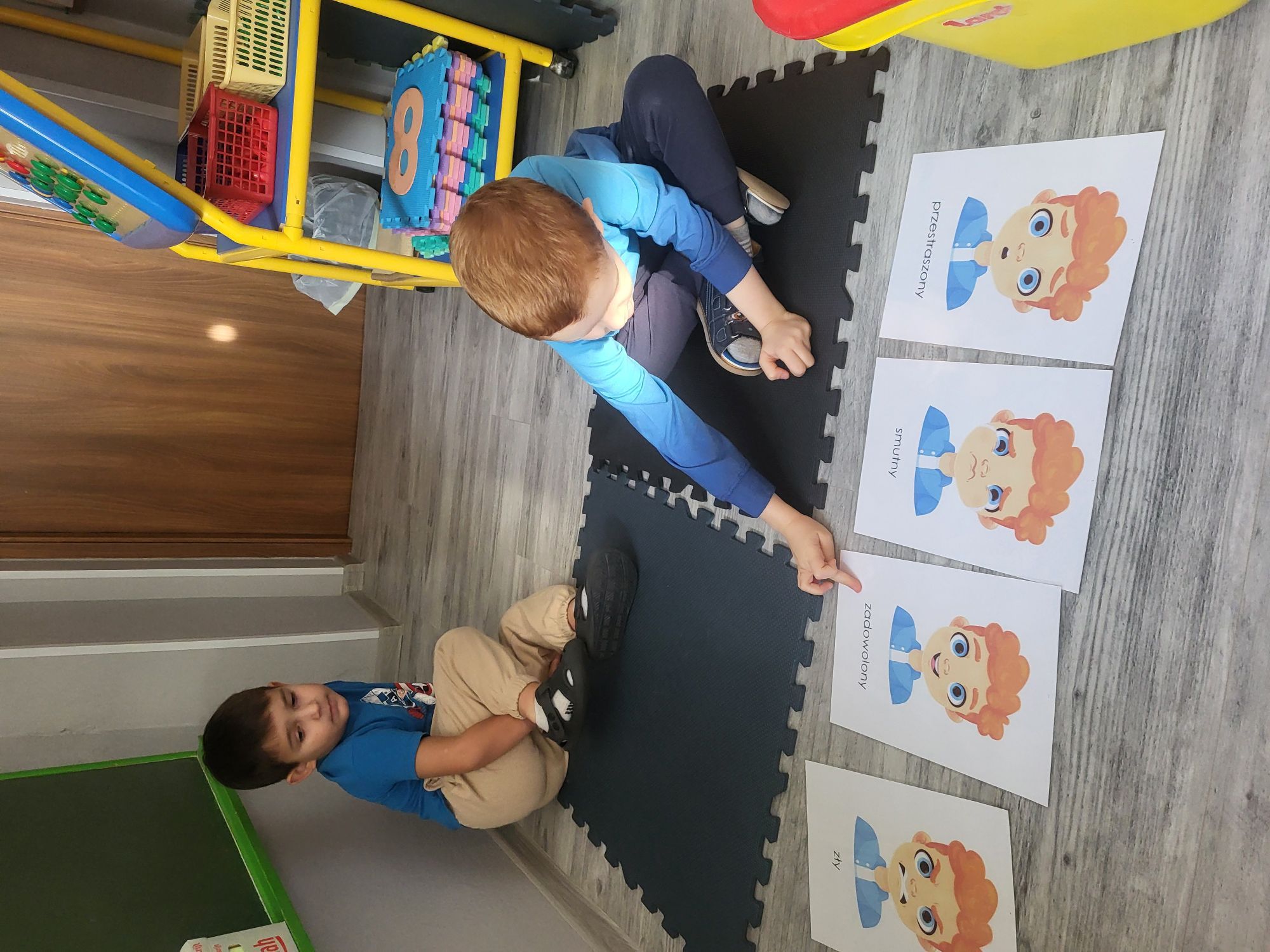 Chłopcy na dzisiejszych zajęciach rozpoznawały, wskazywały i nazywały odpowiednie emocje. Określały swoje samopoczucie. Wspólnie układali domino z kształtami, pomagając sobie nawzajem oraz używając zwrotów grzecznościowych. Na zakończenie zaproponowali sposób na pożegnanie.