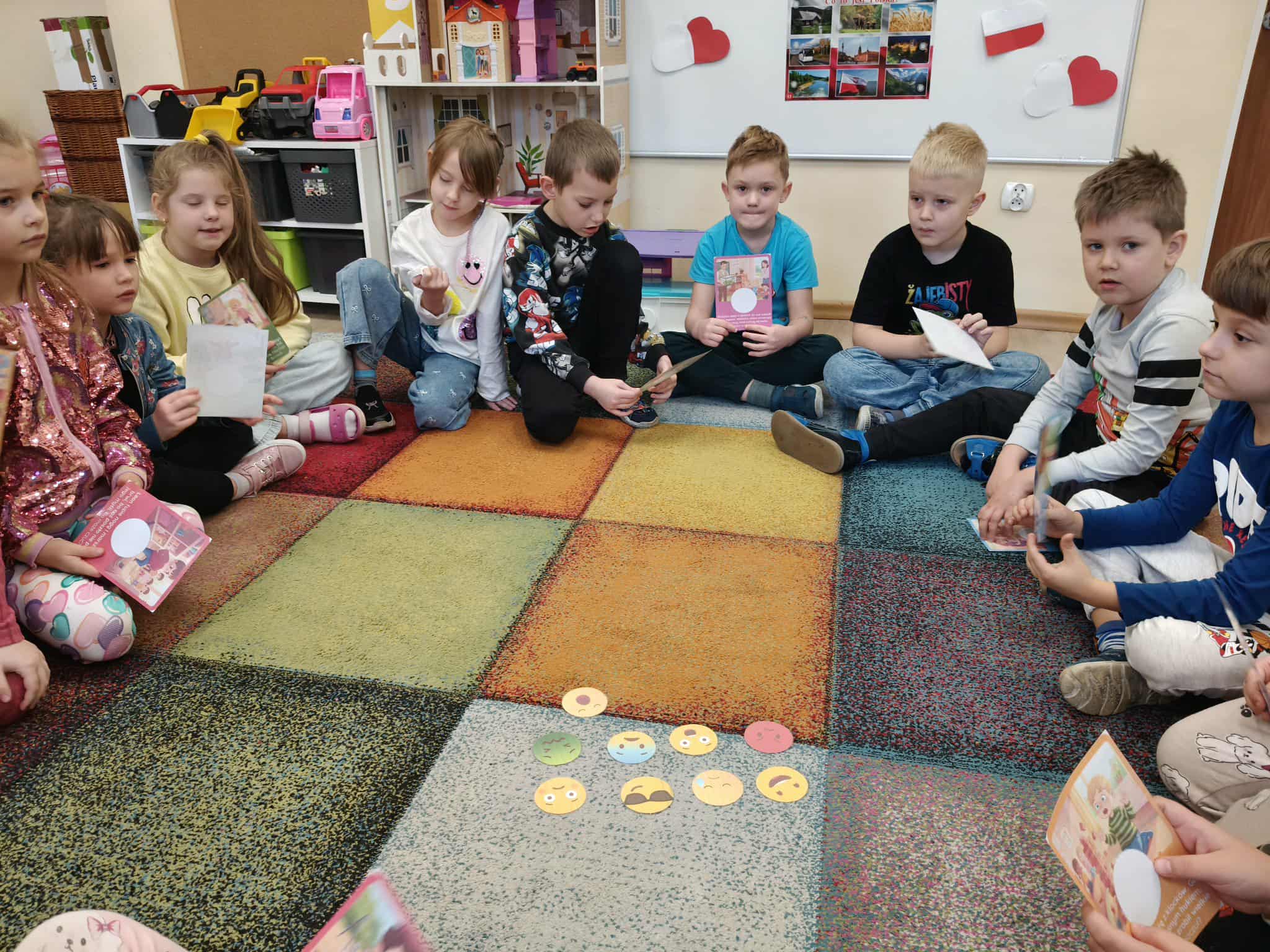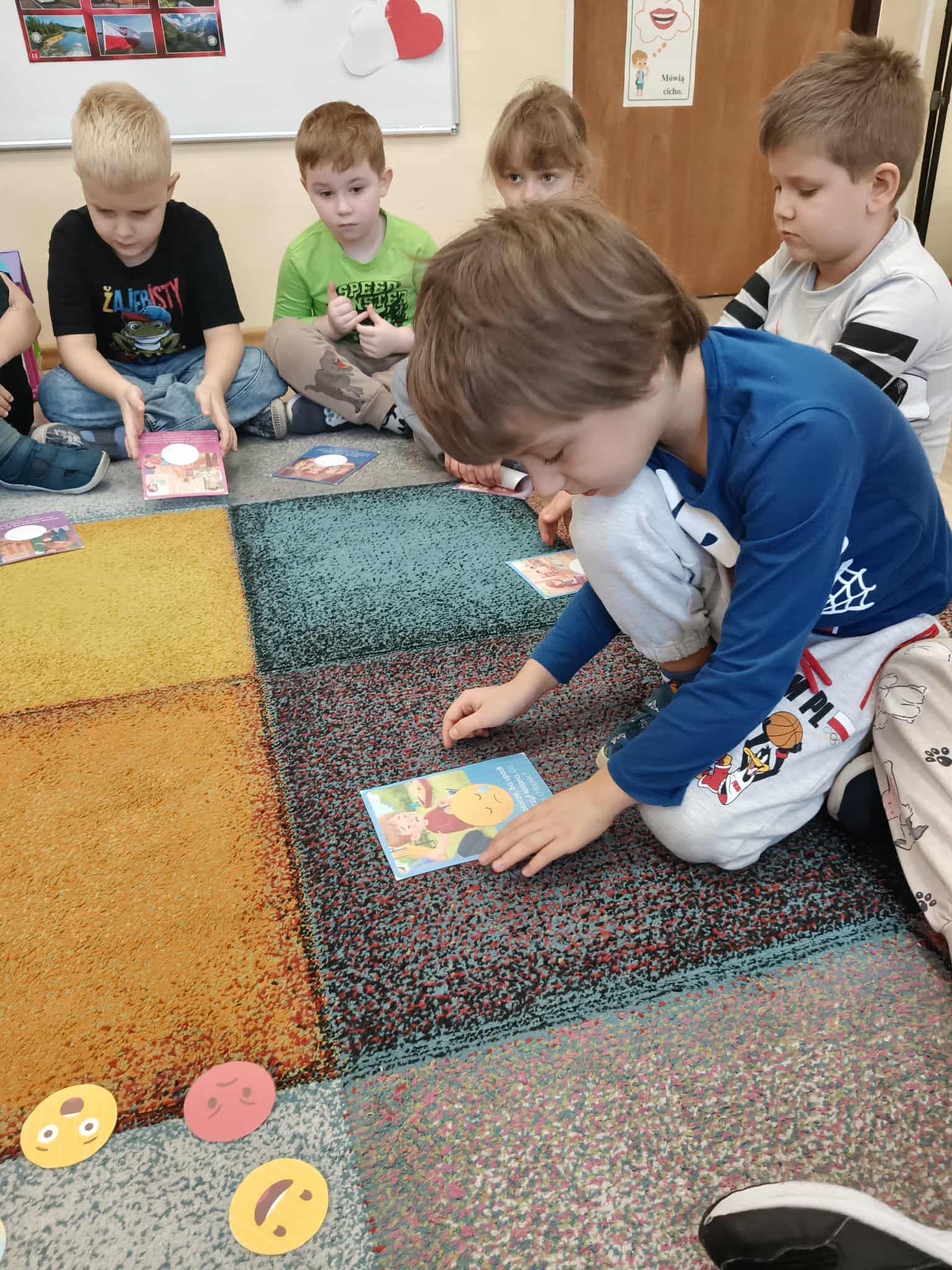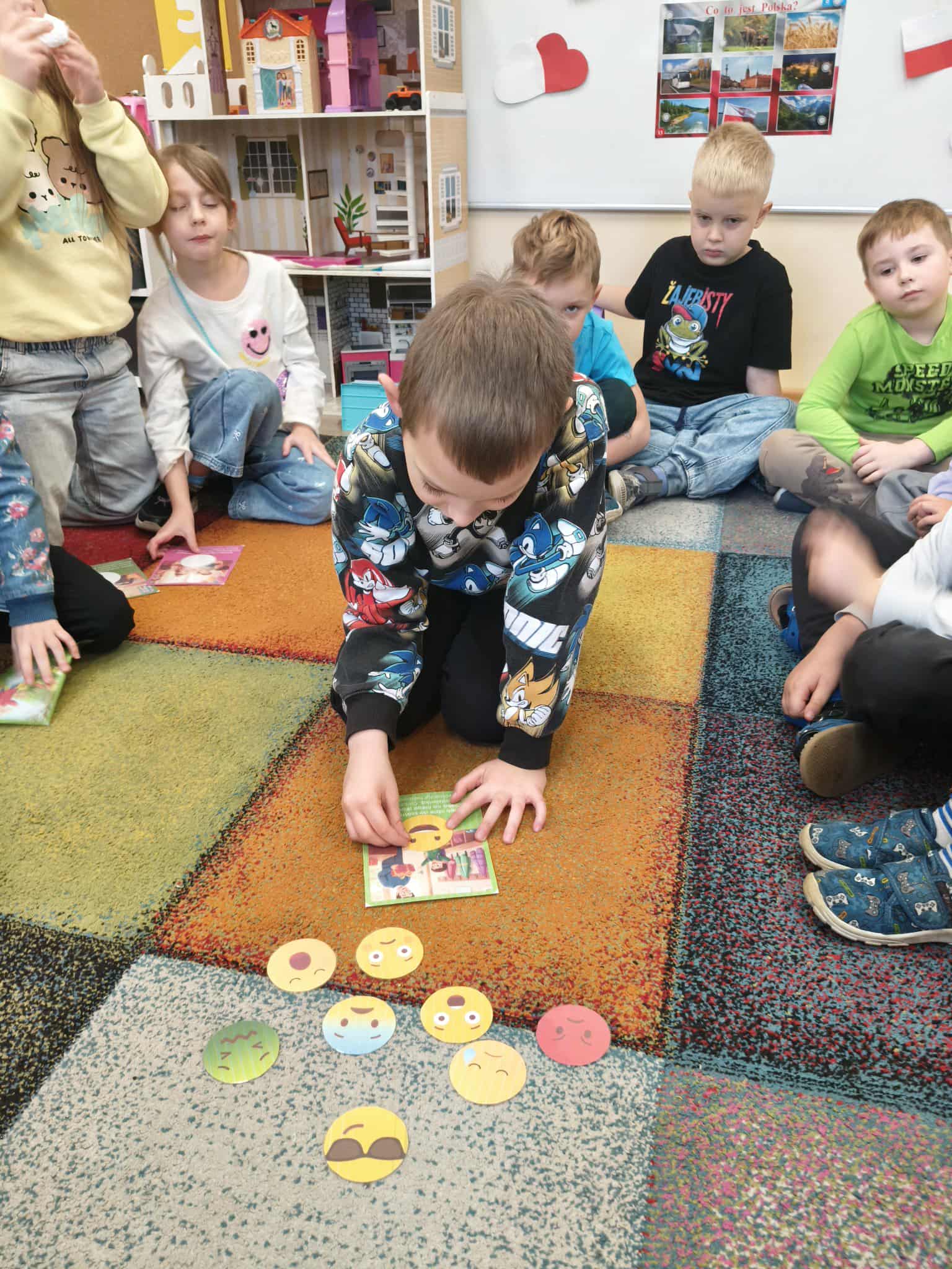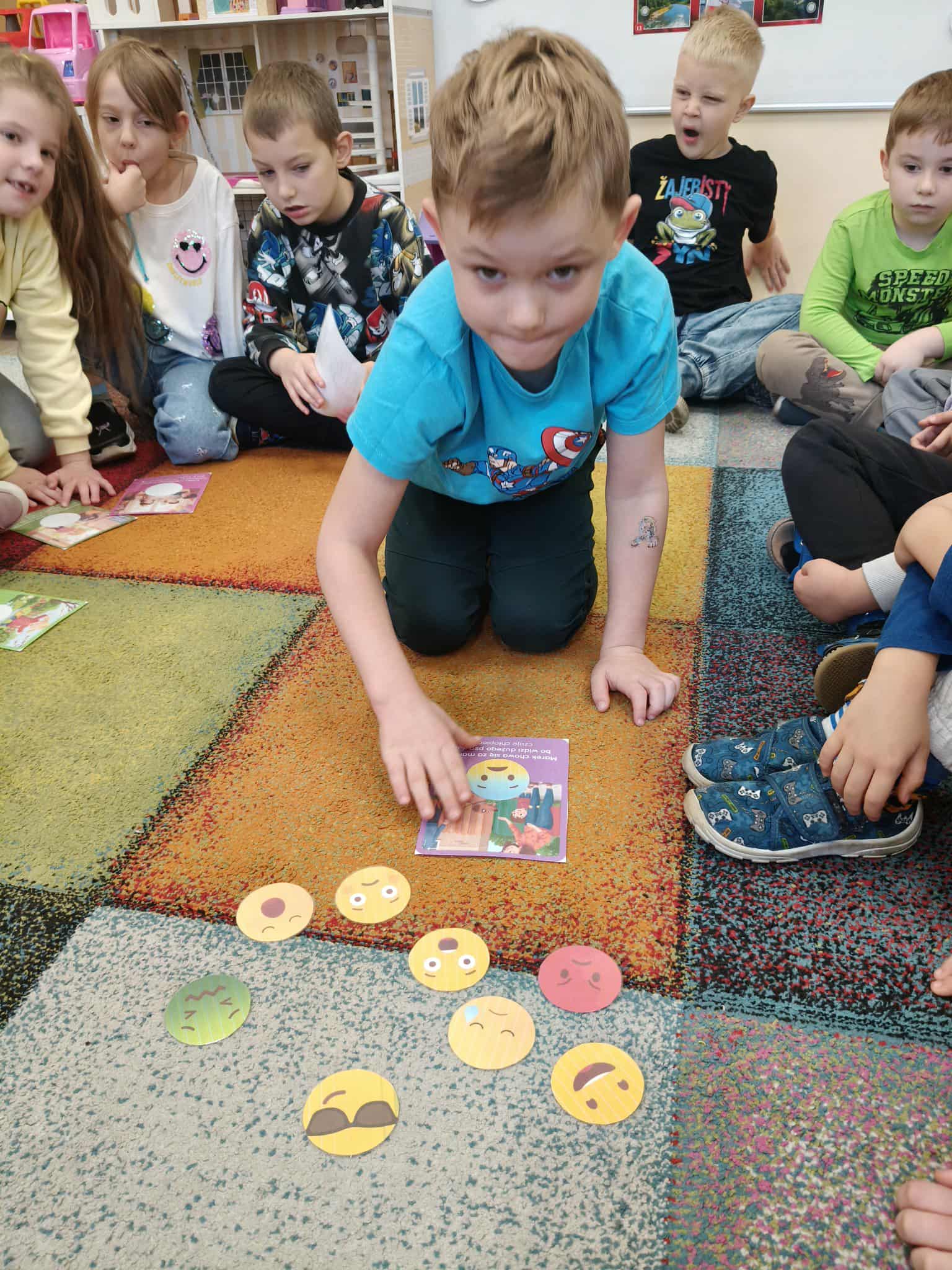 Dzieci podczas zajęć, ogladały i nazywały emocje na prezentowanych żetonach. Następnie wybierały obrazki z sytuacjami społecznymi. Starały się opisać , to co widzą na obrazku. Wybierały pasującą do obrazka emocję.